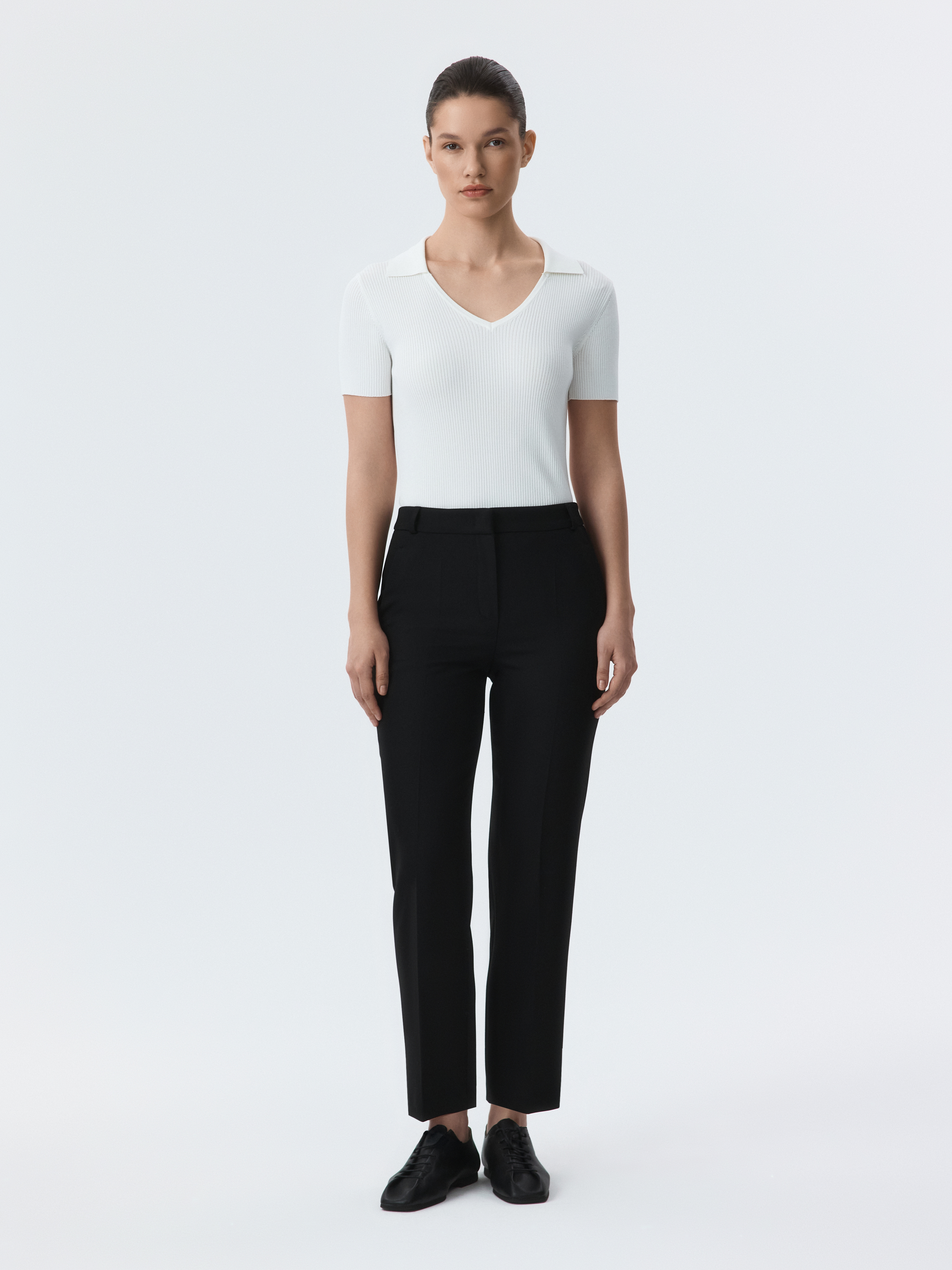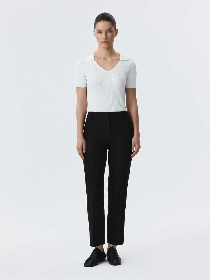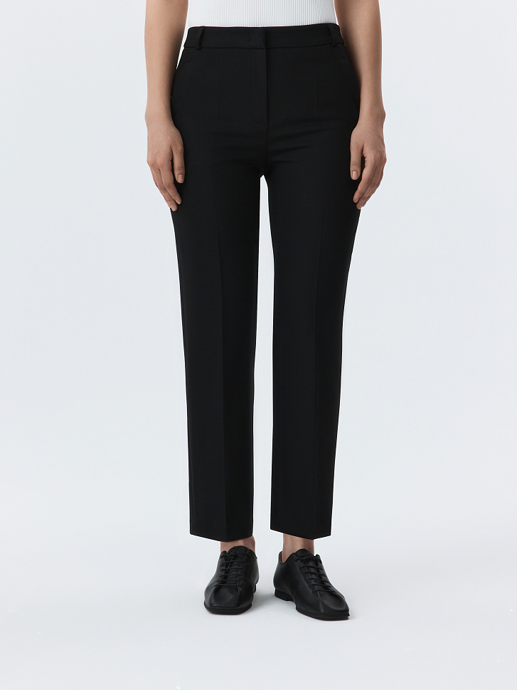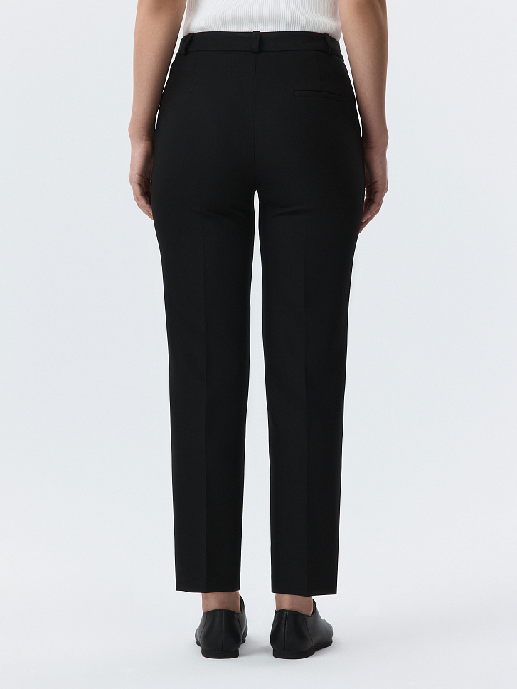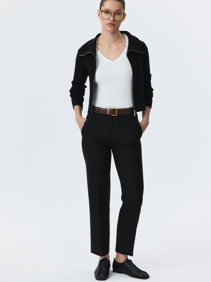 Брюки зауженного кроя станут базой для офиса и за его пределами. Фактура плотной костюмной ткани обладает формоустойчивостью, а способность слегка тянуться благодаря эластичным волокнам создаст комфортную посадку в бедрах.