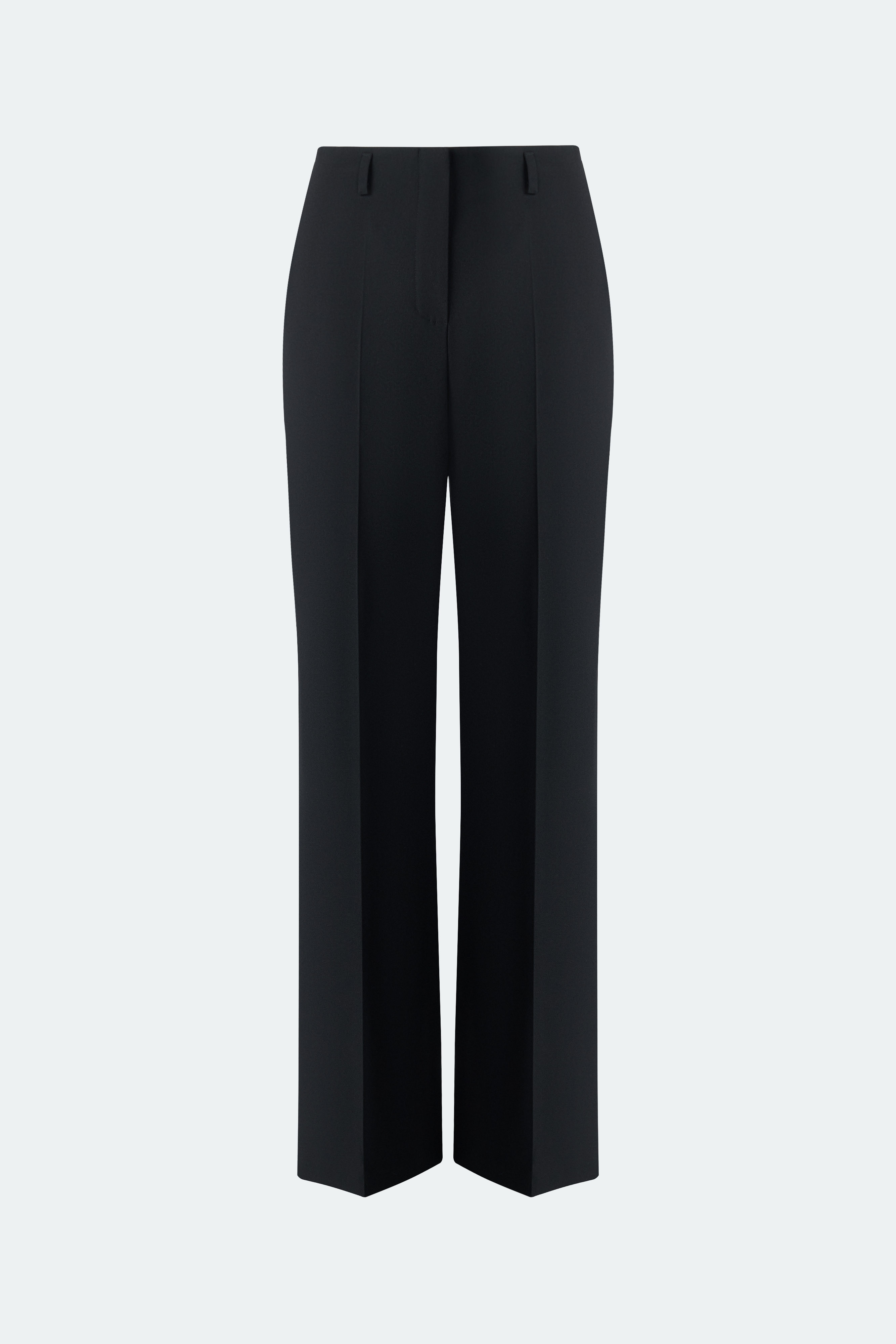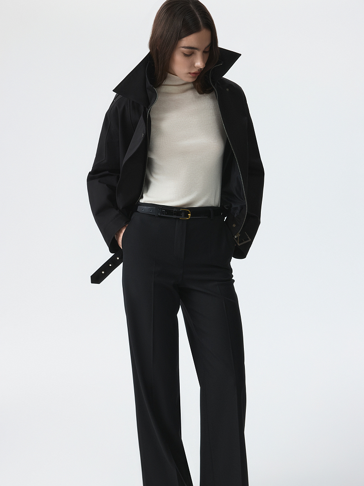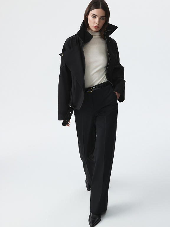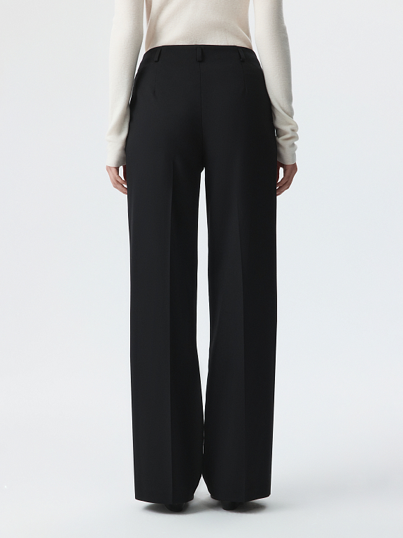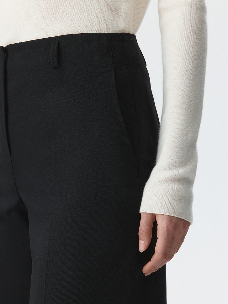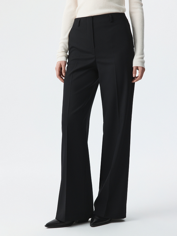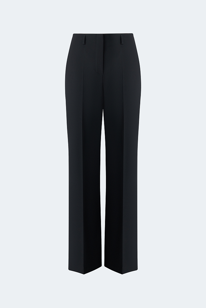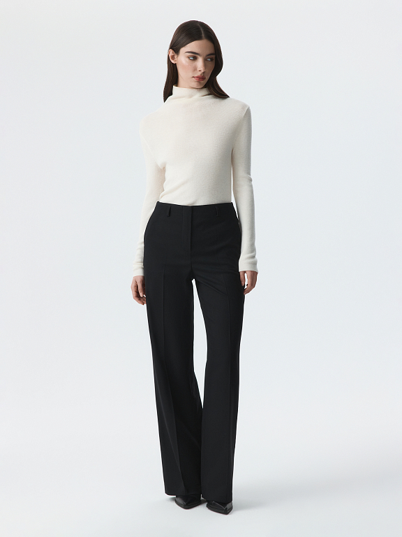 Прямые классические брюки – элегантная основа любого гардероба. В меру плотный костюмный текстиль с содержанием шерсти не тянется и хорошо держит форму заутюженных стрелок. Модель без пояса визуально стройнит талию, делая фигуру более изящной.