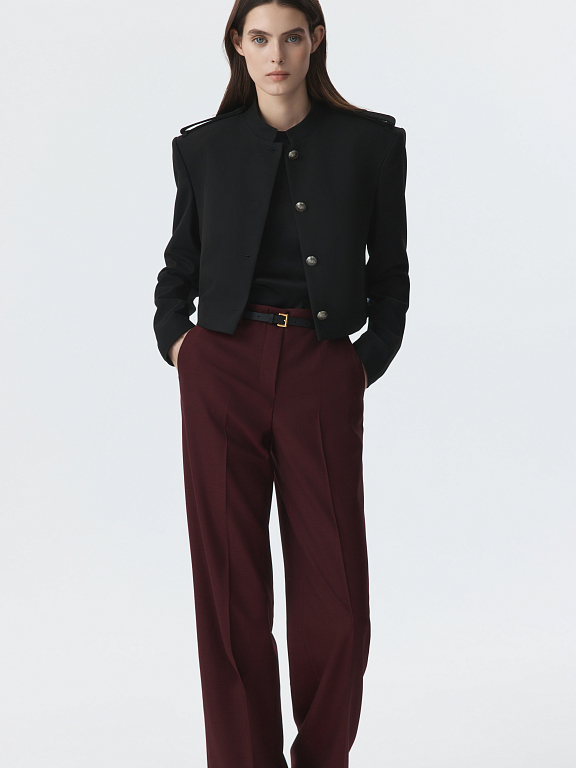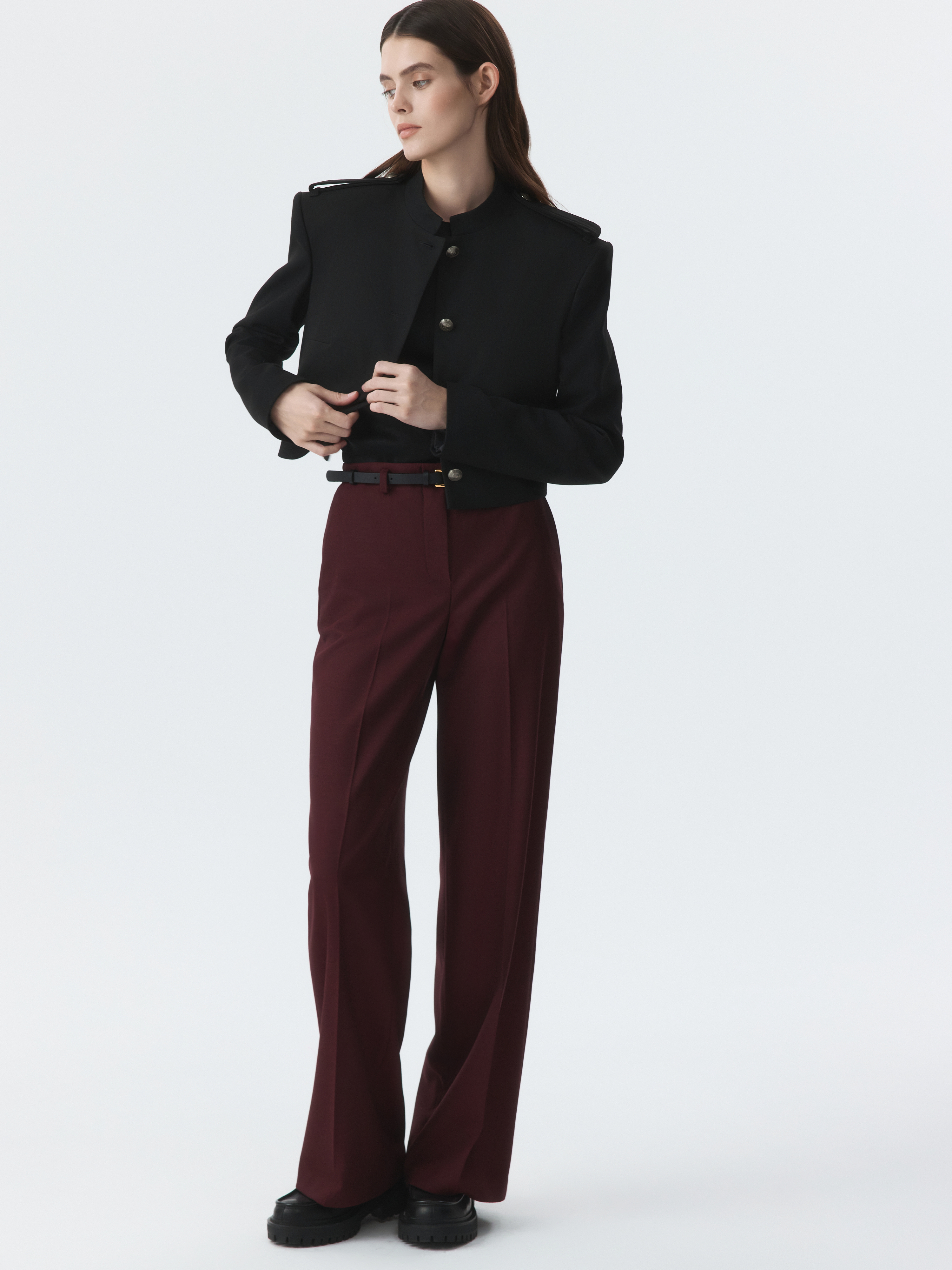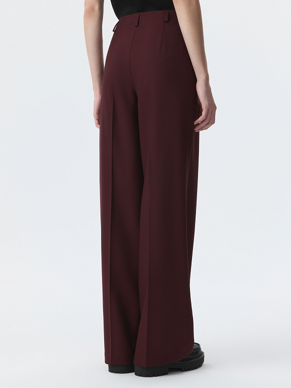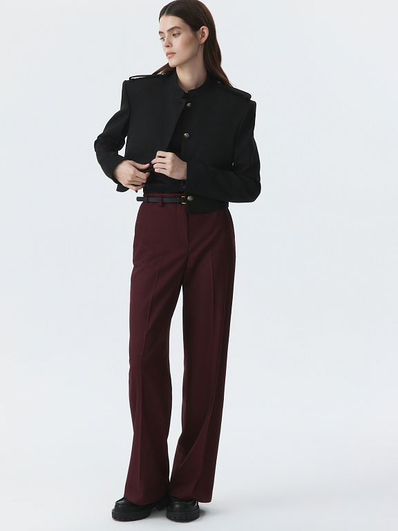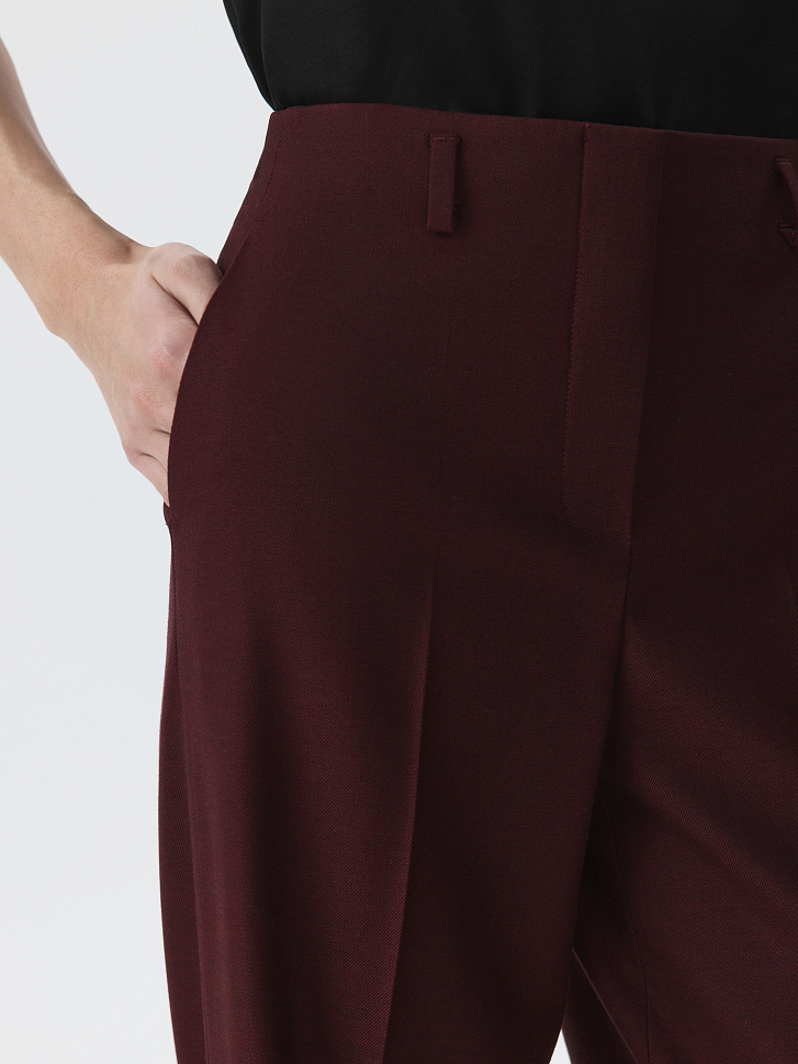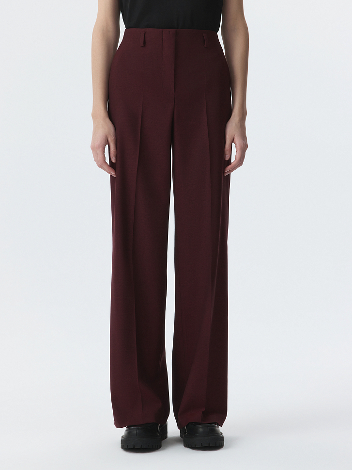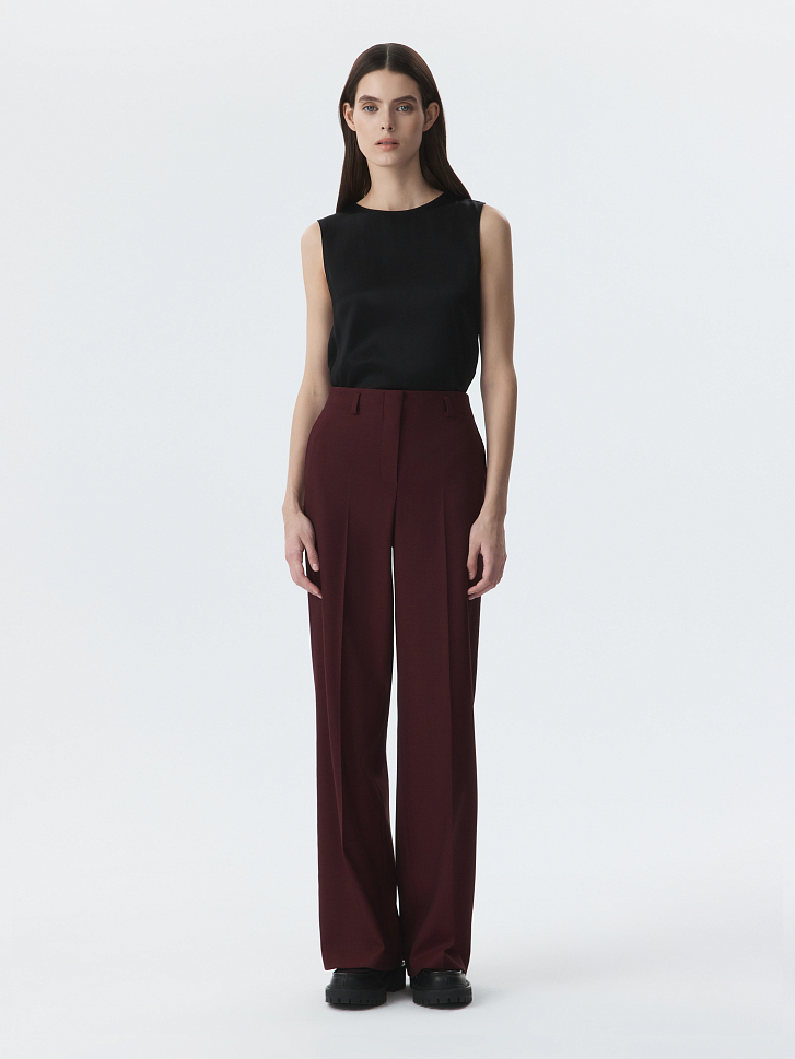 Прямые классические брюки – элегантная основа любого гардероба. В меру плотный костюмный текстиль с содержанием шерсти не тянется и хорошо держит форму заутюженных стрелок. Модель без пояса визуально стройнит талию, делая фигуру более изящной.