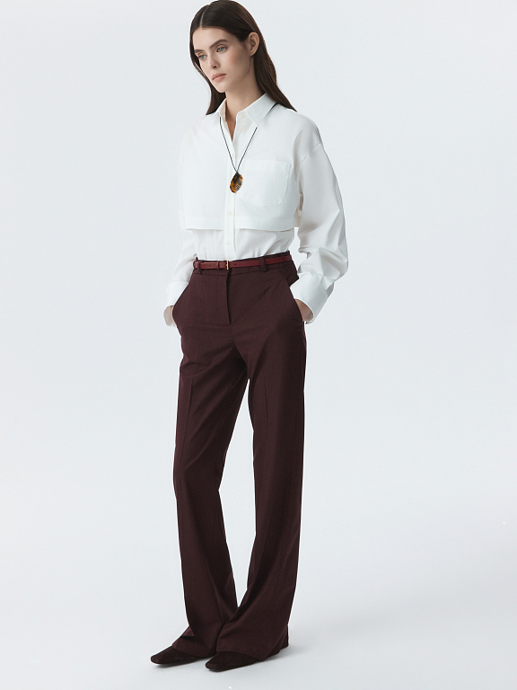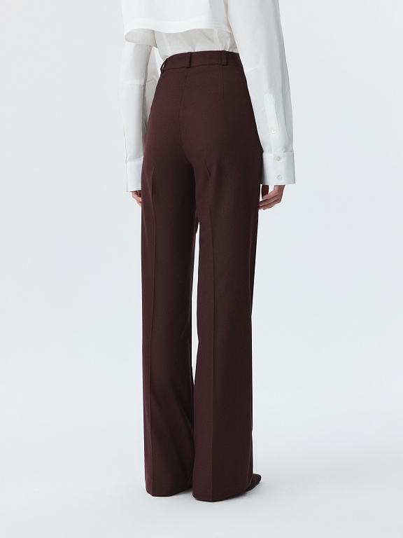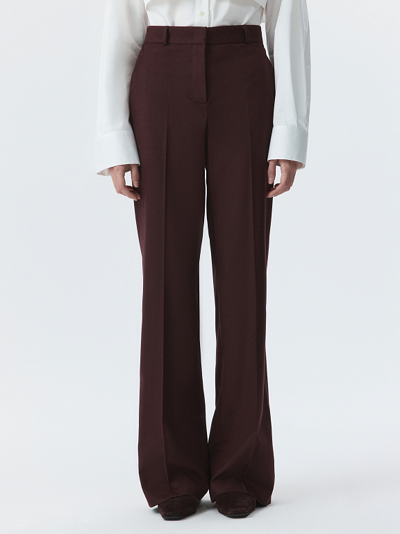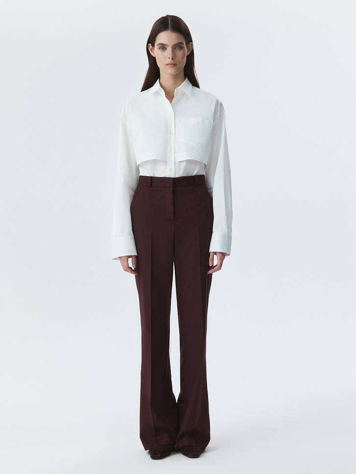 Классические брюки расклешенного кроя – свобода движения и безупречный силуэт. Тонкая фланель мягко прилегает и комфортно сидит по фигуре. Готовый образ для офиса получится с аналогичным жакетом.