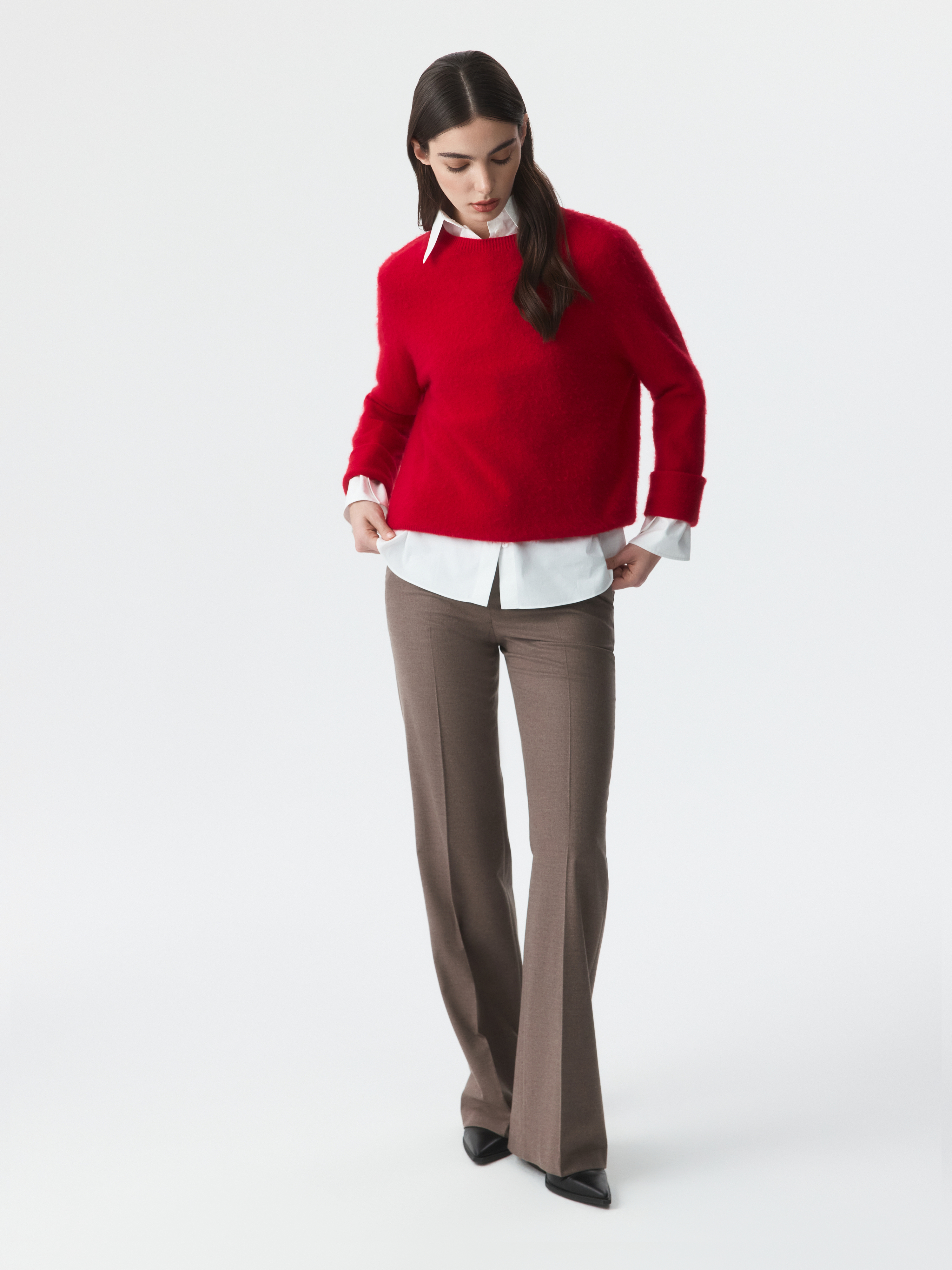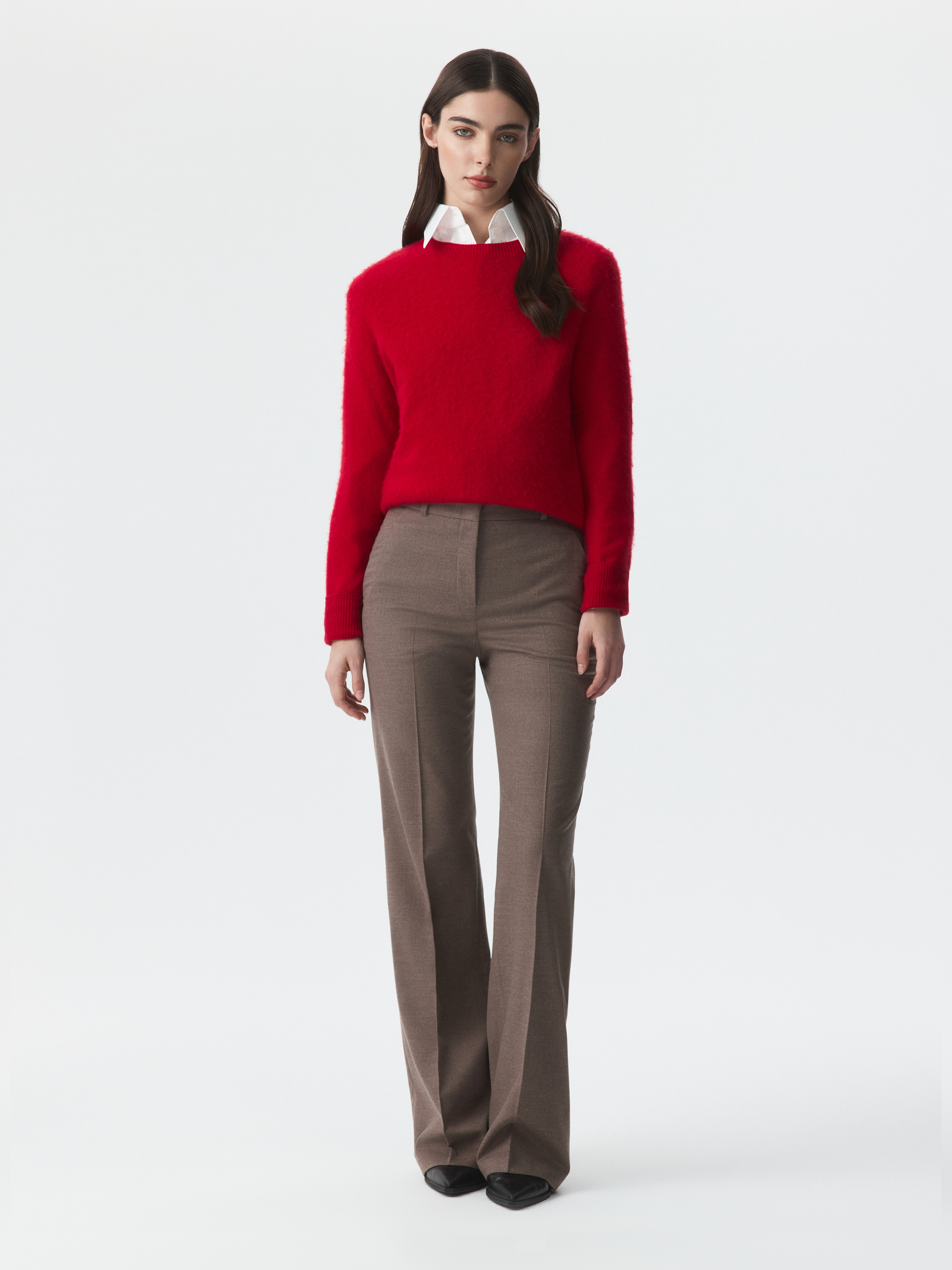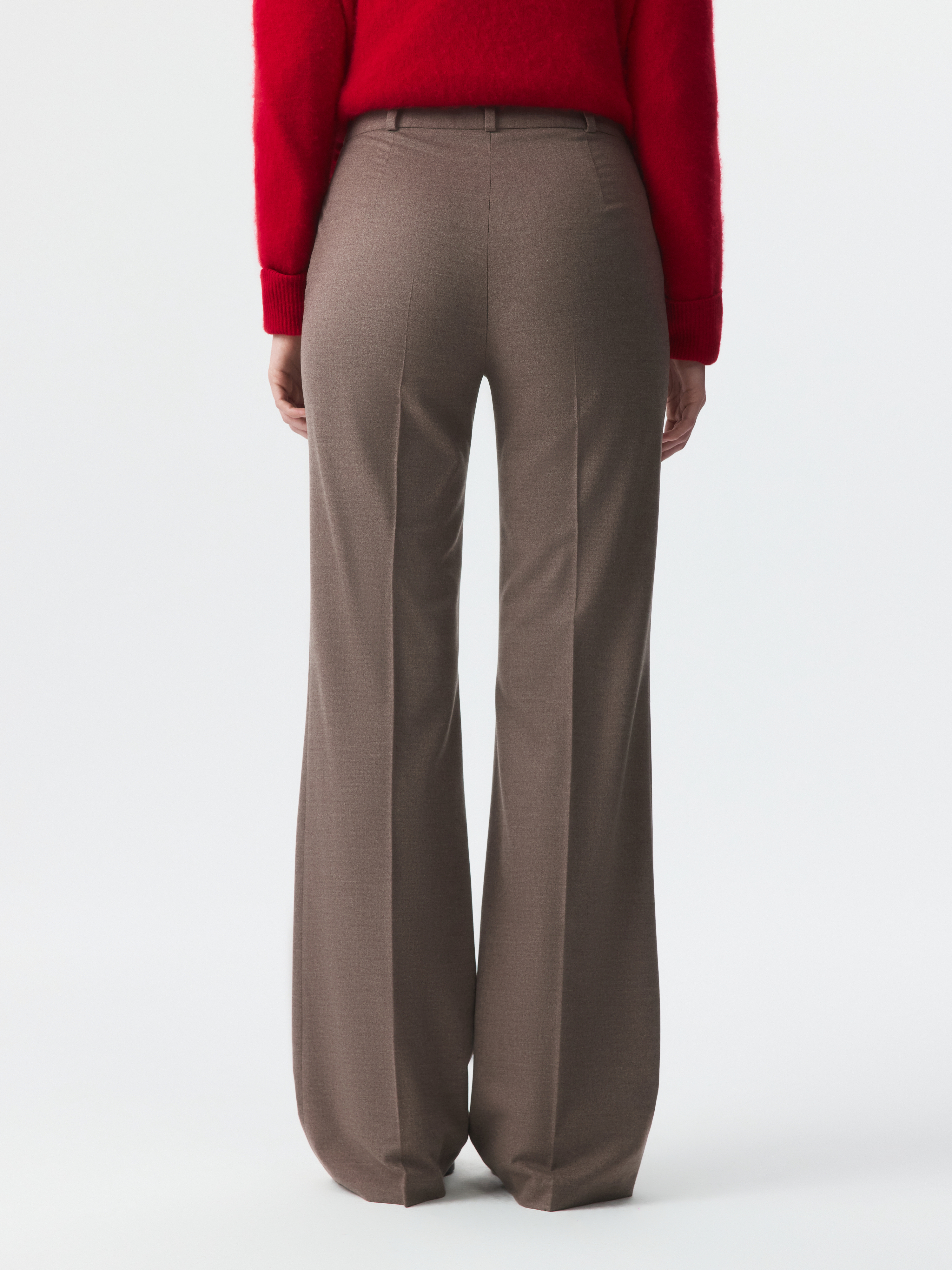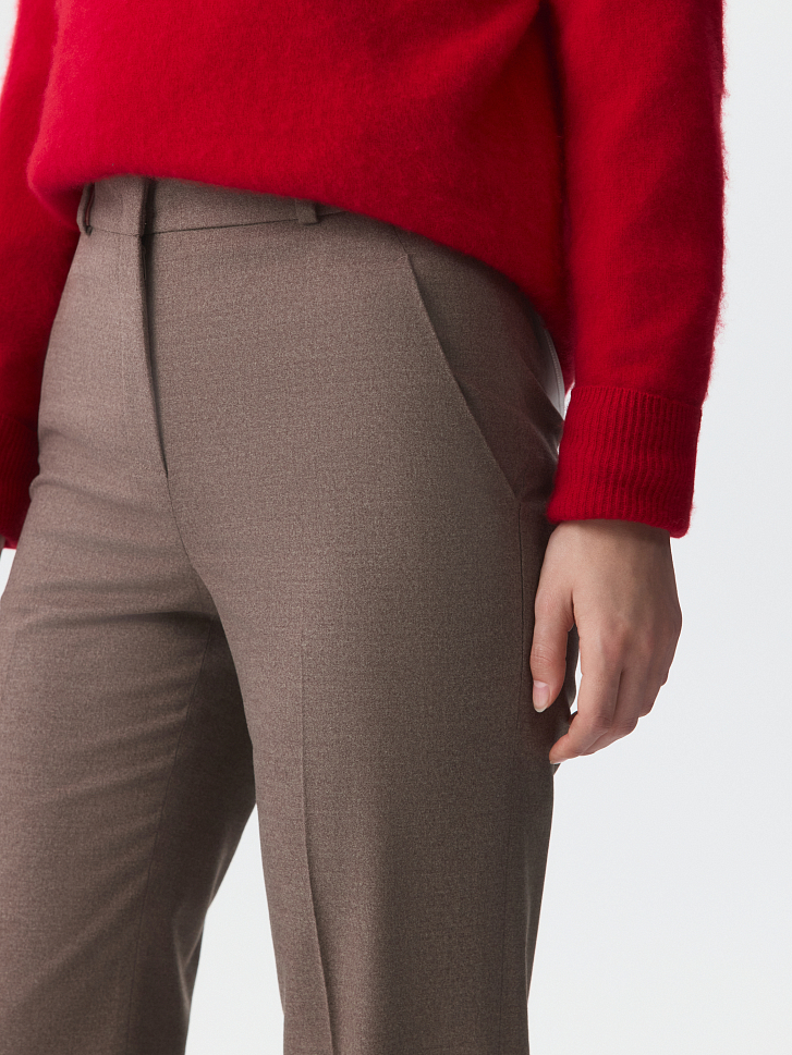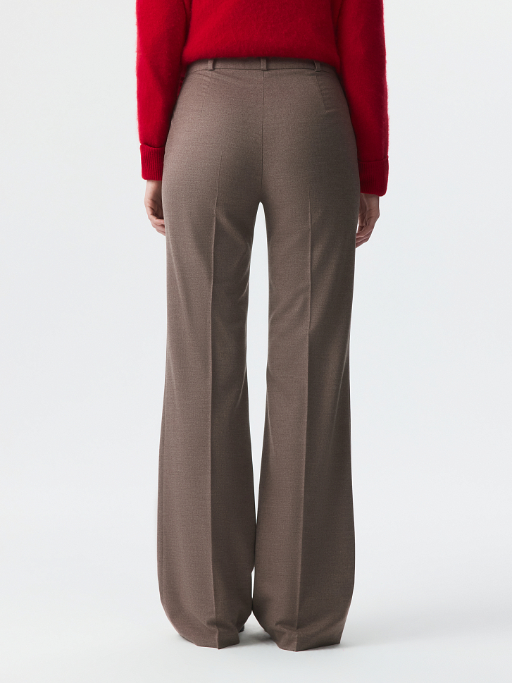 Классические брюки расклешенного кроя – свобода движения и безупречный силуэт. Тонкая фланель мягко прилегает и комфортно сидит по фигуре. Готовый образ для офиса получится с аналогичным жакетом.