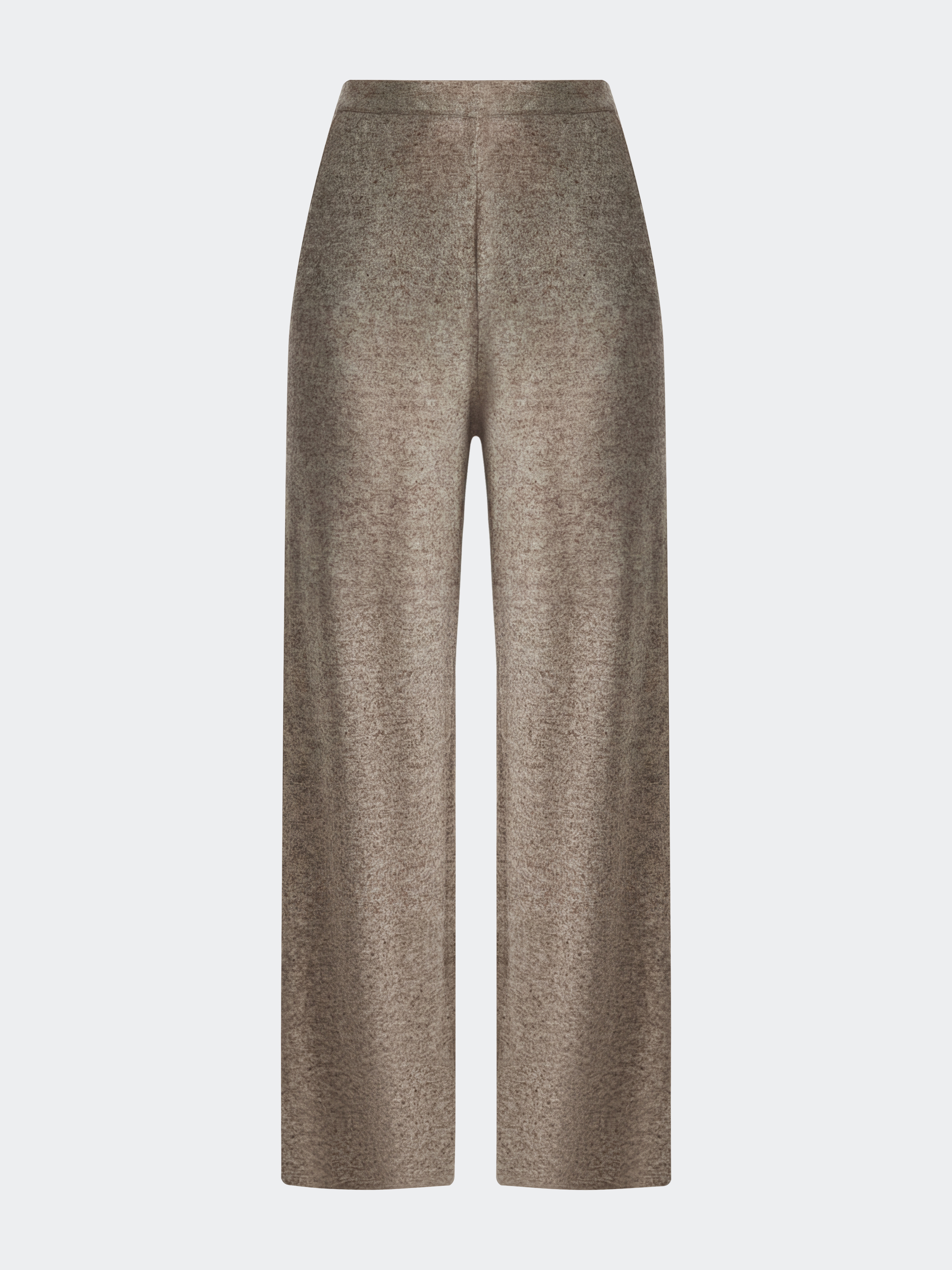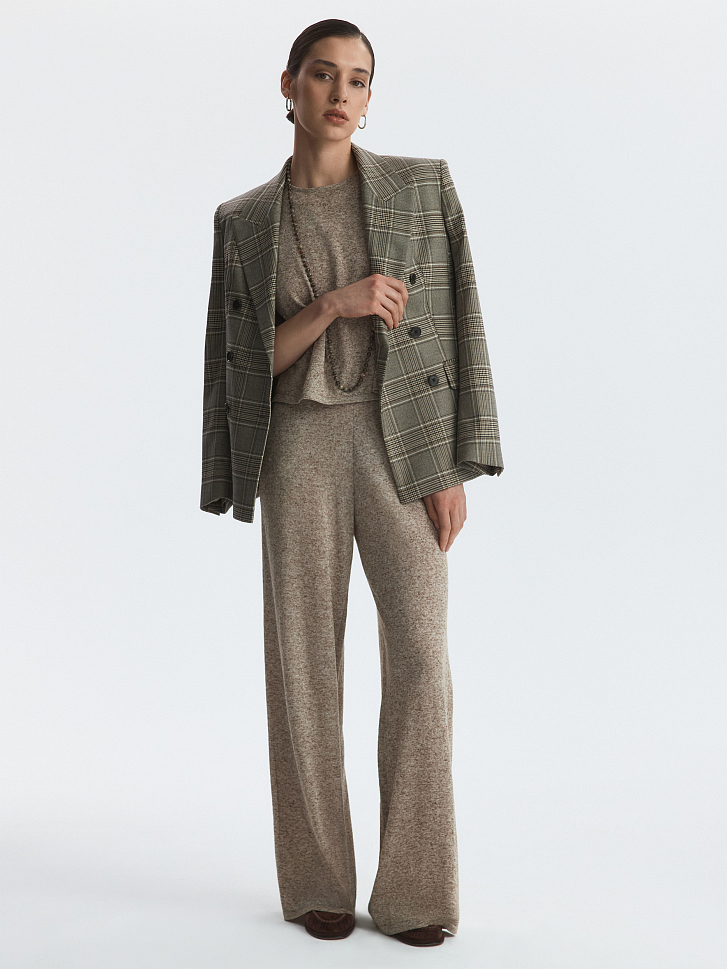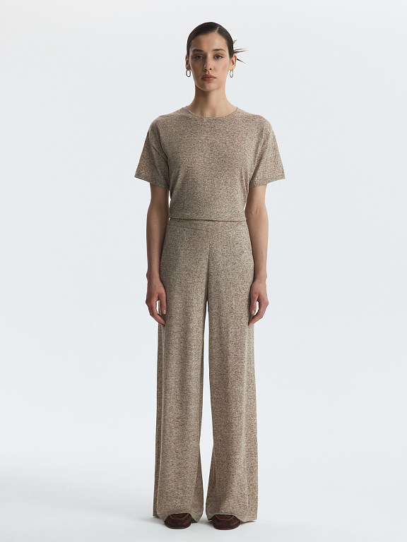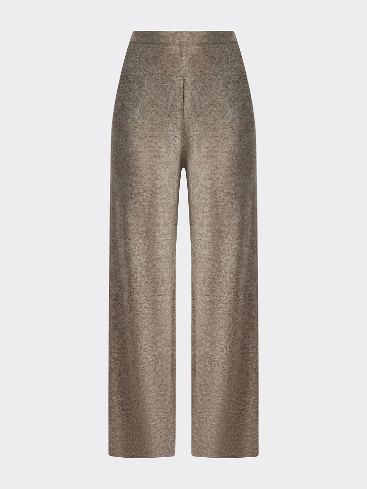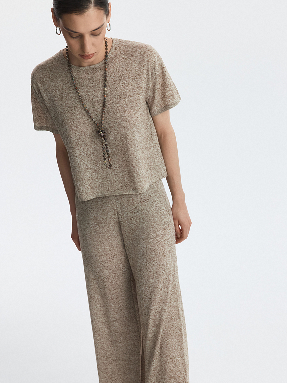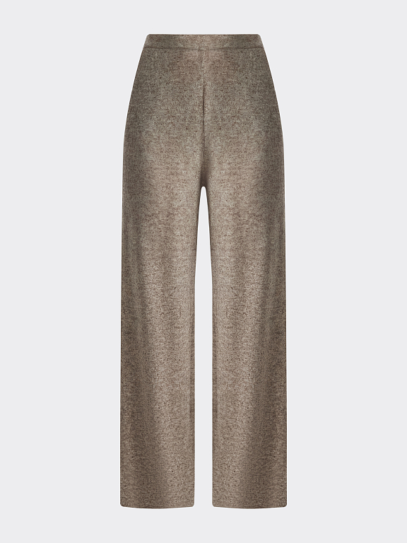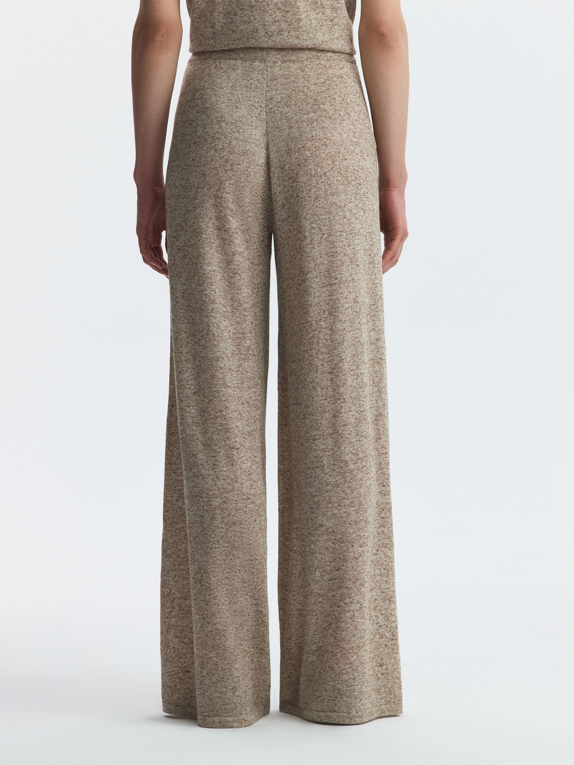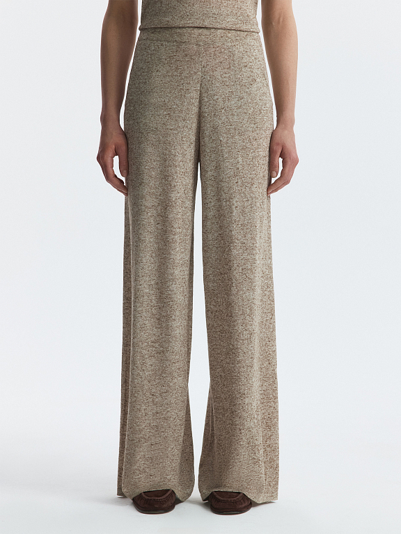Вязаные брюки составят уютный костюм с парным джемпером. Тонкий меланжевый трикотаж мягко прилегает к телу и не колется, а благодаря волокнам натурального льна обладает прочностью. Модель расслабленно сидит по фигуре и не сковывают движения.