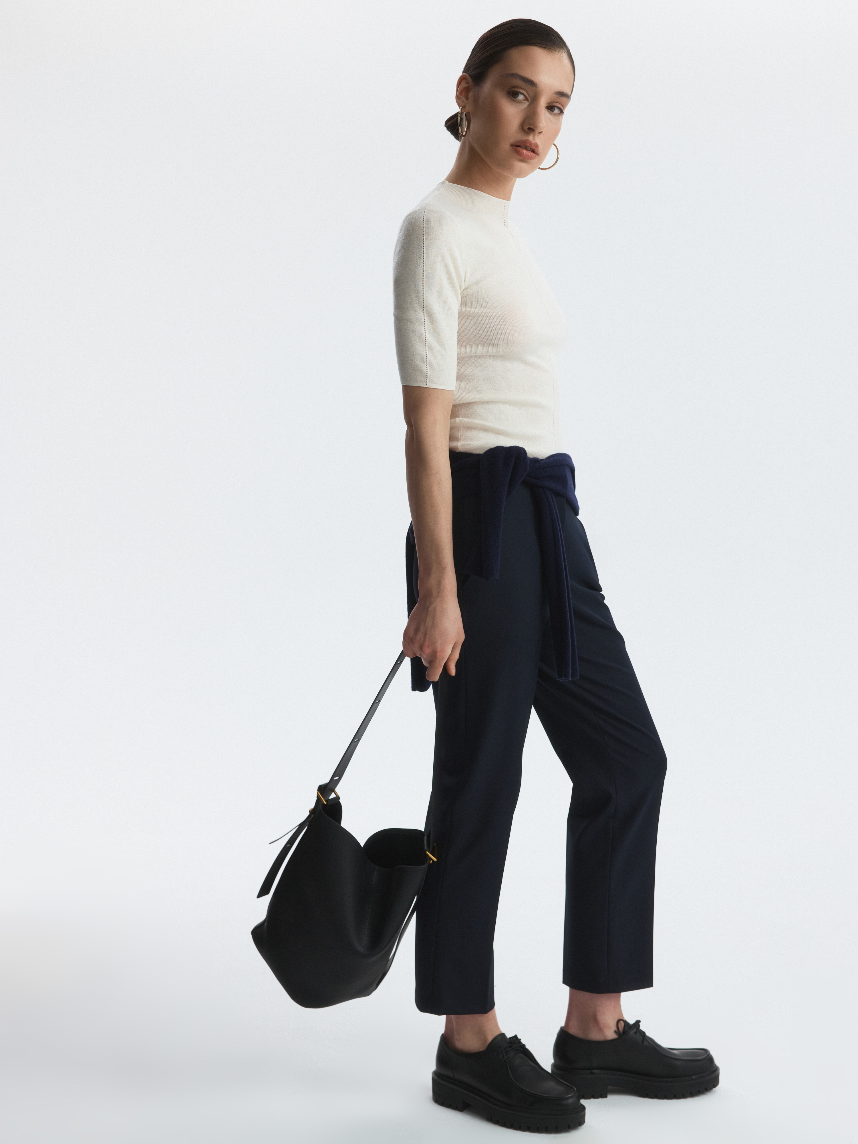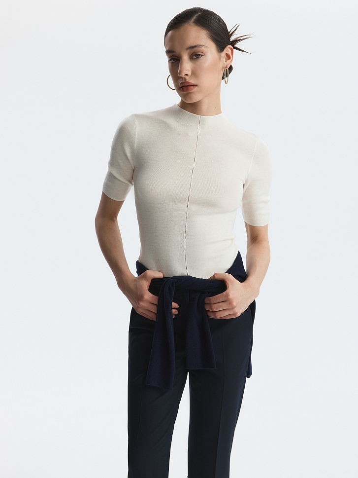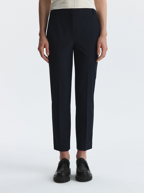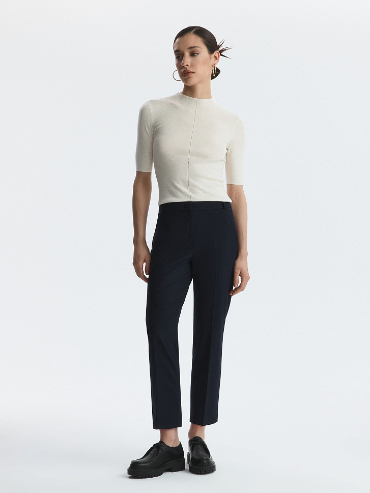 Укороченные брюки со стрелками – новое решение в деловом гардеробе. В меру плотный костюмный текстиль не тянется и комфортно облегает фигуру. Парный жакет завершит безупречный образ.