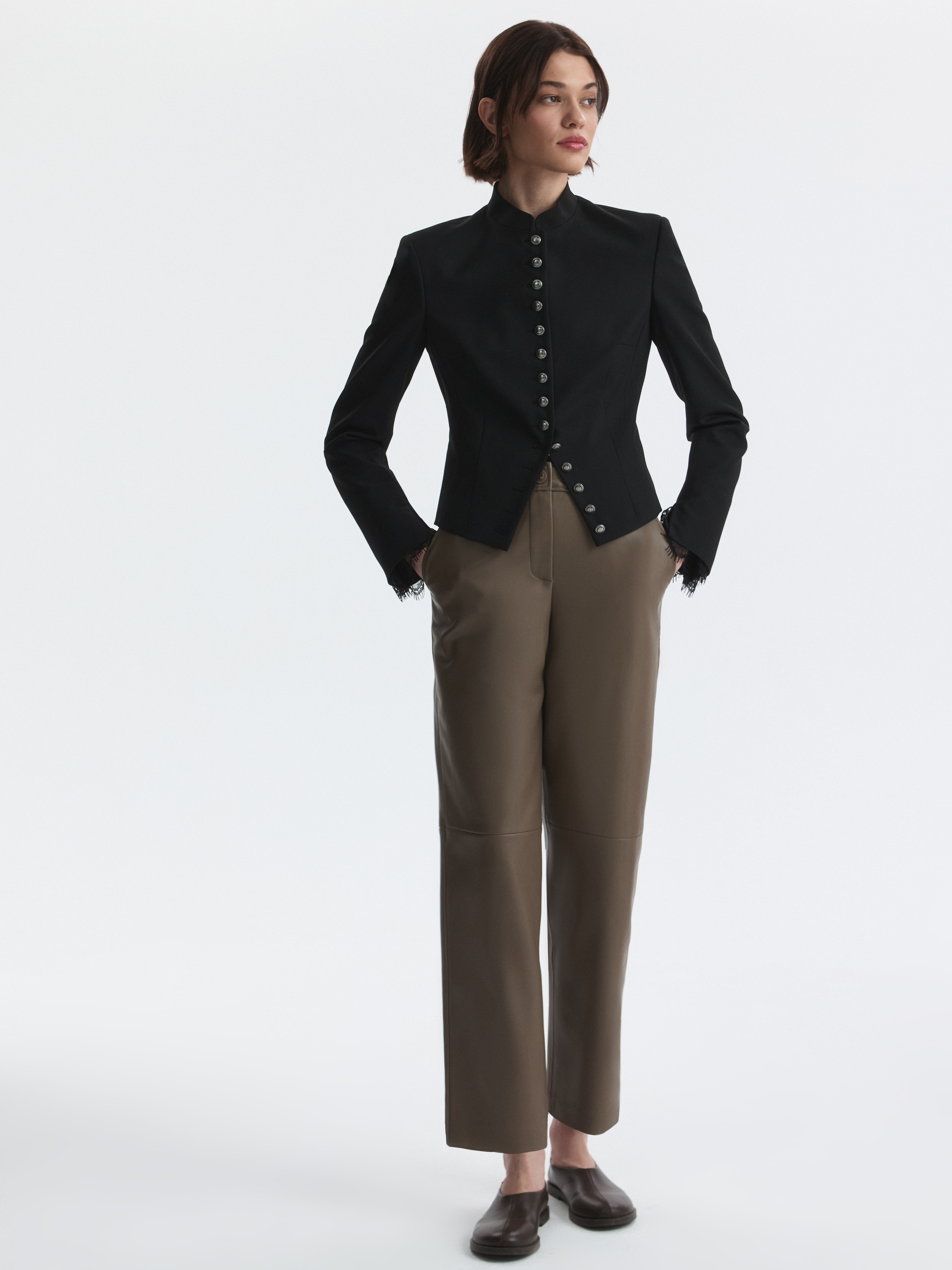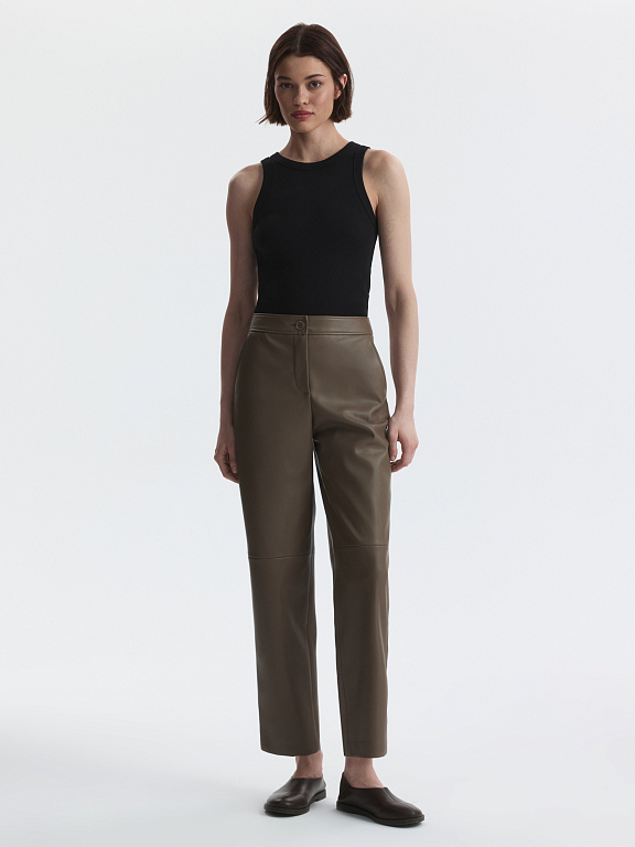 Кожаные брюки работают на эстетику и комфорт. Плотная искусственная кожа обладает пластичностью и мягко прилегает к телу. Сочетайте брюки на контрасте с более легкими материалами – трикотажем или денимом.