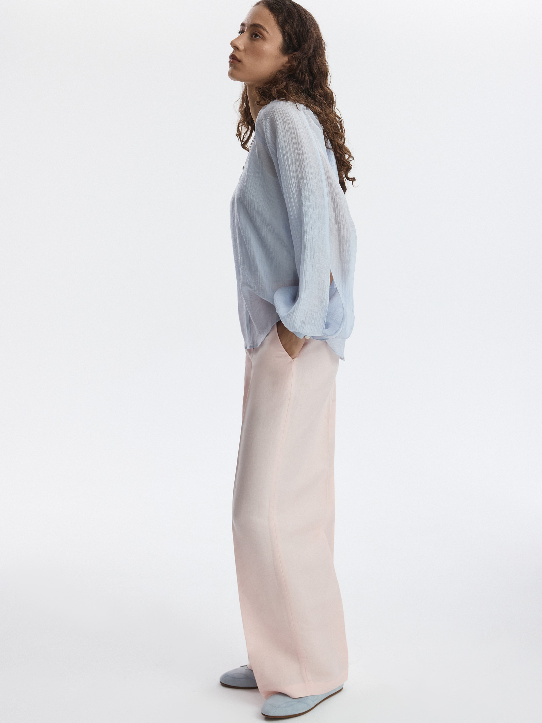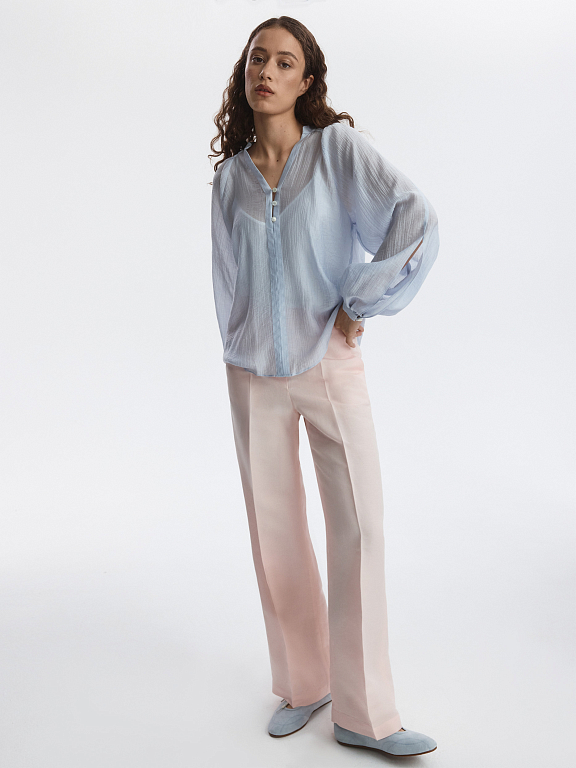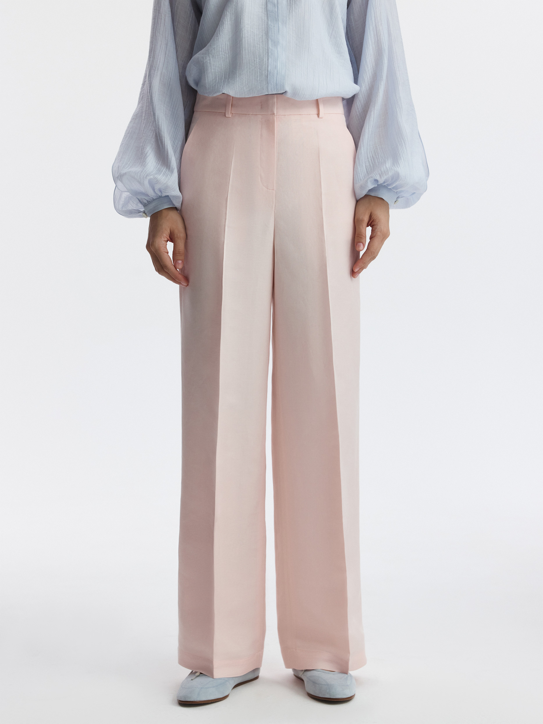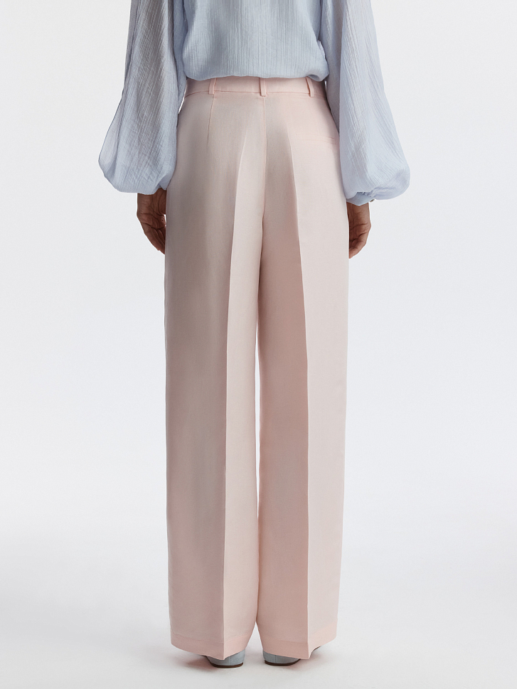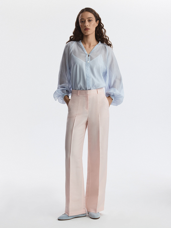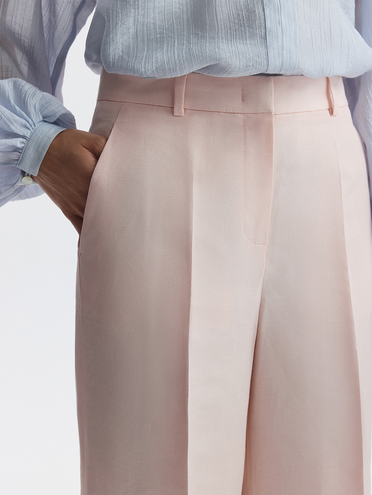 Льняная коллекция – визитная карточка летнего сезона. Широкие брюки в классическом стиле отличаются акцентированными строгими стрелками, которые придают образу графичности. В меру плотный текстиль обладает прочностью и не просвечивает.