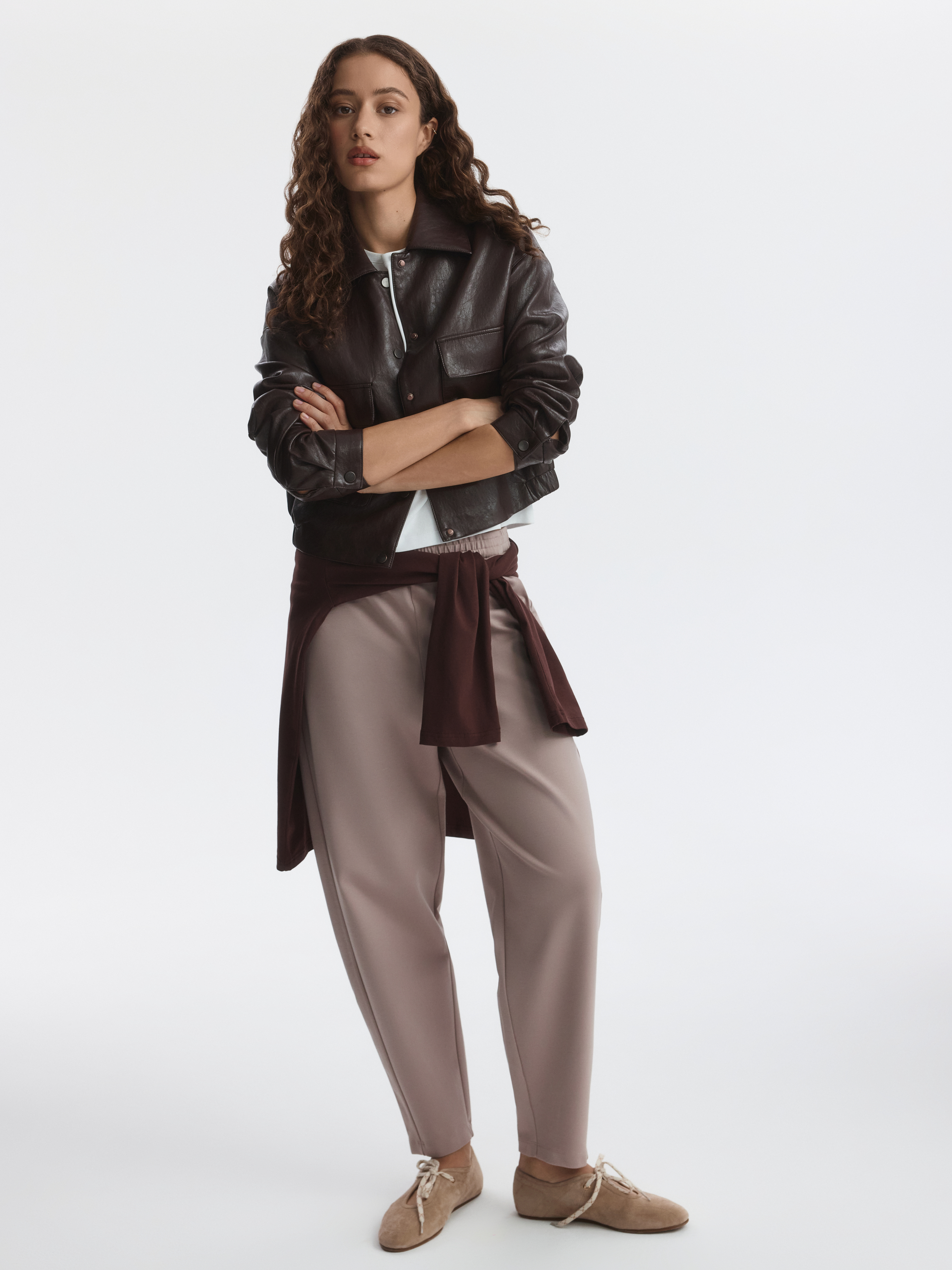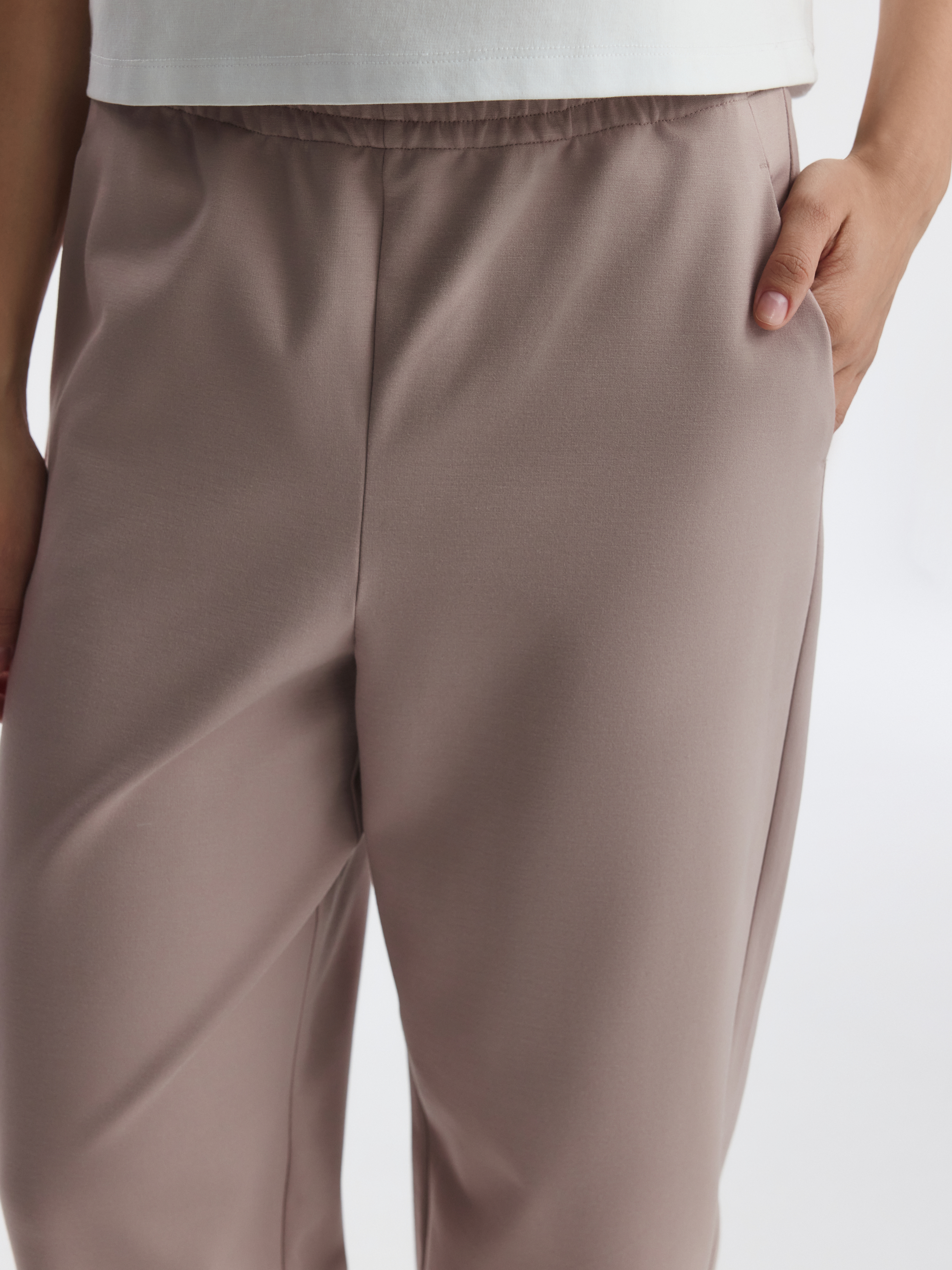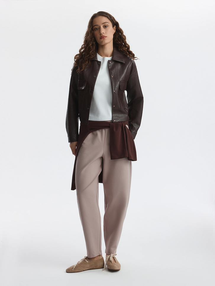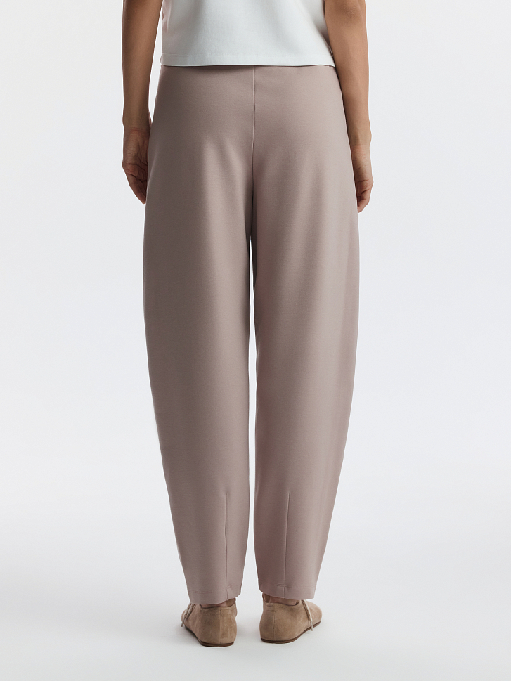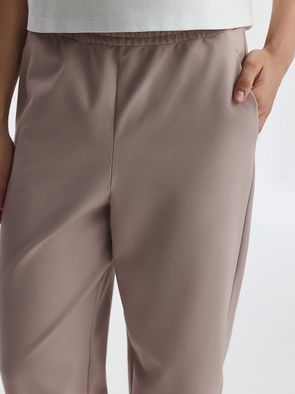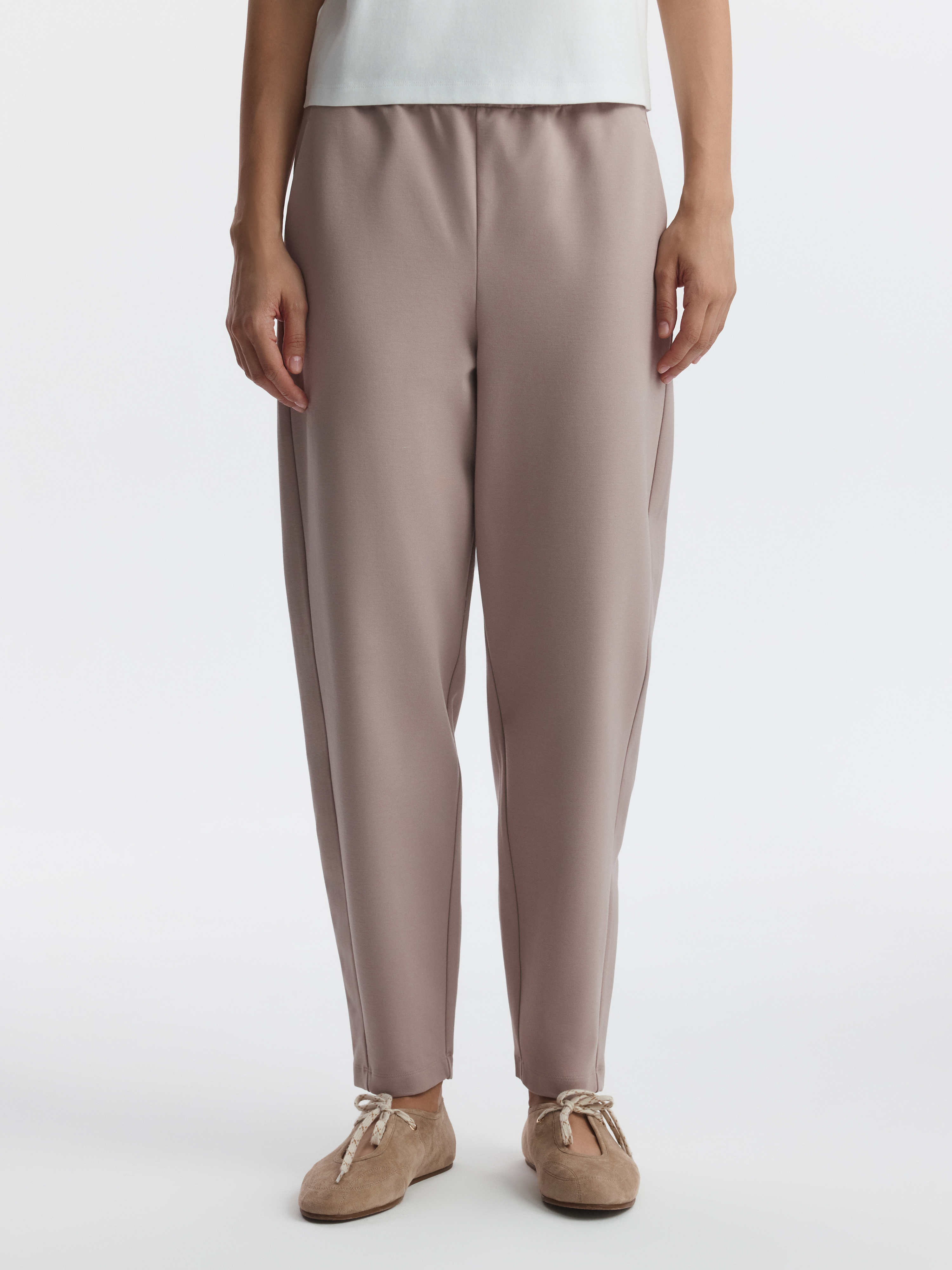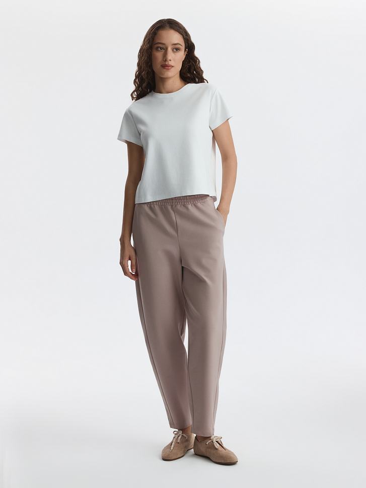Зауженные брюки станут удобной базой на каждый день: расслабленная посадка и лаконичный дизайн позволяют стилизовать модель со многими вещами в гардеробе. В меру плотный гладкий трикотаж интерлок без начеса мягко прилегает к телу и дарит комфорт, а благодаря содержанию эластичных волокон тянется и не сковывает движения.