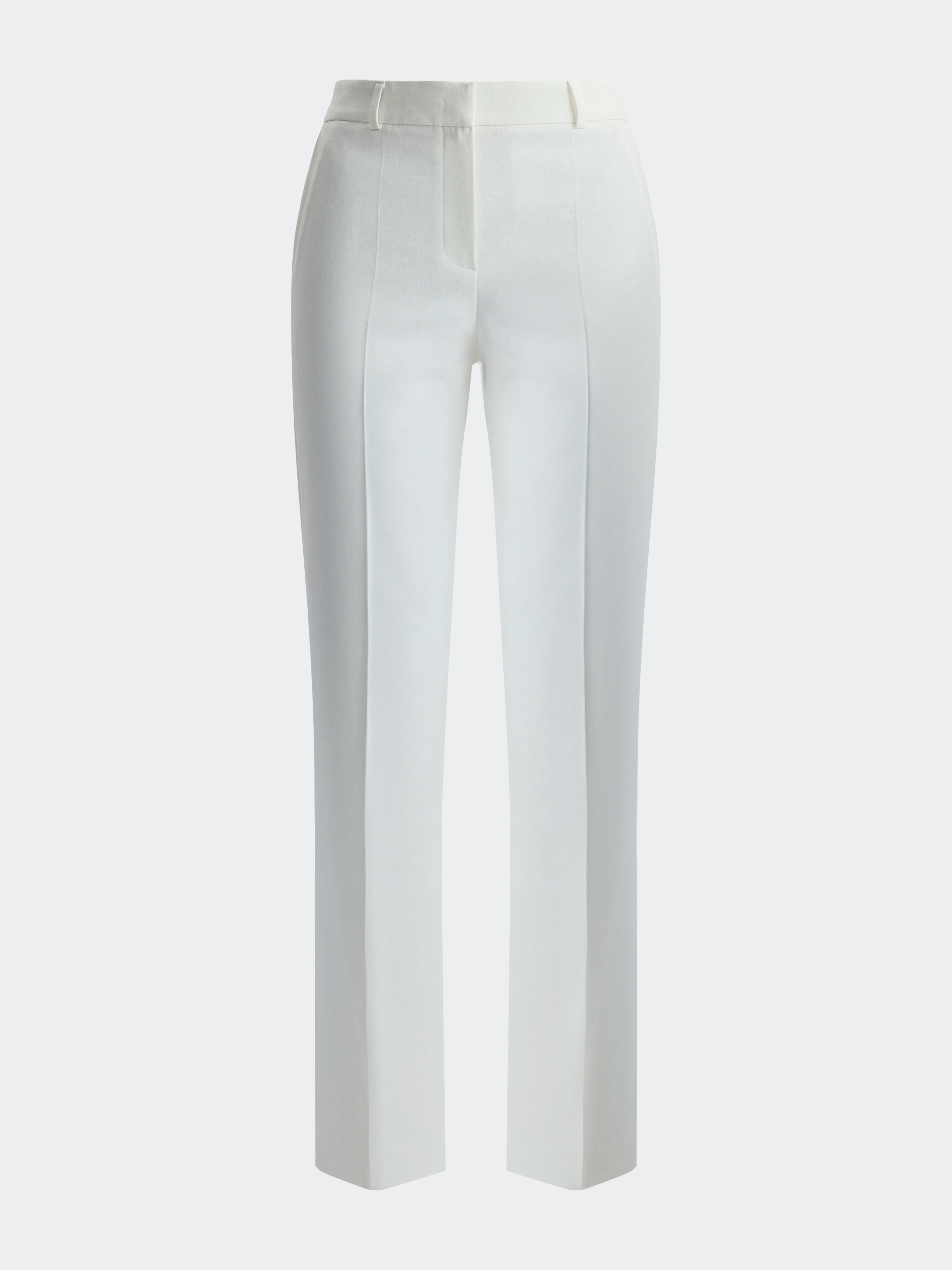 Светлые брюки в классическом стиле легко вписать в деловой и повседневный гардероб на летний сезон. В меру плотный текстиль на основе хлопка комфортно прилегает к телу и не просвечивает. Дополнить костюм можно жакетом из аналогичного материала.