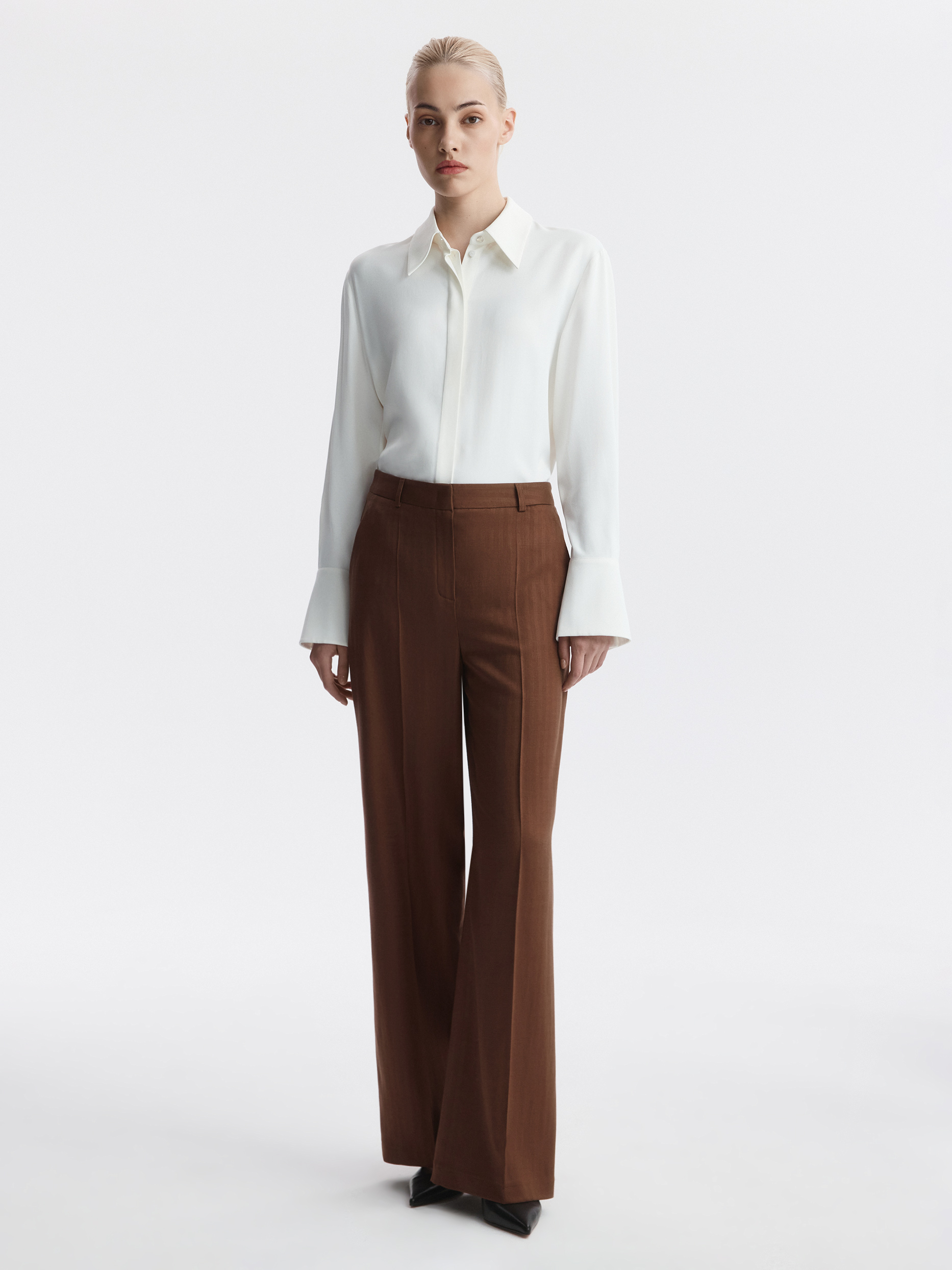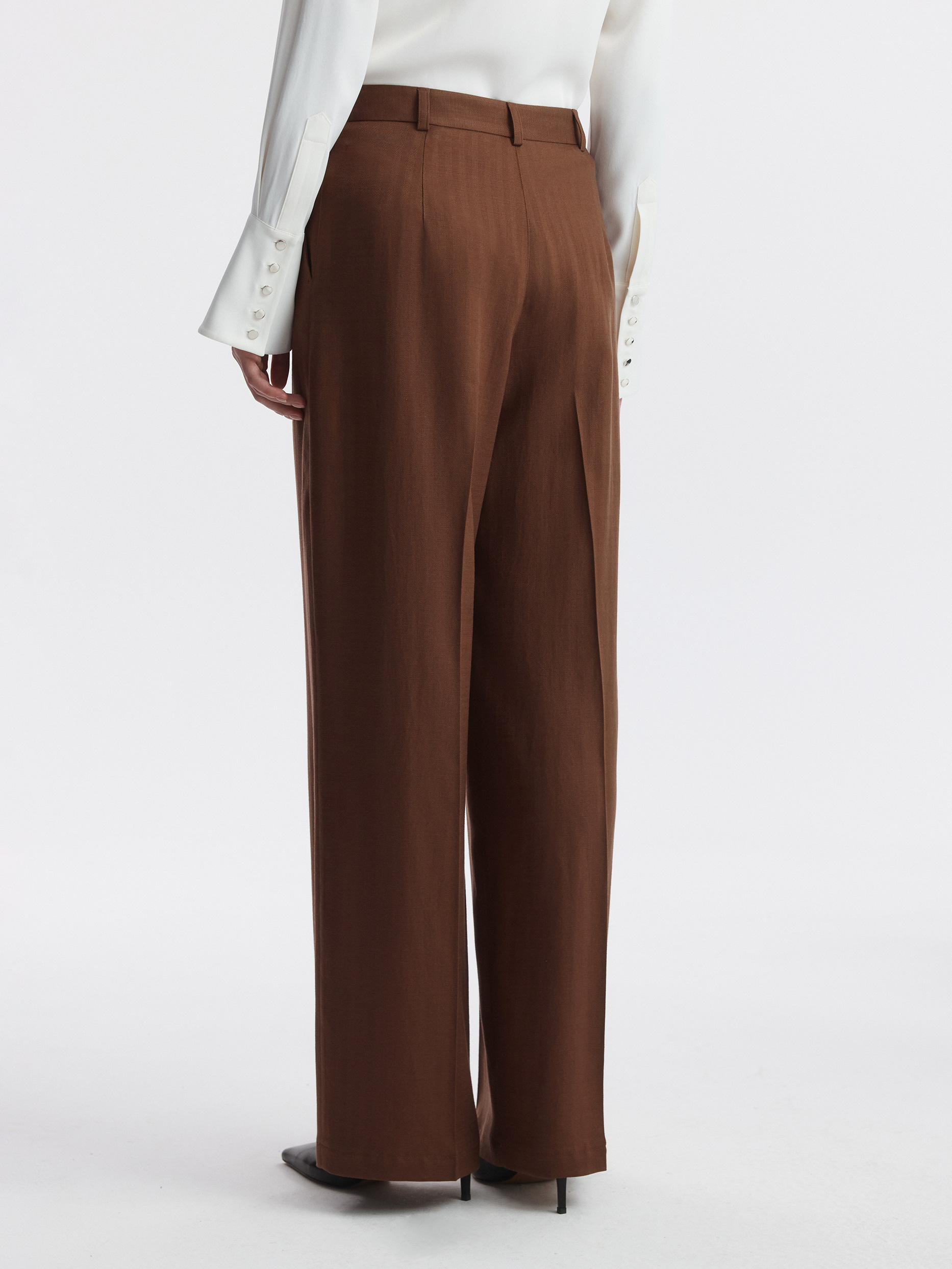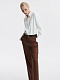 Прямые брюки со стрелками – многофункциональная модель для повседневного и делового гардероба в летний сезон. В меру плотный текстиль на основе тенселя (волокна целлюлозы) с фактурой «в елочку» комфортно прилегает и почти не просвечивает. Дополнить костюм можно жакетом из аналогичного материала.