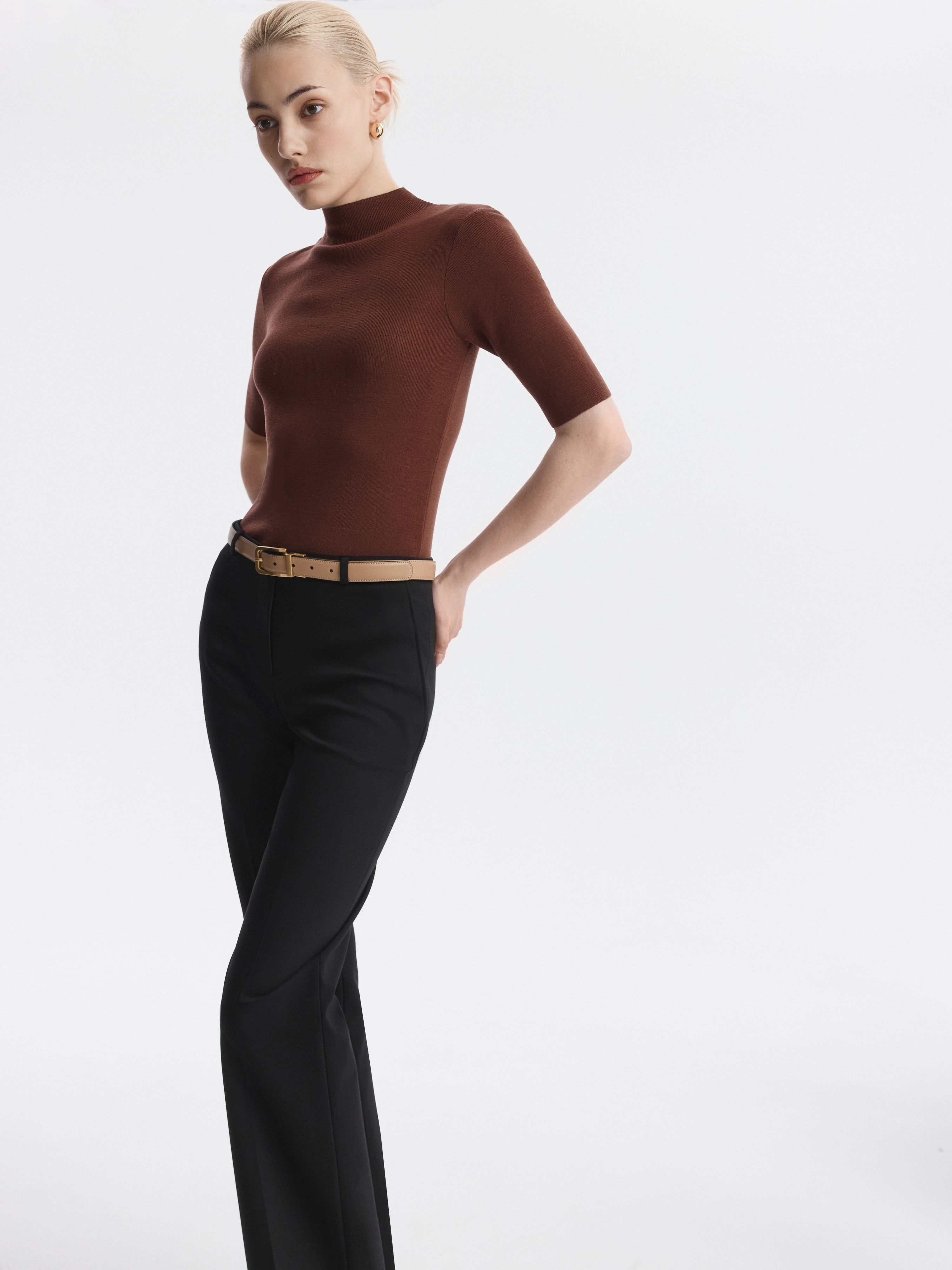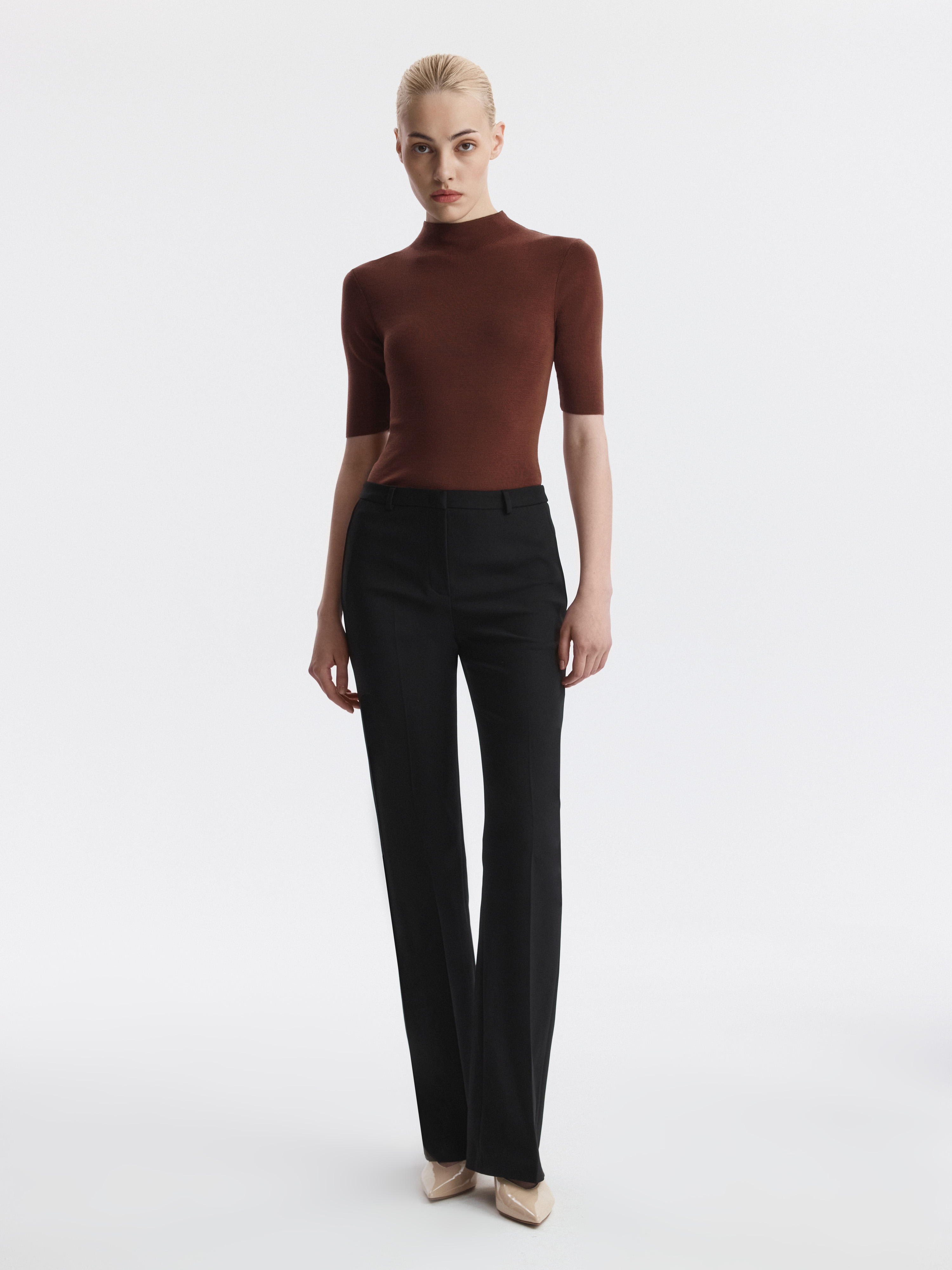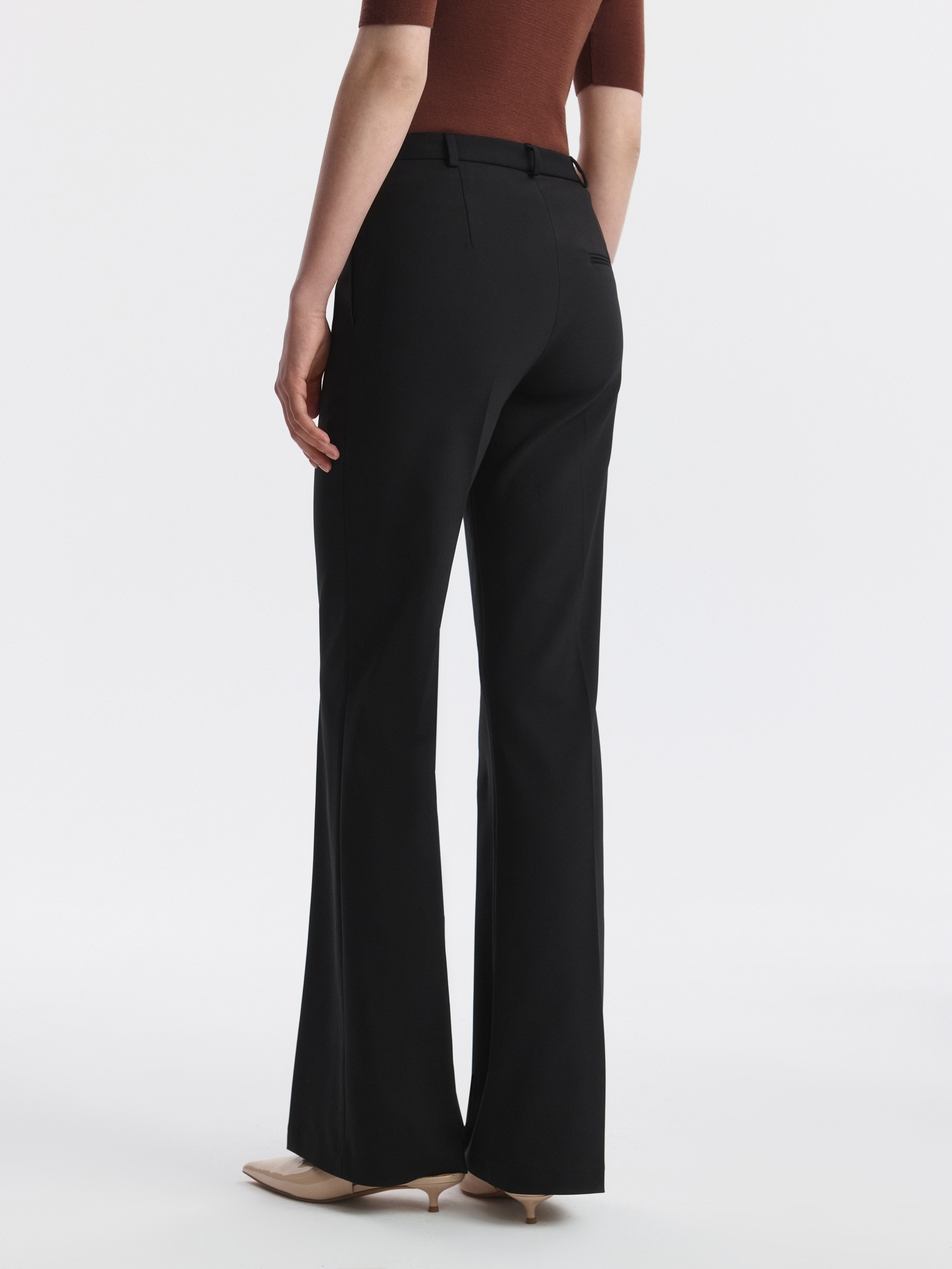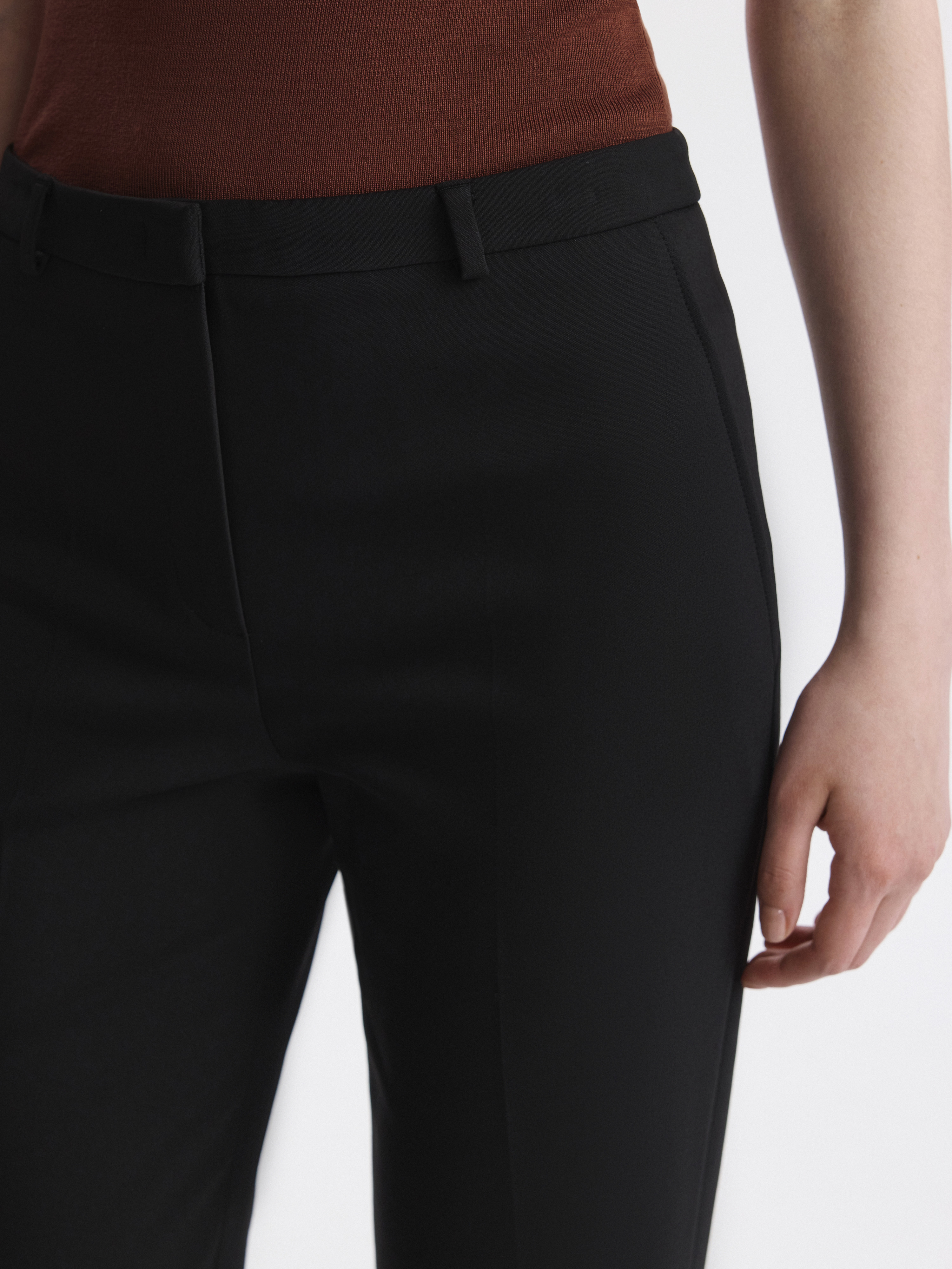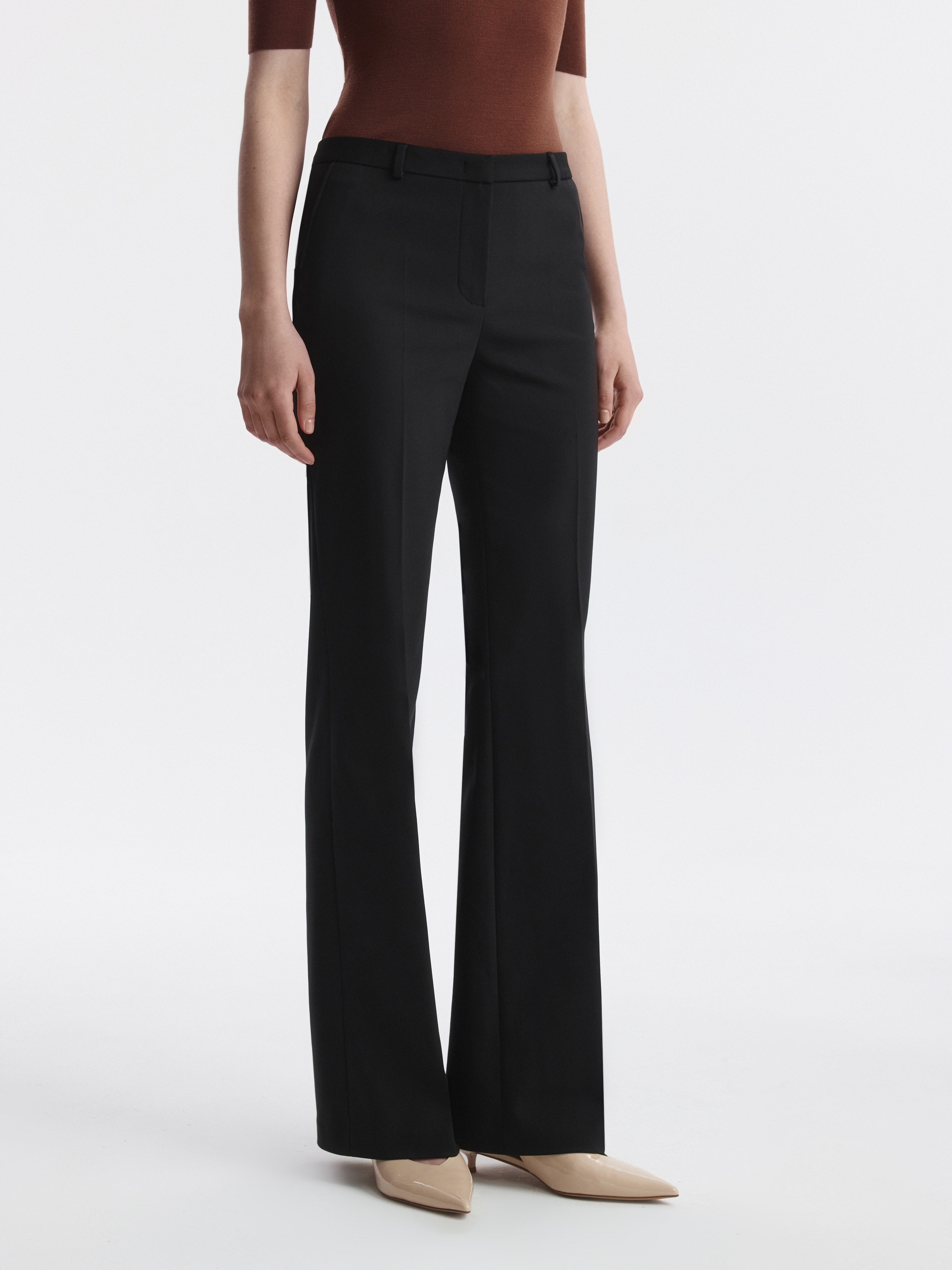 Расклешенные брюки сделают привычный деловой образ более расслабленным. Плотный гладкий текстиль на основе хлопка не тянется и комфортно прилегает к телу. Дополнить костюм можно жакетом из аналогичного материала.