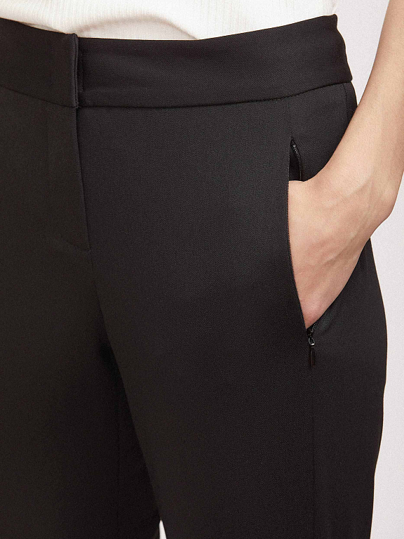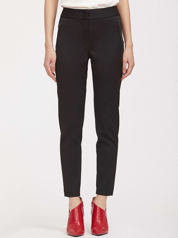 Брюки зауженного кроя из эластичной ткани. Средняя посадка, широкий втачной пояс, прорезные карманы на молниях по бокам.