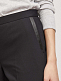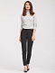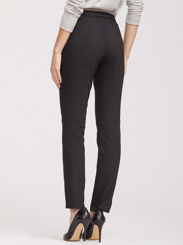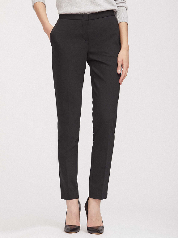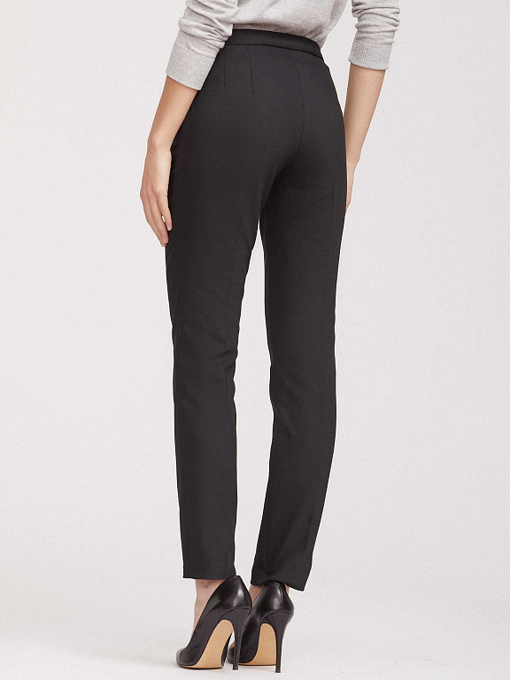 Зауженные брюки из плотной и мягкой поливискозы с кожаной отделкой на боковых карманах.  Застёжка на молнию и крючок, скрытые планкой. Брючины с заглаженными стрелками. Изделие без подкладки.  Рост модели 177 см, размер 42 (российский)
