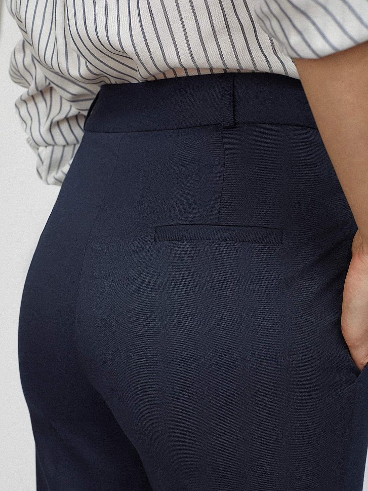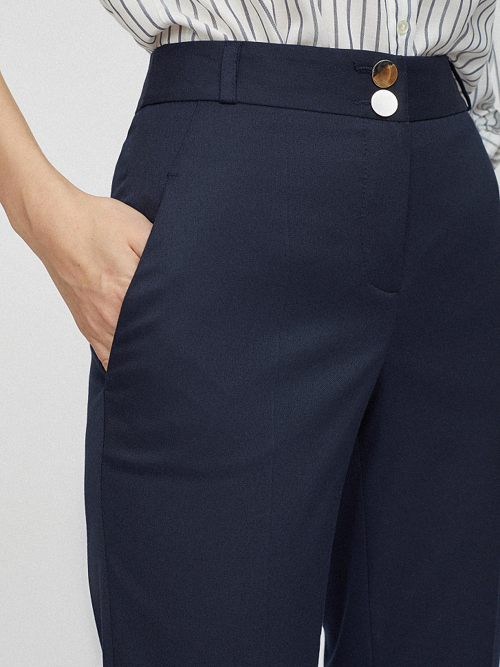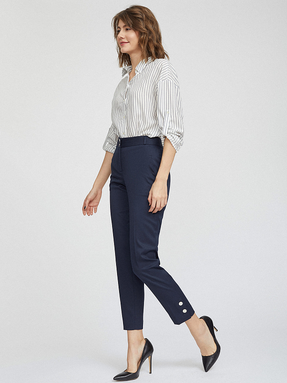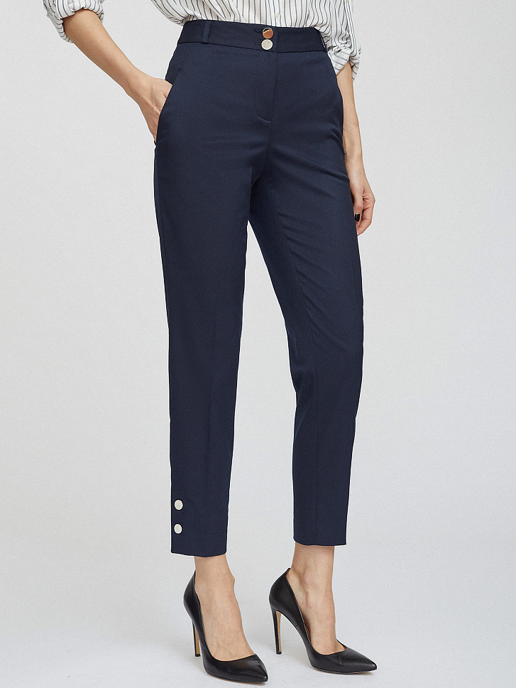 Укороченные брюки зауженного кроя. Высокая посадка, два боковых кармана, декоративный карман сзади, ряды пуговиц по бокам нижнего края брюк.