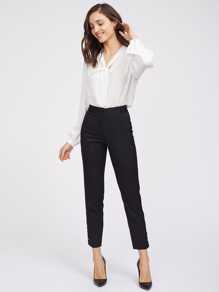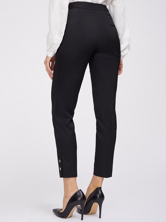 Укороченные брюки зауженного кроя. Высокая посадка, два боковых кармана, декоративный карман сзади, ряды пуговиц по бокам нижнего края брюк.