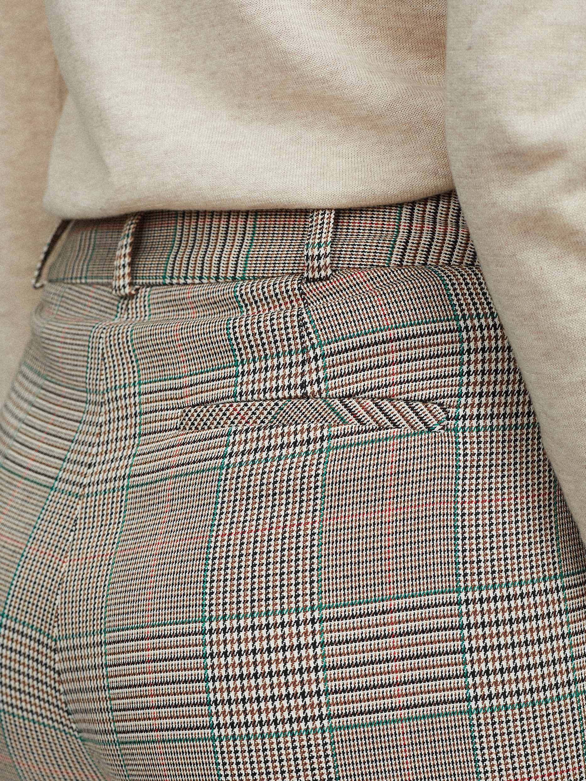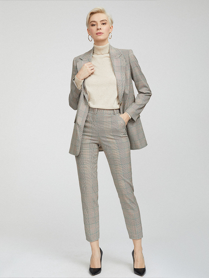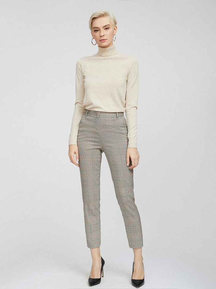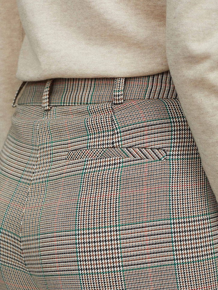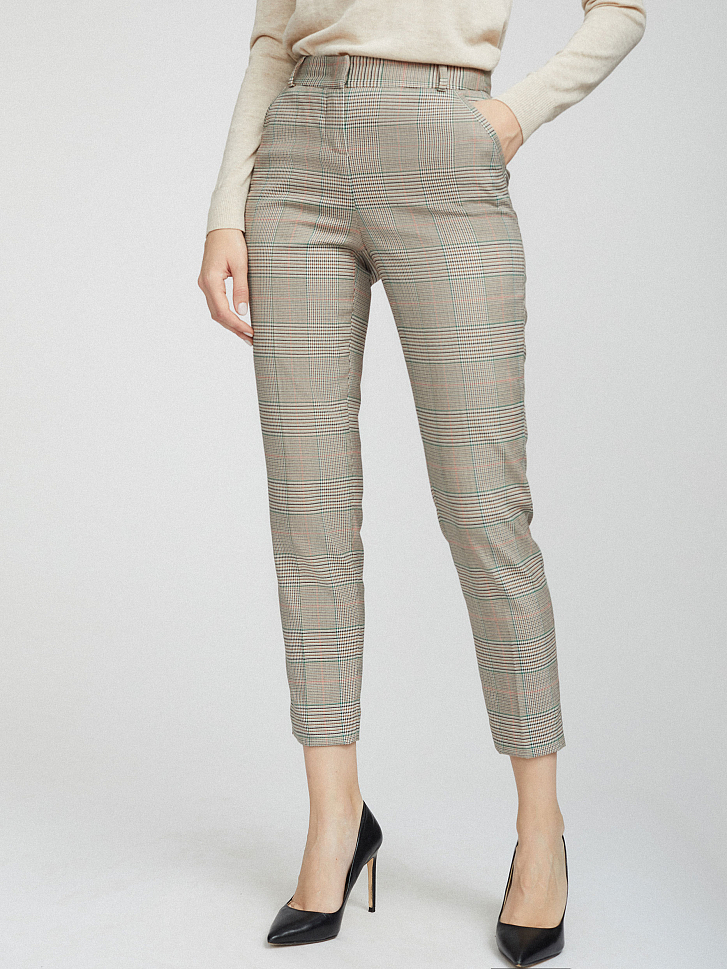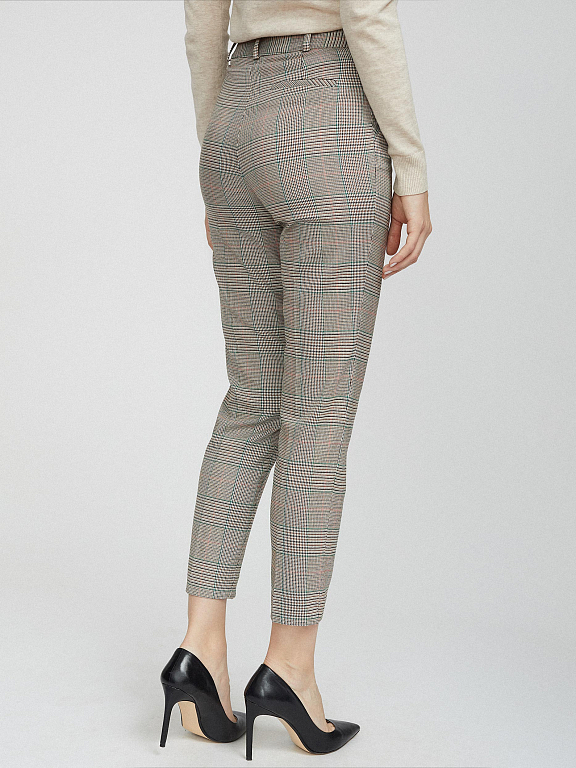Укороченные брюки в крупную клетку. Высокая посадка, втачной пояс, прорезные карманы по бокам, декоративный карман сзади.