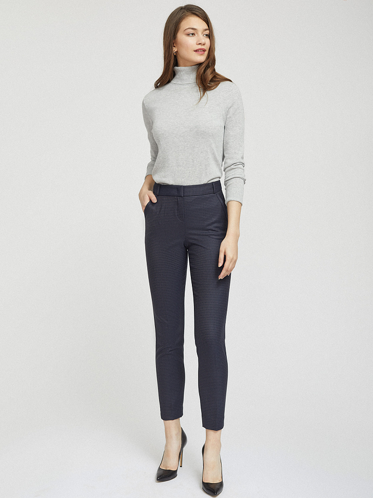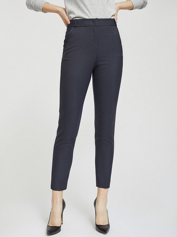 Укороченные брюки облегающего кроя. Узор «гусиная лапка», средняя посадка, втачной пояс со шлевками для ремня, прорезные карманы по бокам, декоративный карман сзади.