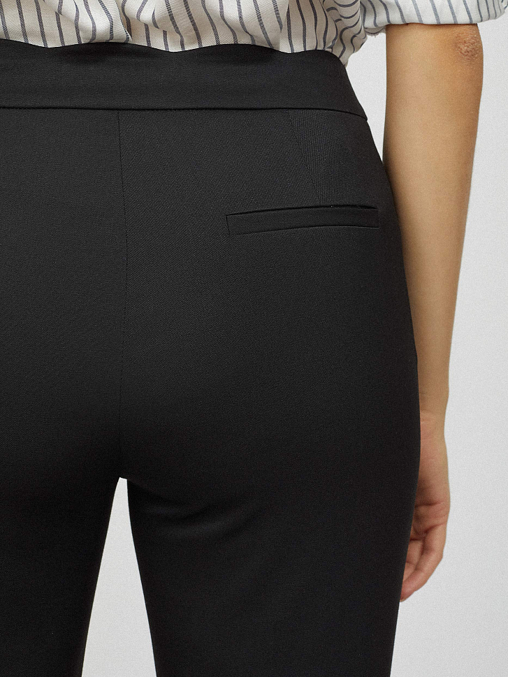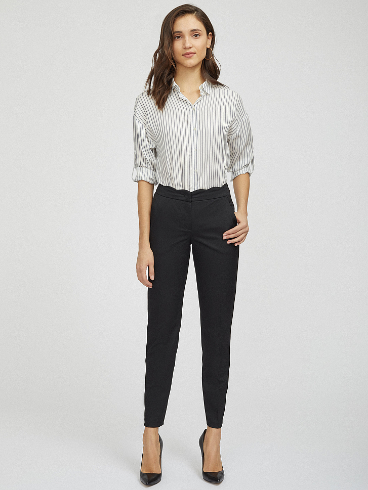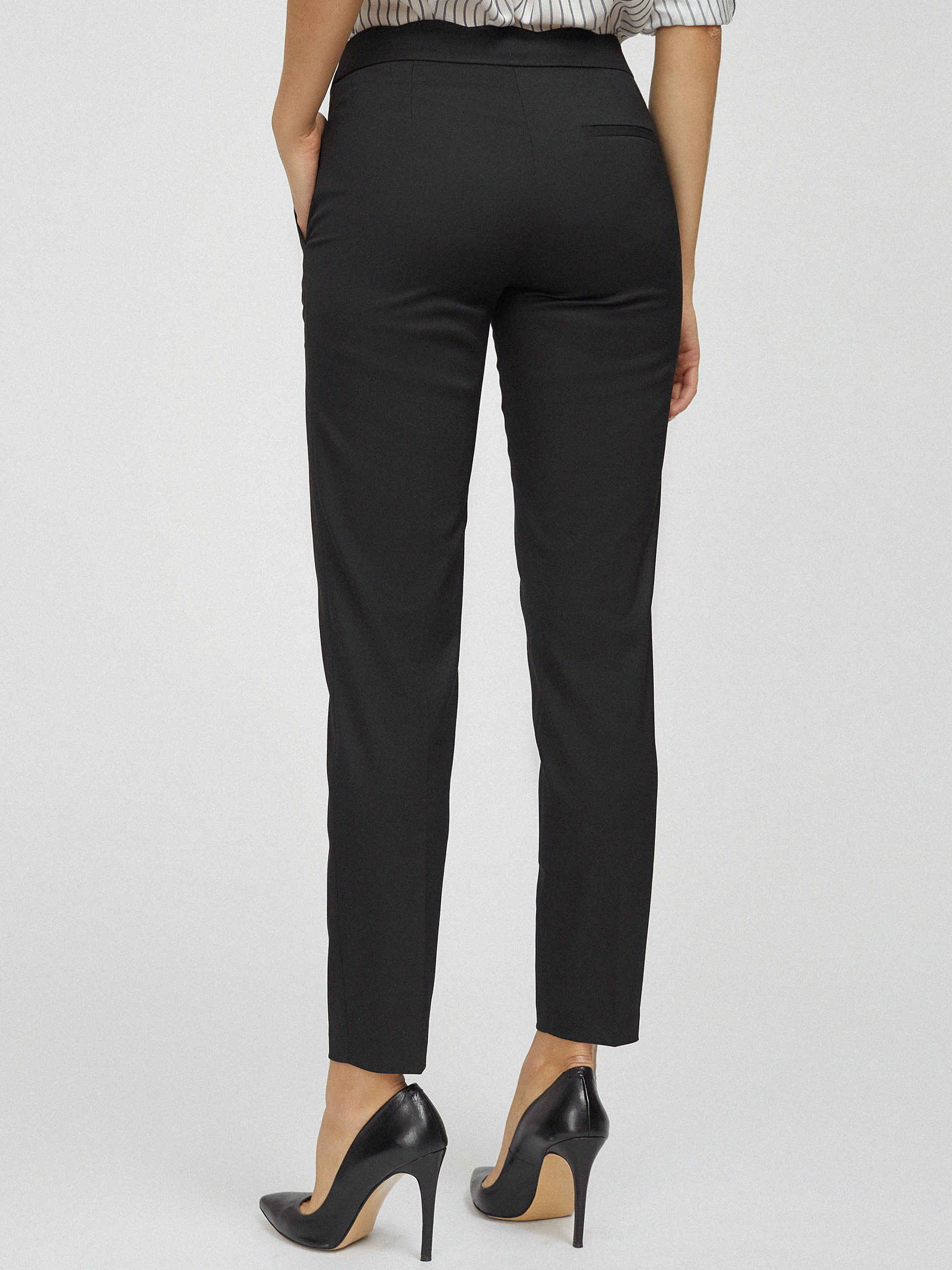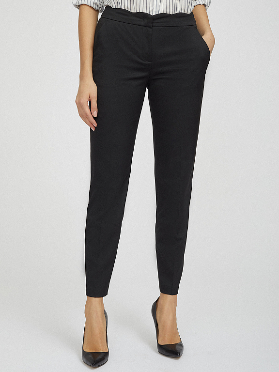 Брюки зауженного кроя из смесовой вискозы. Высокая посадка, втачной рельефный пояс, два боковых карман, декоративный карман сзади.