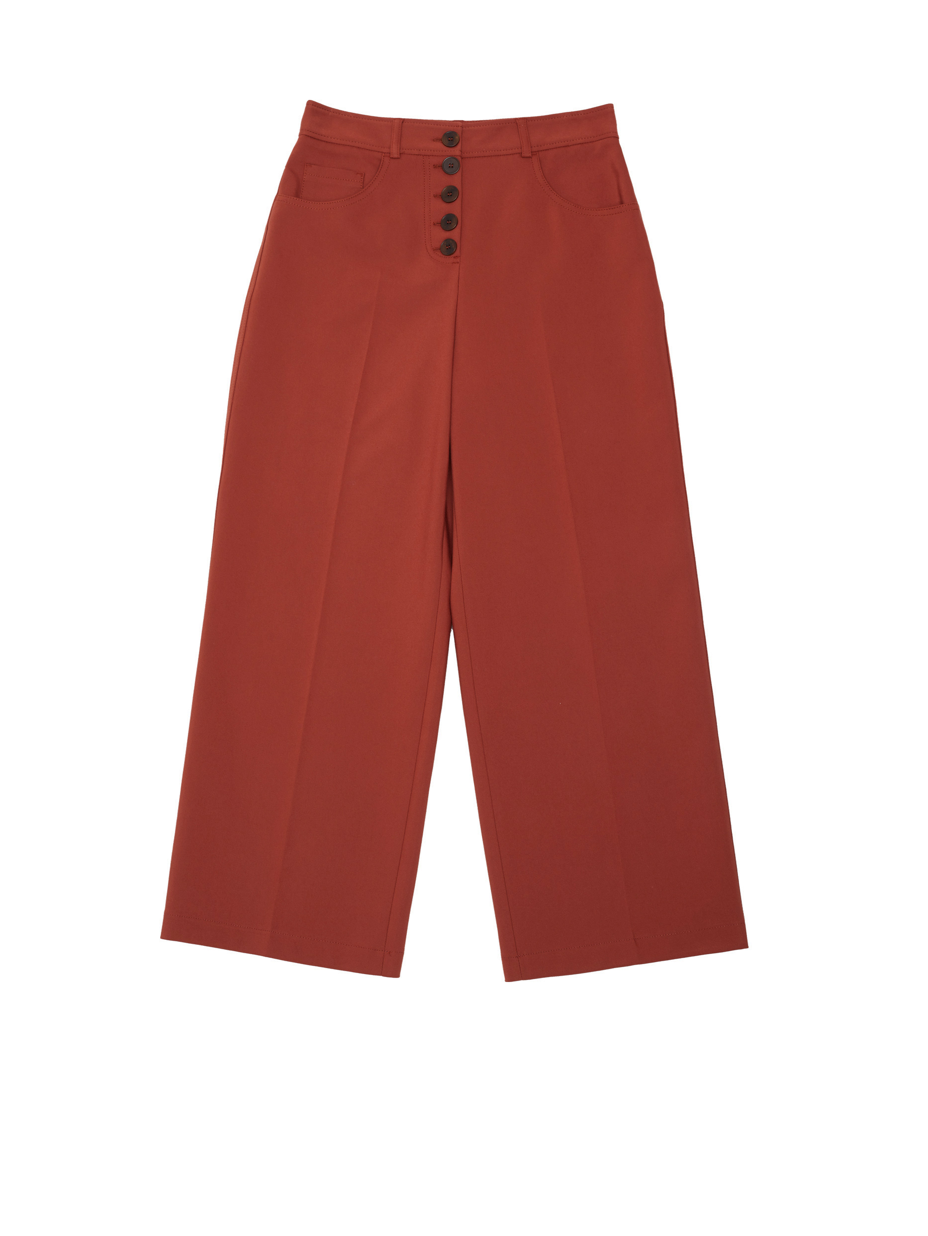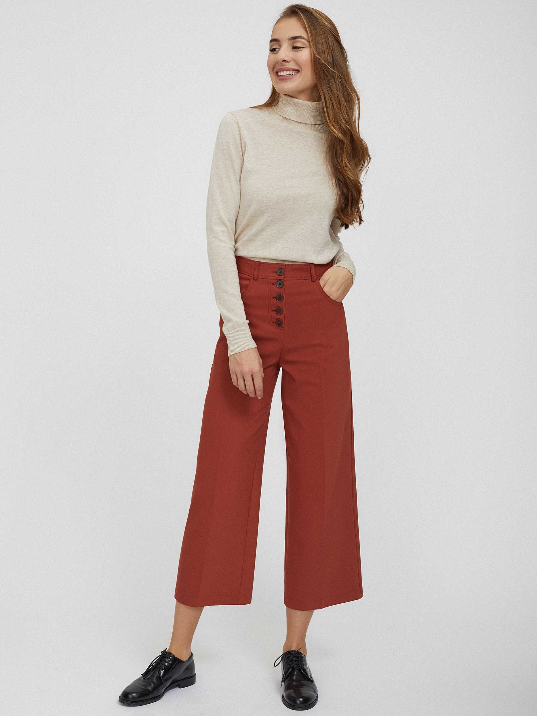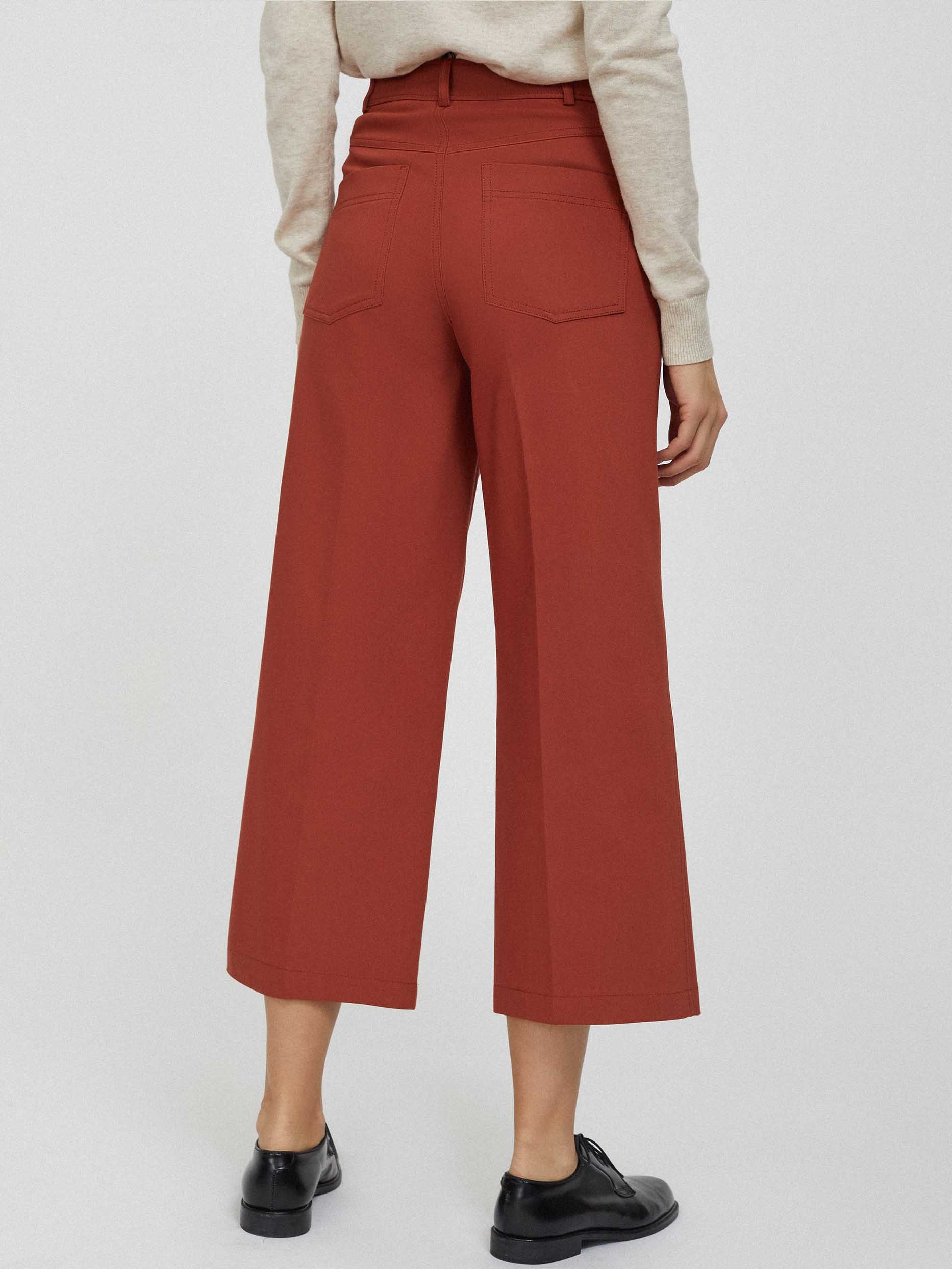 Однотонные брюки кюлоты. Высокая посадка, карманы по бокам, накладные карманы сзади, застежка на ряд пуговиц.
