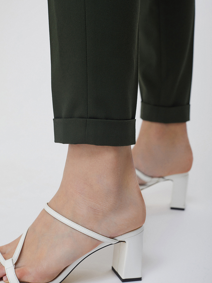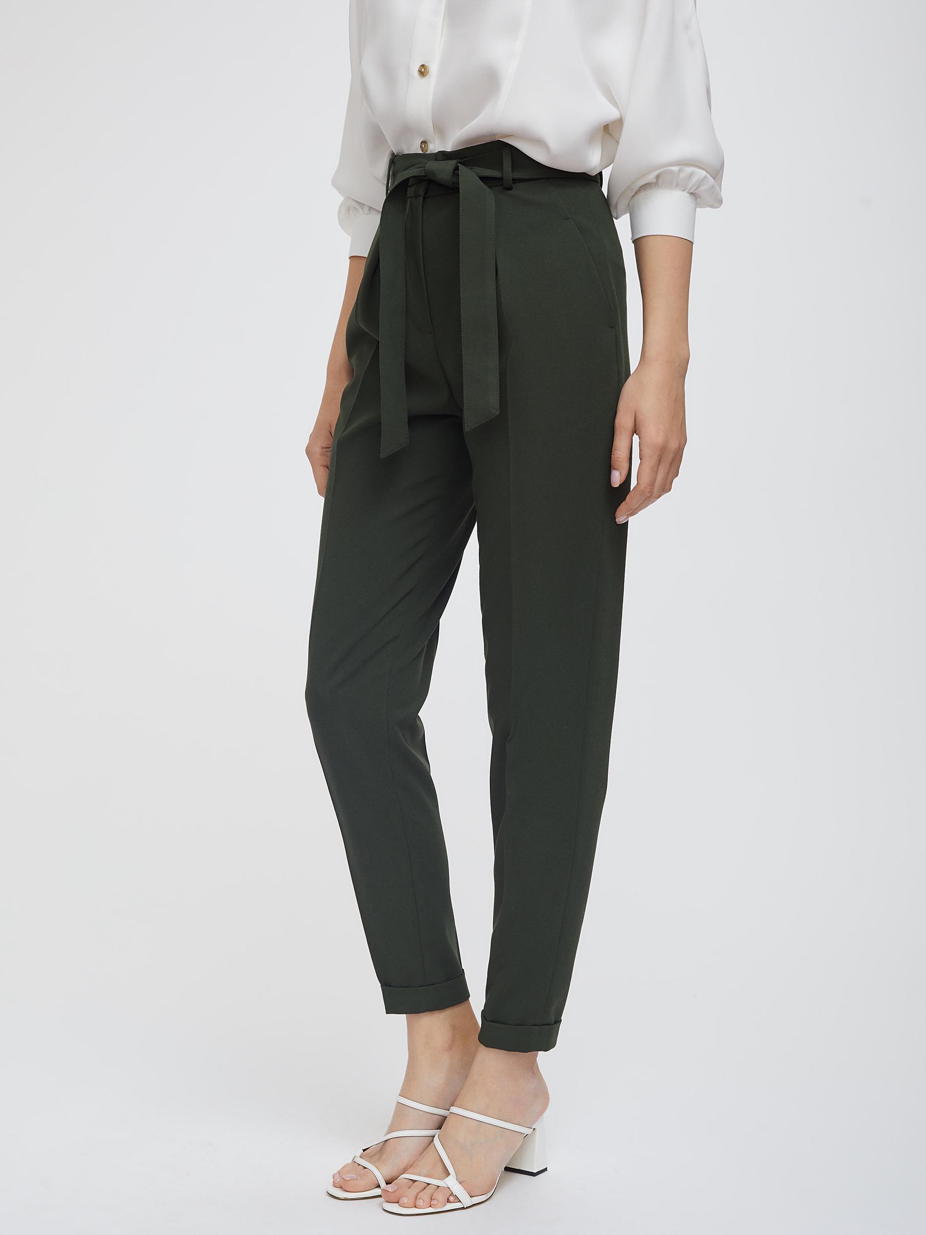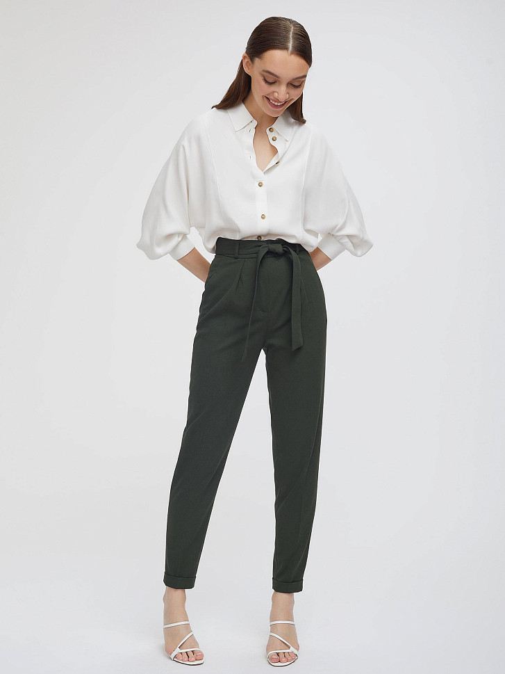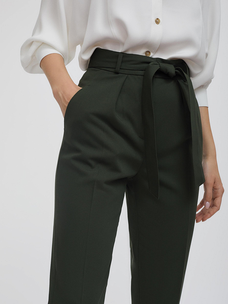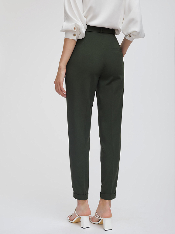 Брюки зауженного кроя. Высокая посадка, втачной пояс, защипы, боковые карманы, декоративный карман сзади, отвороты по нижнему краю. В комплекте пояс.