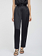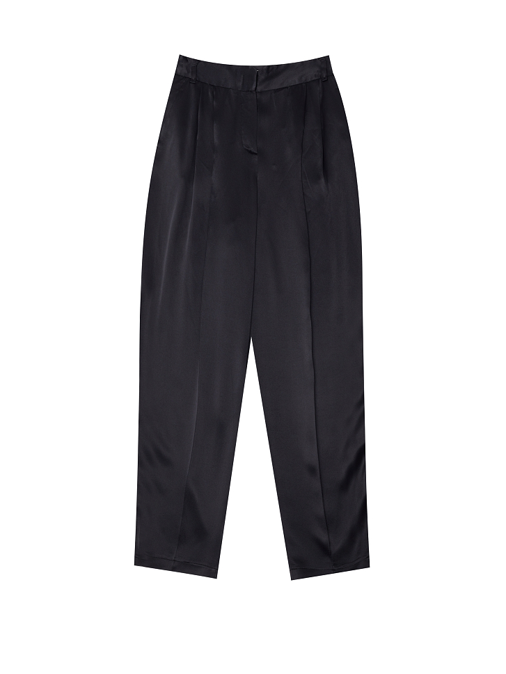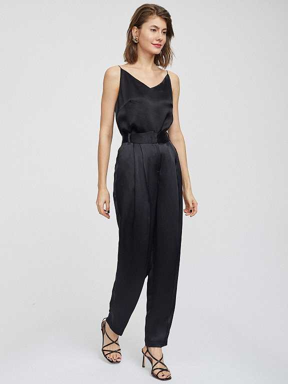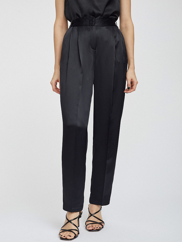 Брюки слегка зауженного кроя, выполненные из атласной ткани. Высокая посадка, широкий фигурный пояс, защипы, прорезные карманы по бокам, декоративный карман сзади.
