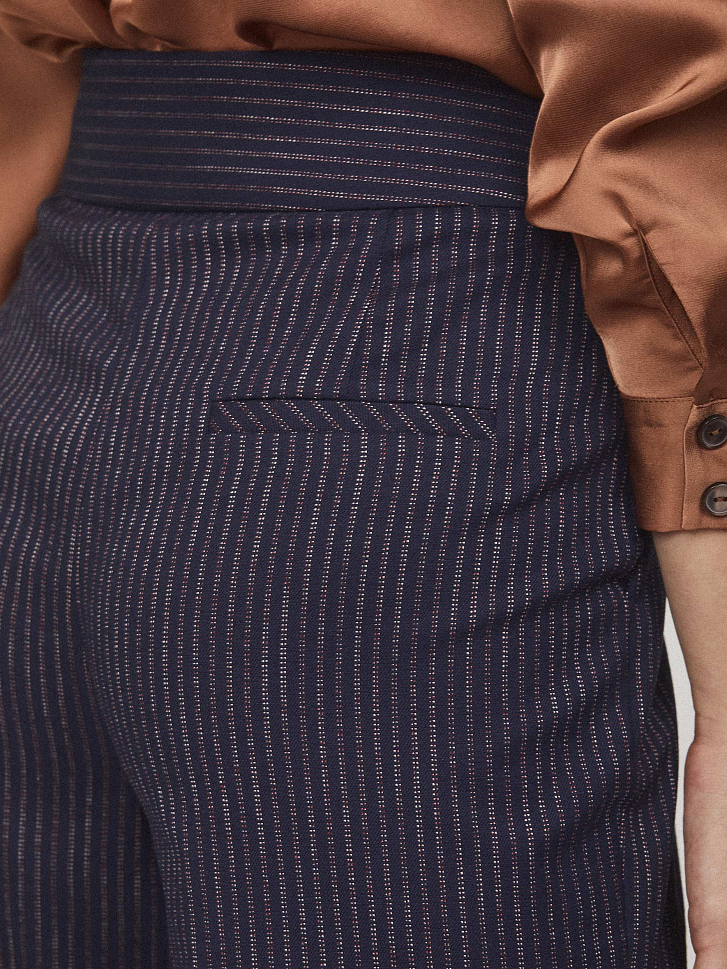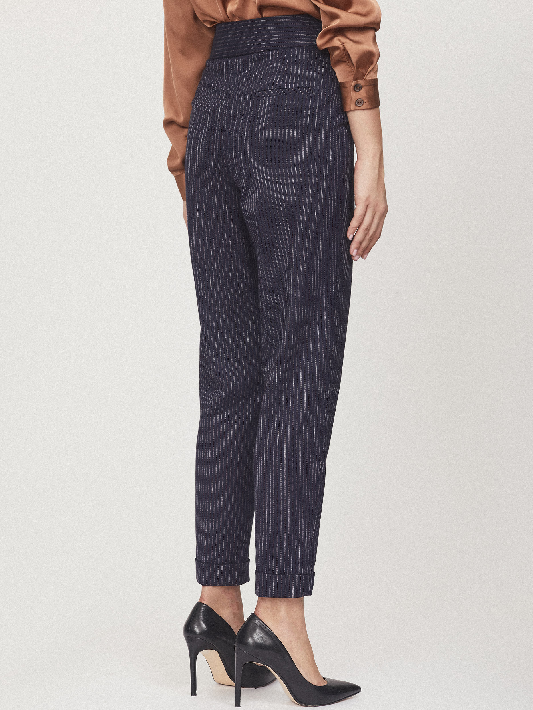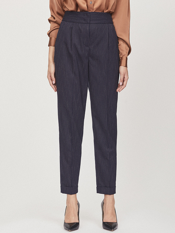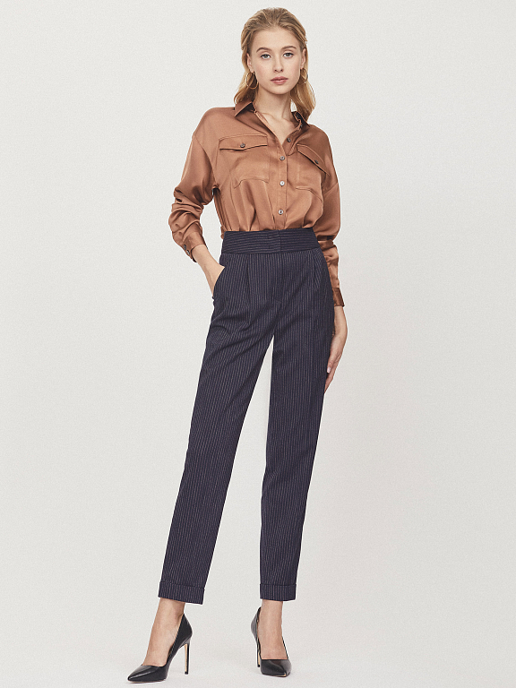 Брюки зауженного кроя, выполненные из мягкой смесовой вискозы. Высокая посадка, втачной пояс, защипы. Прорезные карманы по бокам, декоративный карман сзади. Прошитые отвороты по нижнему краю.