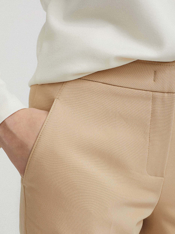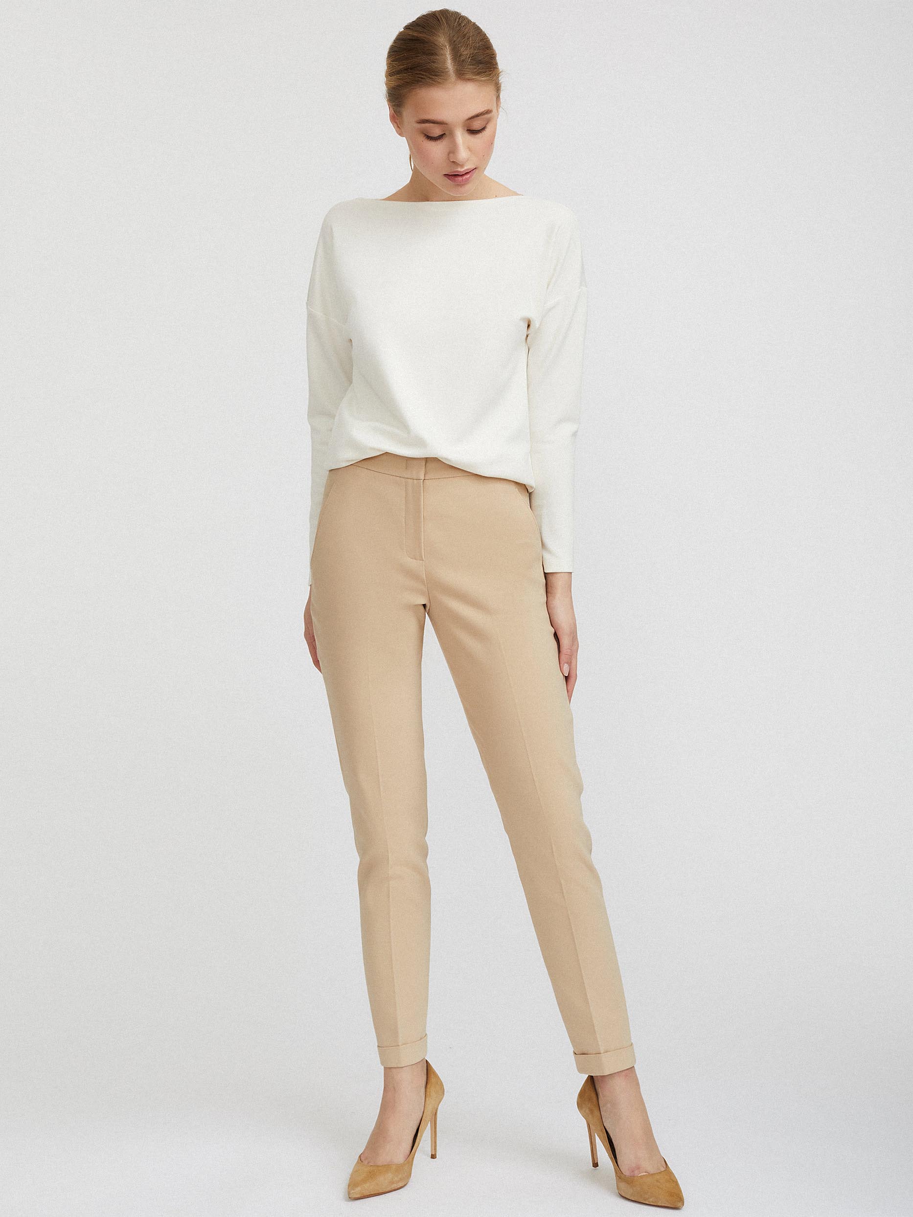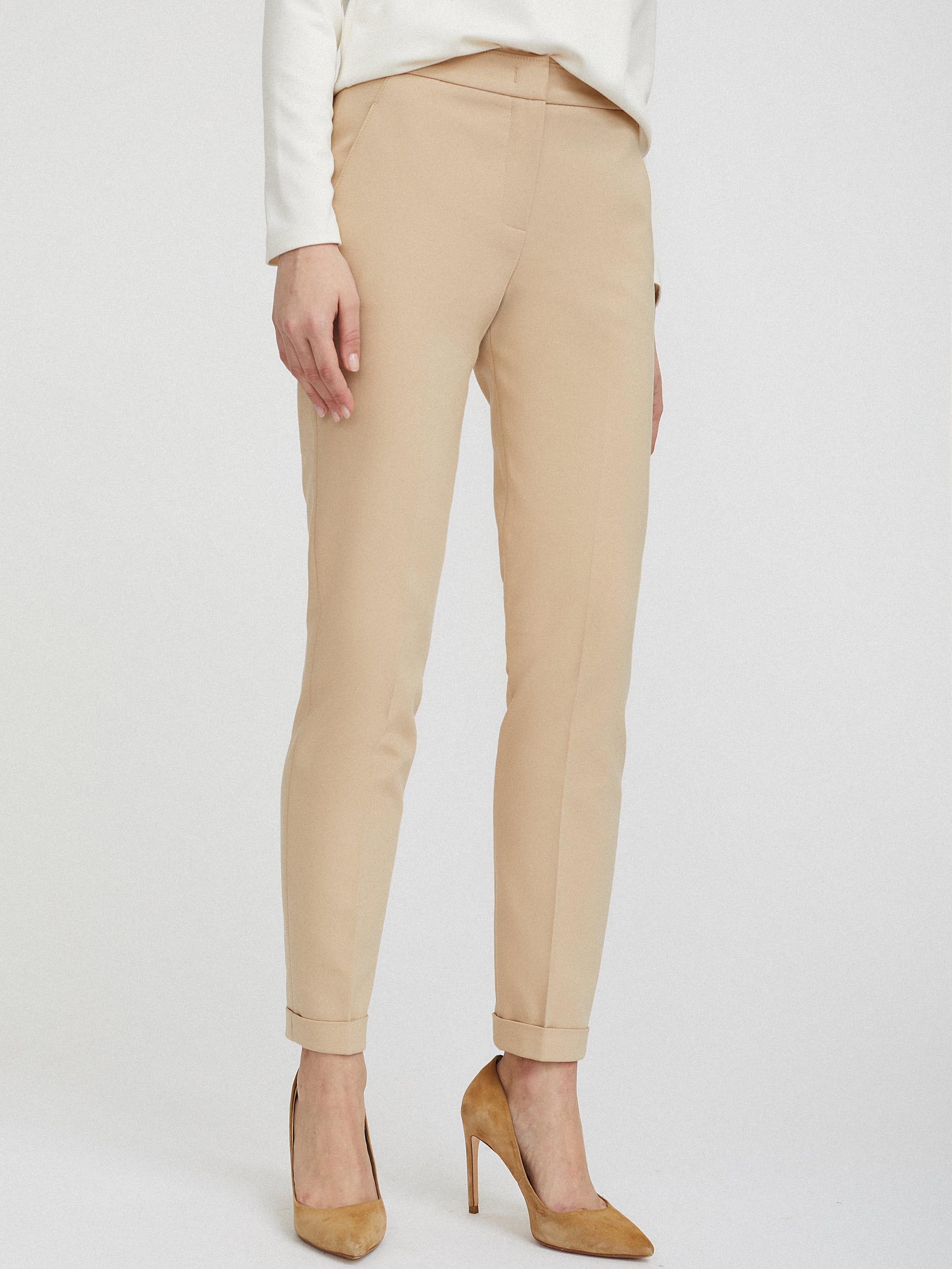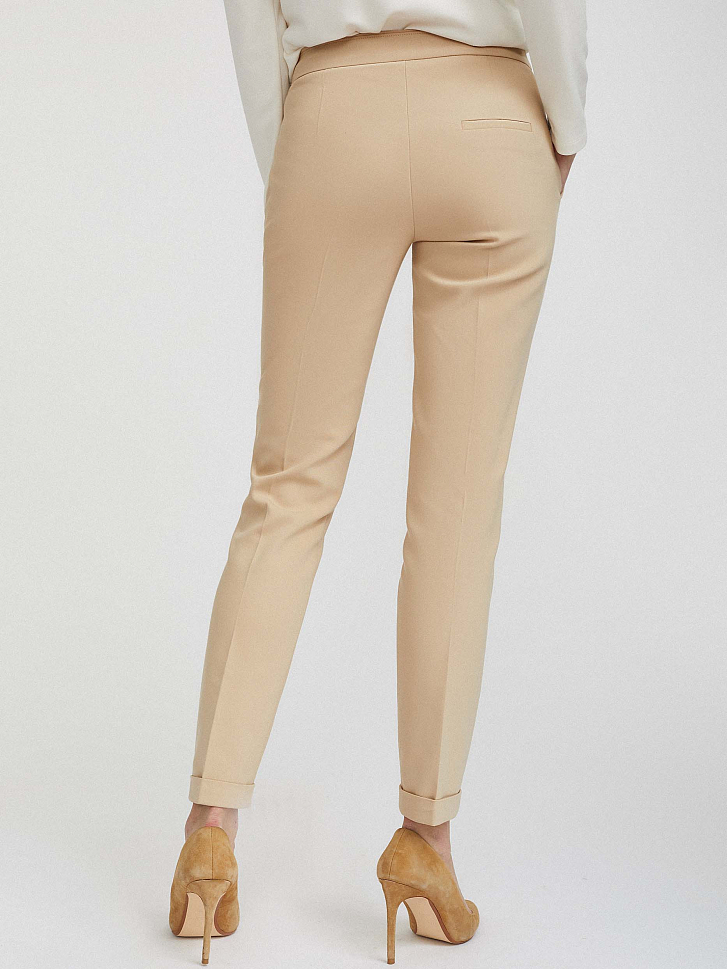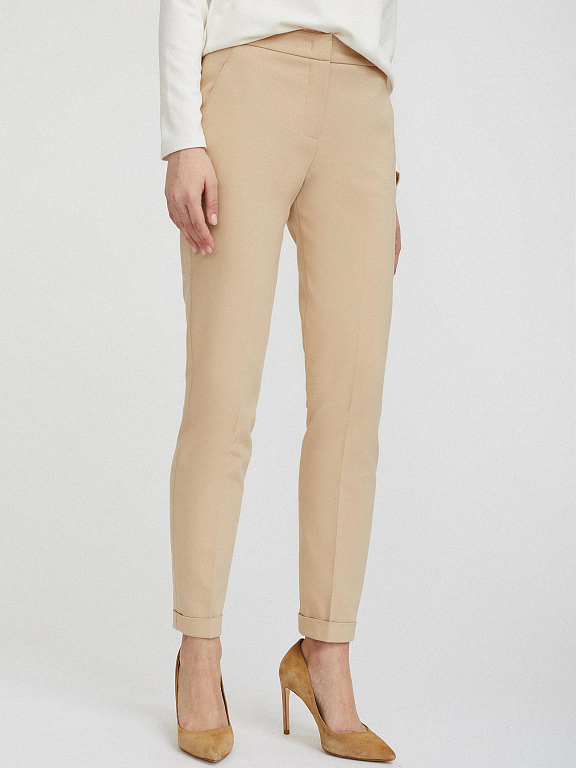 Однотонные брюки зауженного кроя. Средняя посадка, втачной пояс, боковые карманы, декоративный карман сзади, отвороты по нижнему краю.