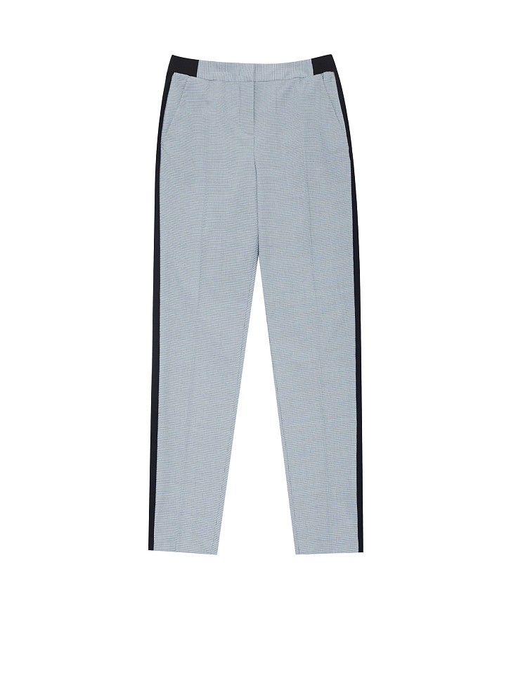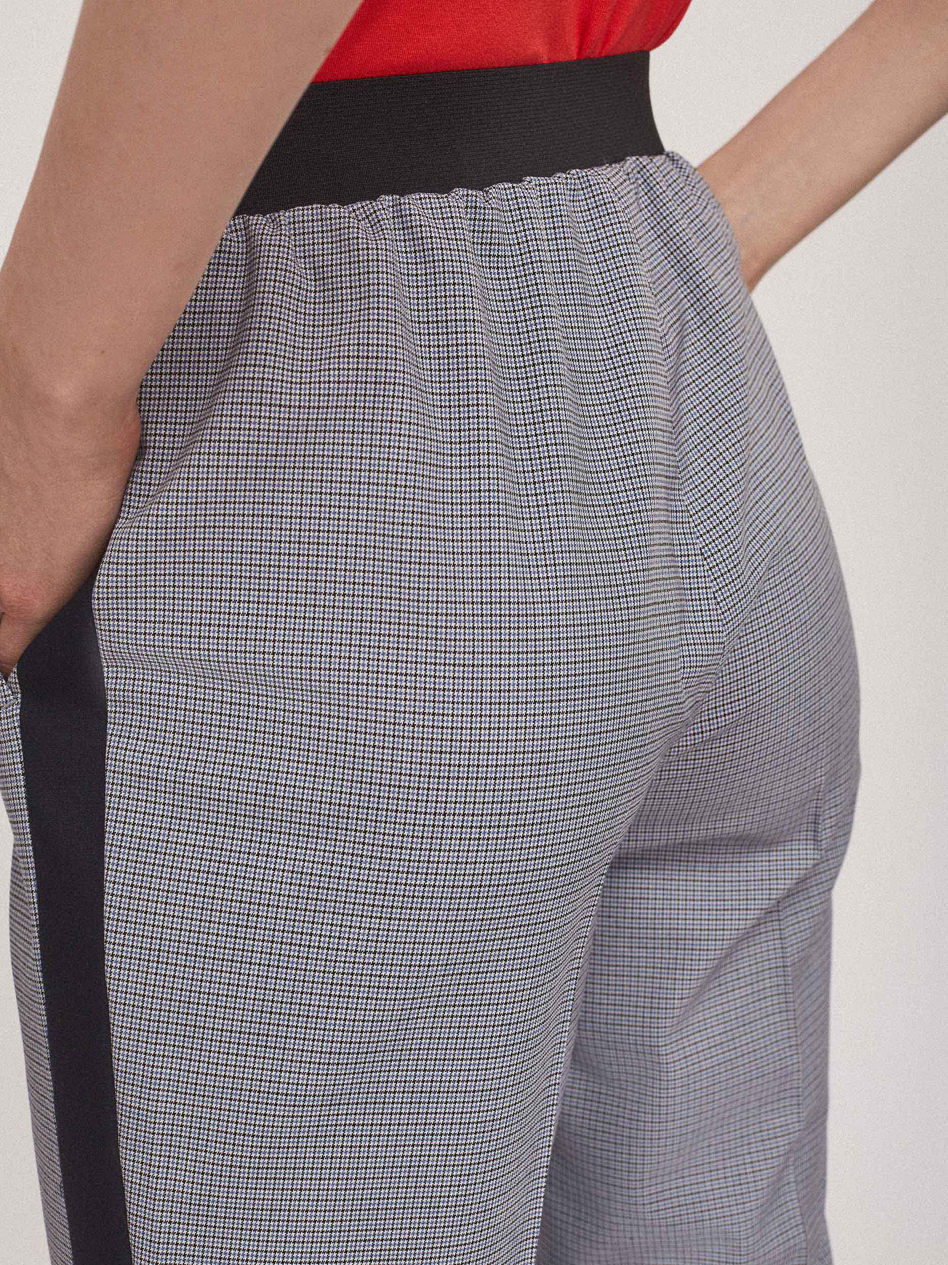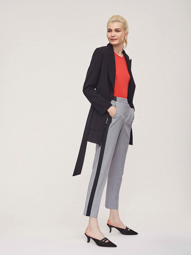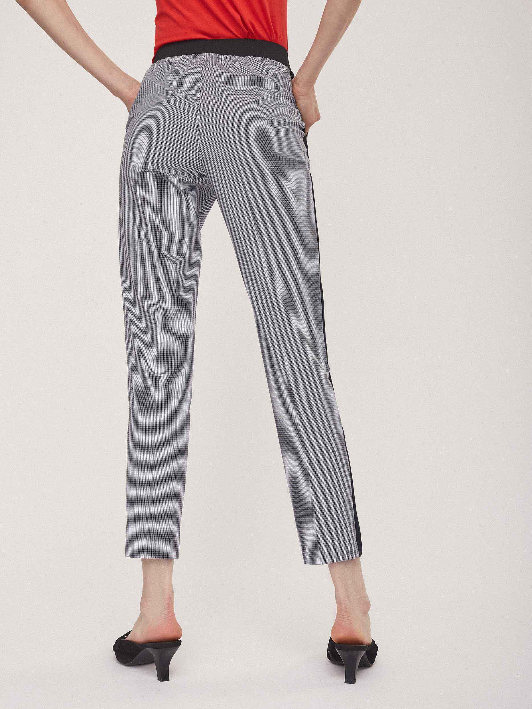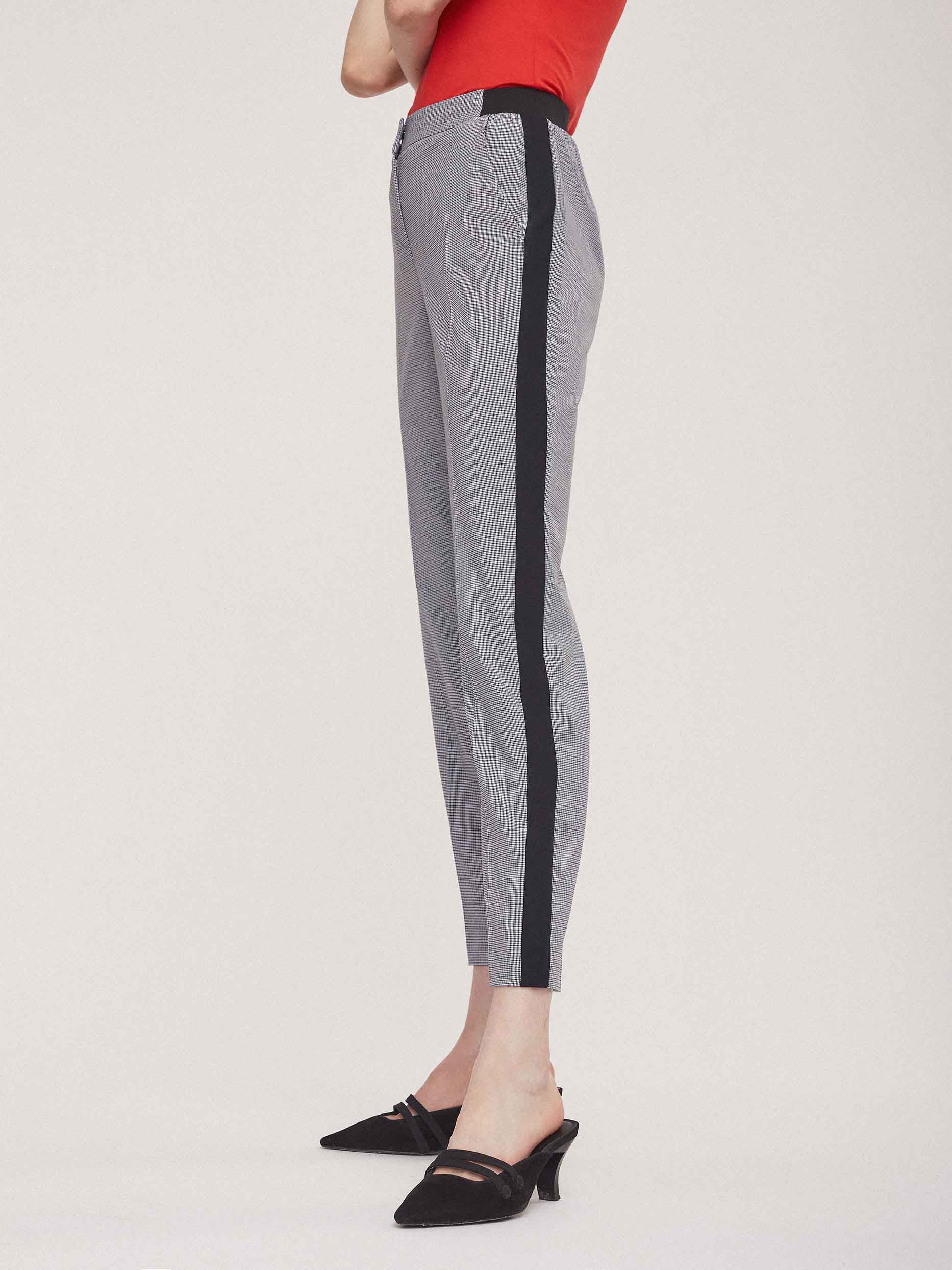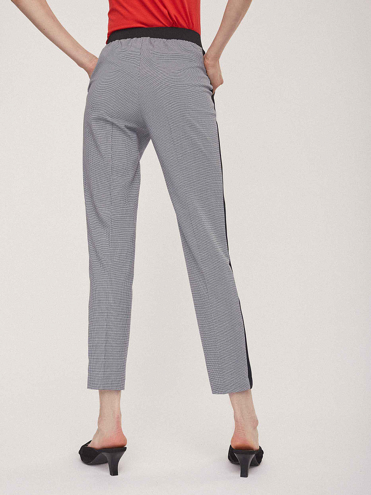 Брюки зауженного кроя с контрастными лампасами и поясом на эластичной резинке. Боковые карманы.