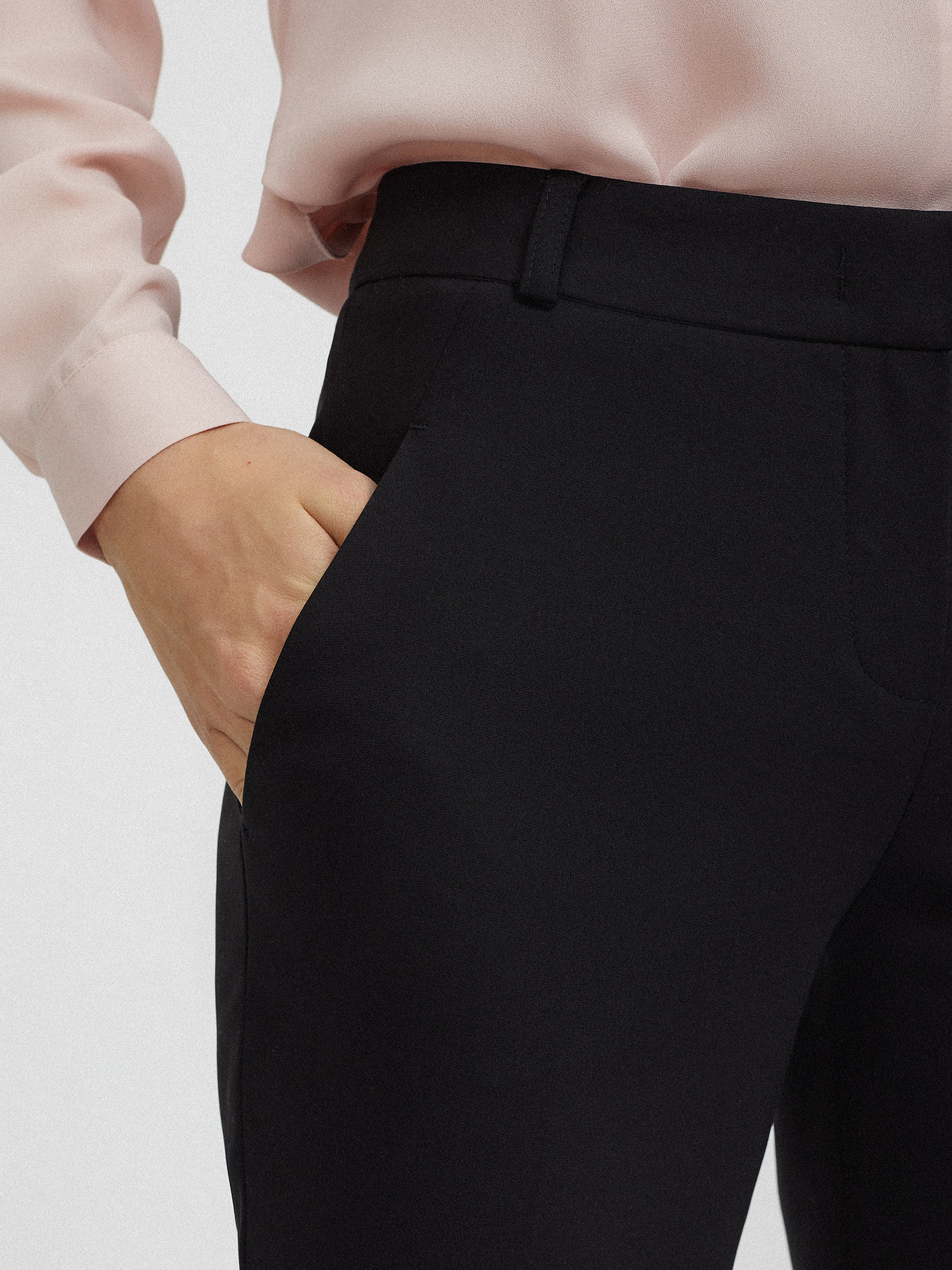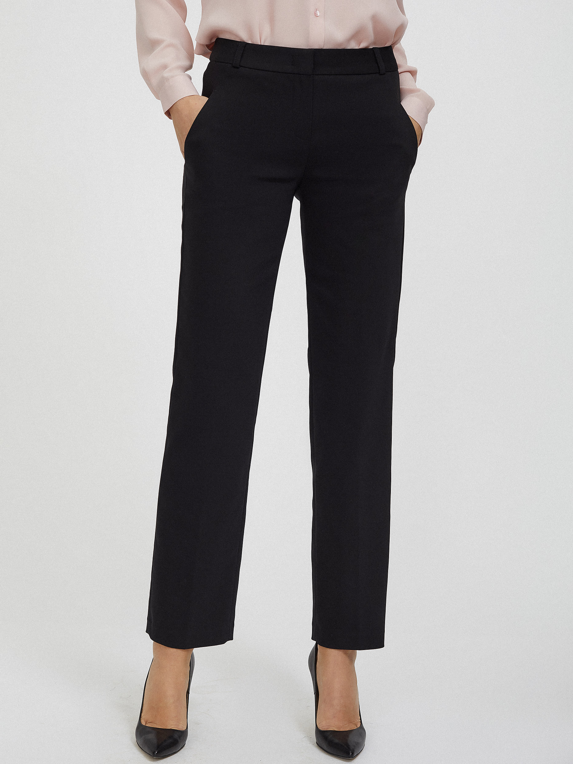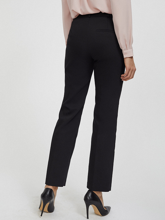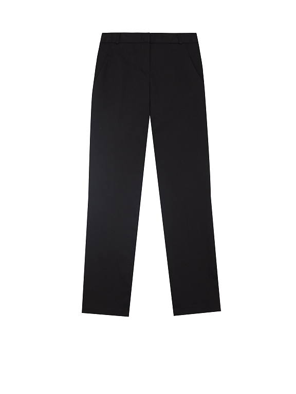 Однотонные брюки прямого кроя из смесового хлопка. Высокая посадка, втачной пояс со шлевками для ремня, боковые карманы, декоративный карман сзади.