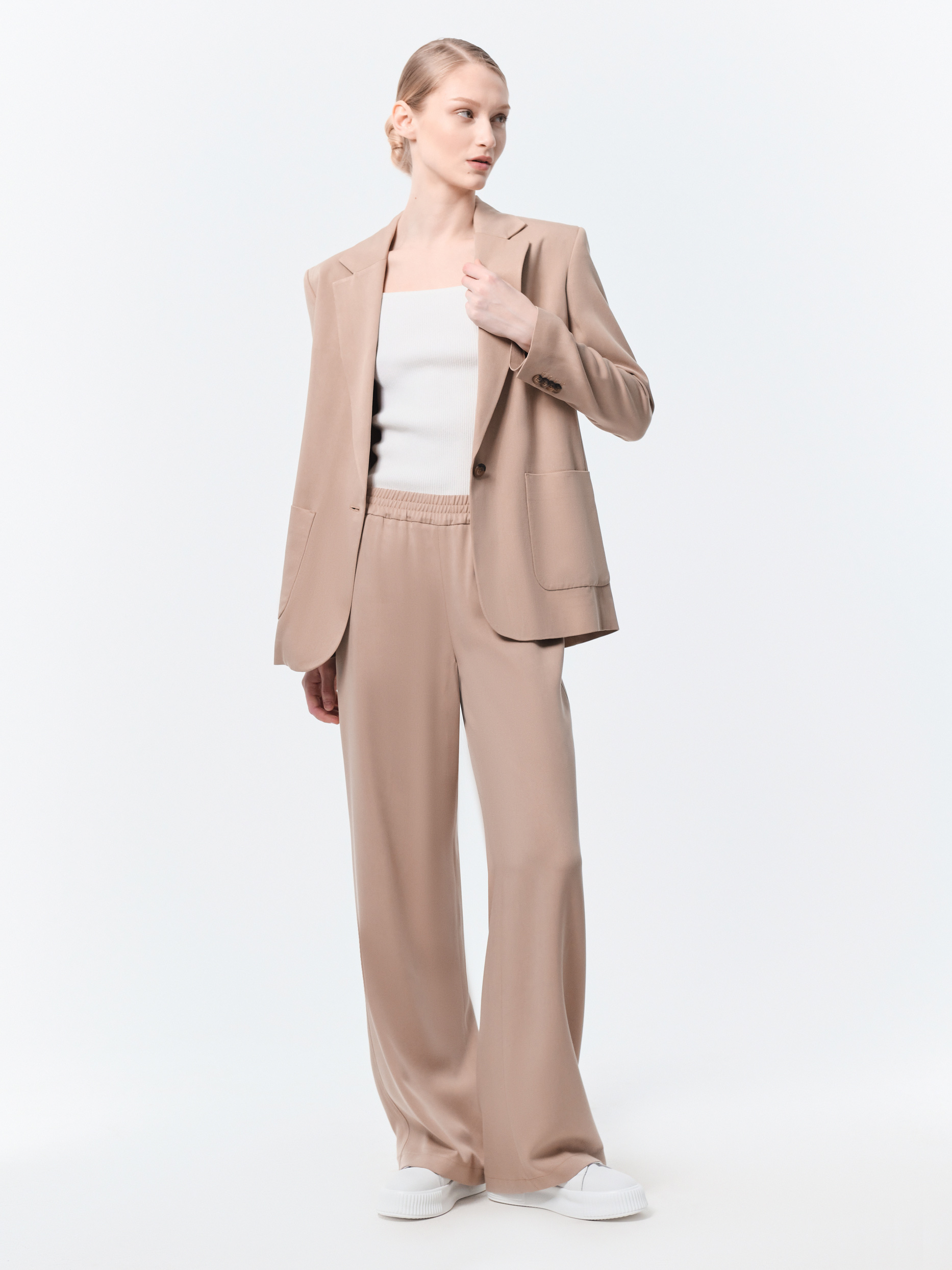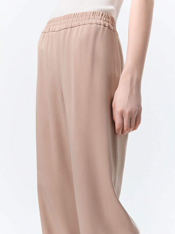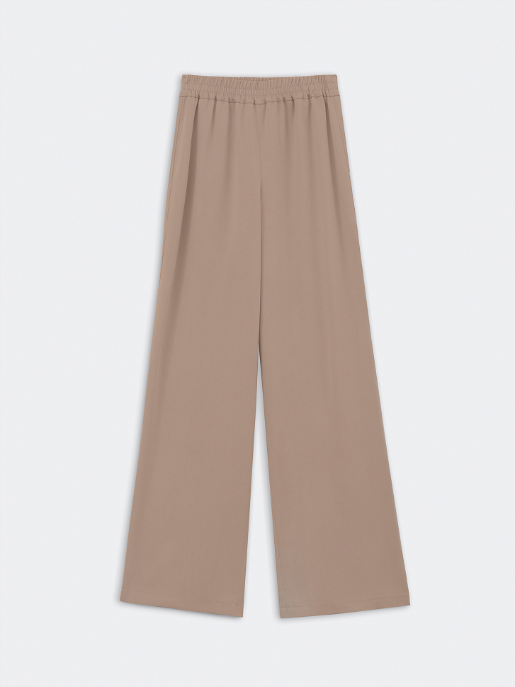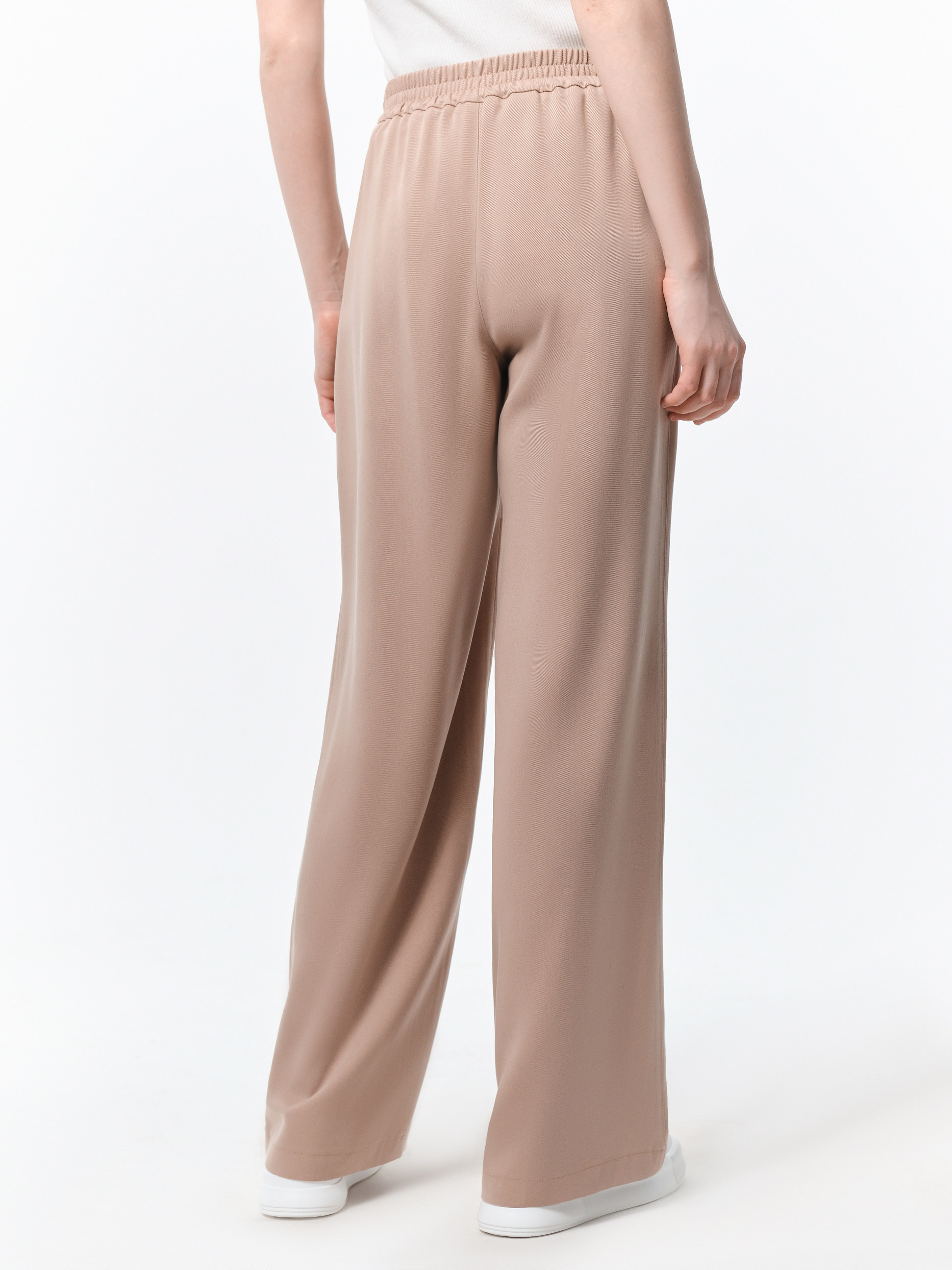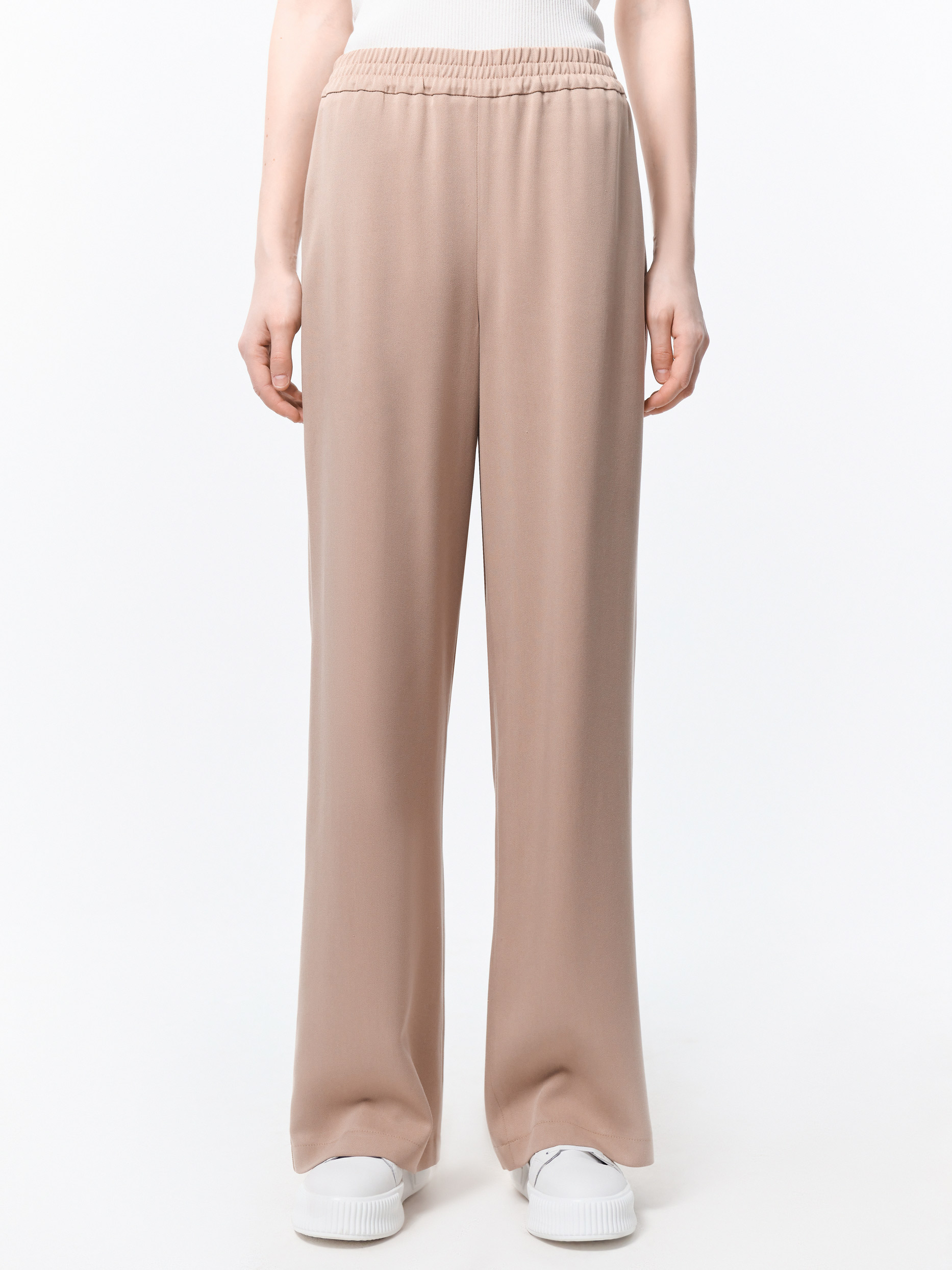 Прямые брюки с высокой посадкой будут одинаково стильно смотреться в спортивных образах с кроссовками, или в кэжуальных нарядах с обувью на каблуке. Струящаяся ткань из натуральных древесных волокон не просвечивает и не растягивается. Широкий эластичный пояс на резинке создает комфортную посадку.