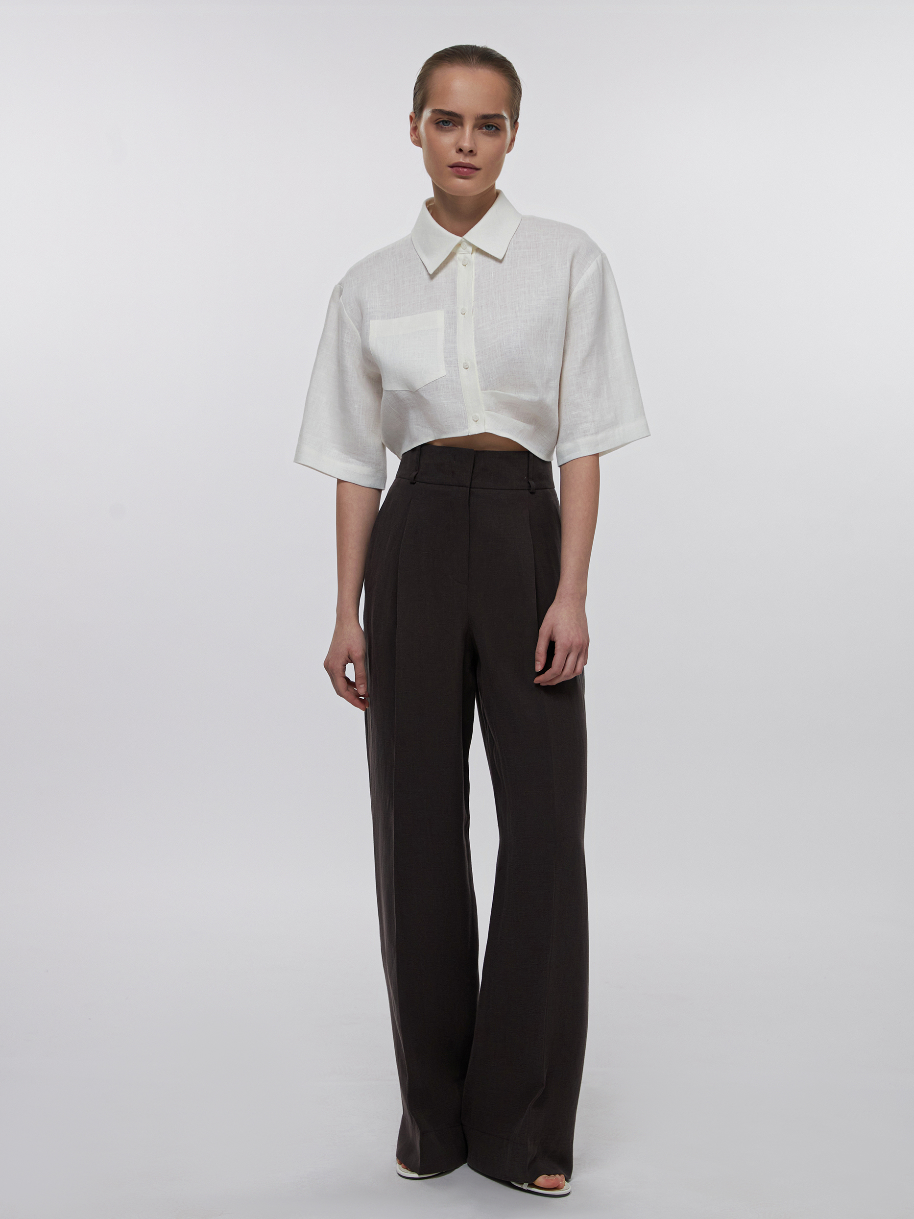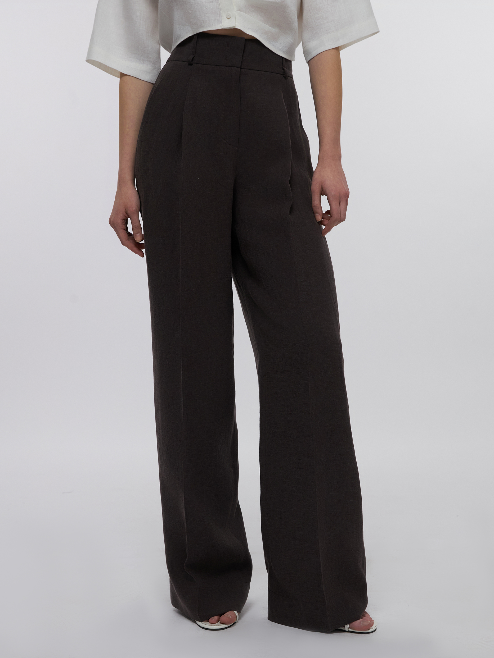 Свежий взгляд на классические брюки: свободный крой, высокая посадка и длина в пол создают расслабленный образ. Легкая ткань из натуральных волокон тенселя и льна обеспечивает комфорт в жаркие дни. Акцентируйте линию талии тонким плетеным шнурком или добавьте ремень.