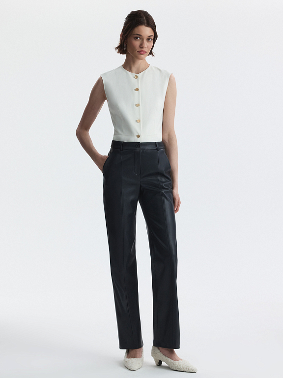 Брюки из экокожи – эффектный способ разбавить базовый гардероб. Изделие из мягкой искусственной кожи позволяет телу дышать, а удобная посадка обеспечивает комфорт в движении. Брюки легко впишутся в любой образ и составят стильные комбинации с как с джемперами, так и с блузами и футболками.