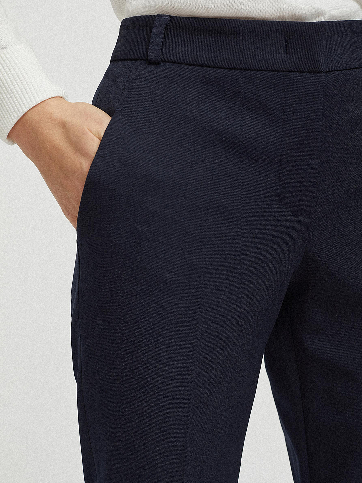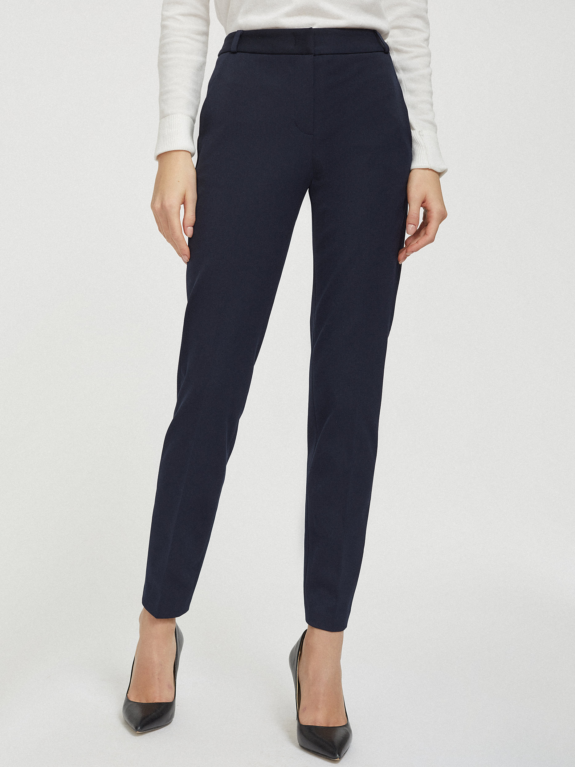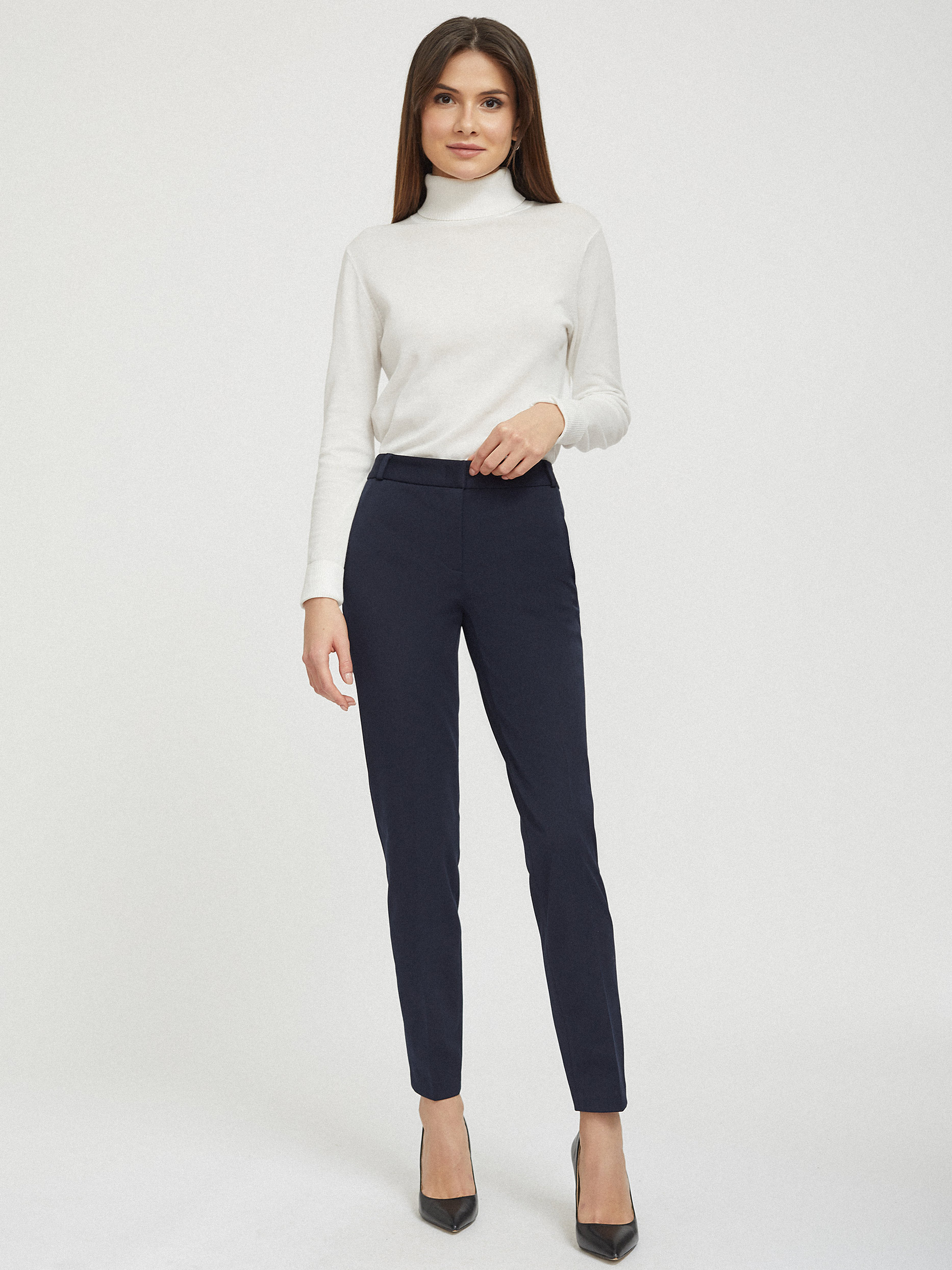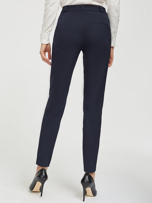 Однотонные брюки, выполненные из эластичной ткани. Облегающий крой, средняя посадка, прорезные карманы по бокам, декоративный карман сзади.