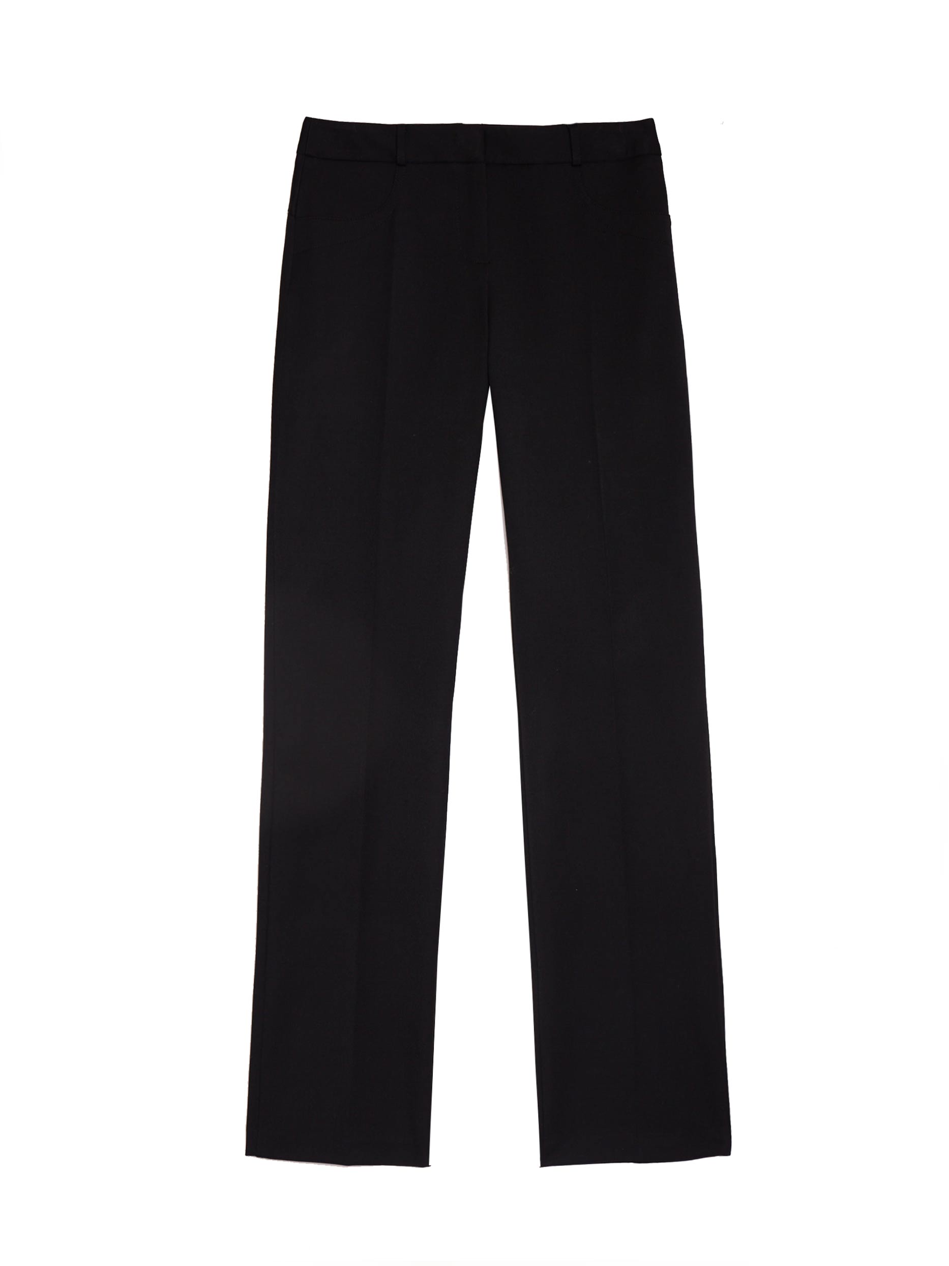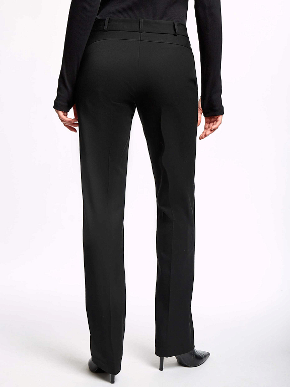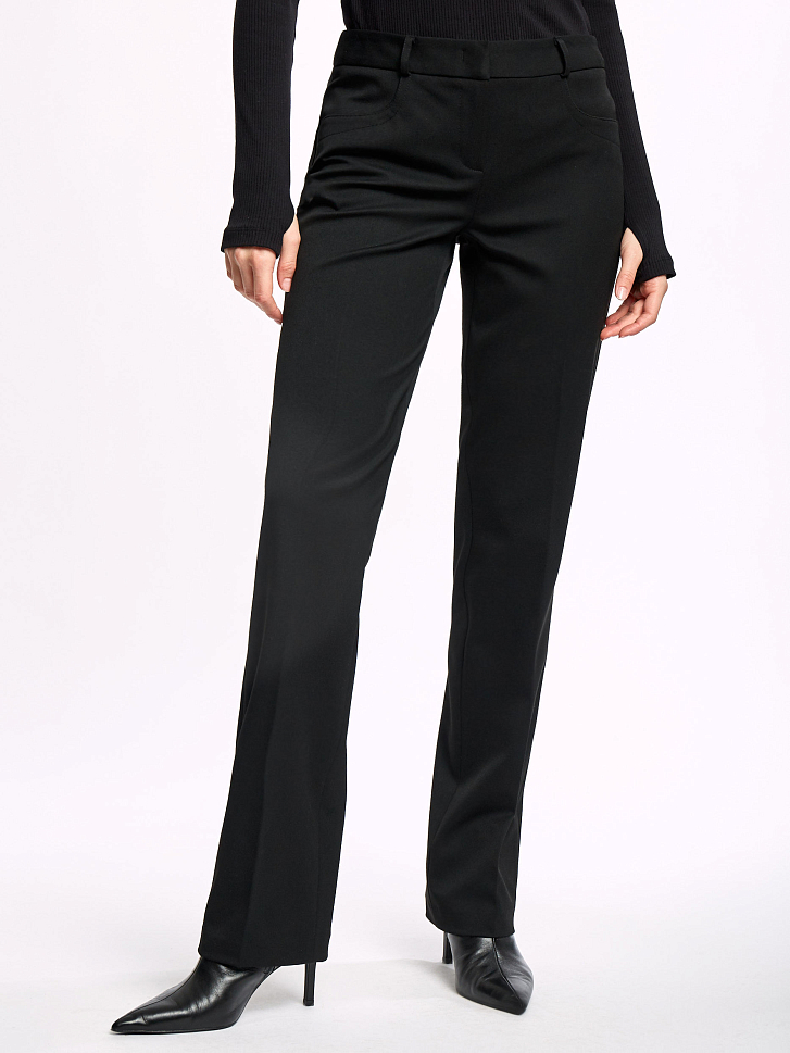 Брюки прямого кроя, выполненные из смесовой вискозы. Высокая посадка, втачной пояс, декоративные карманы по бокам.