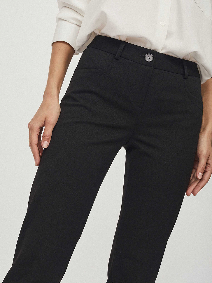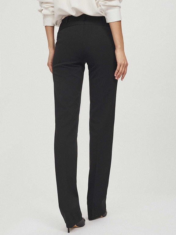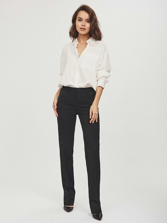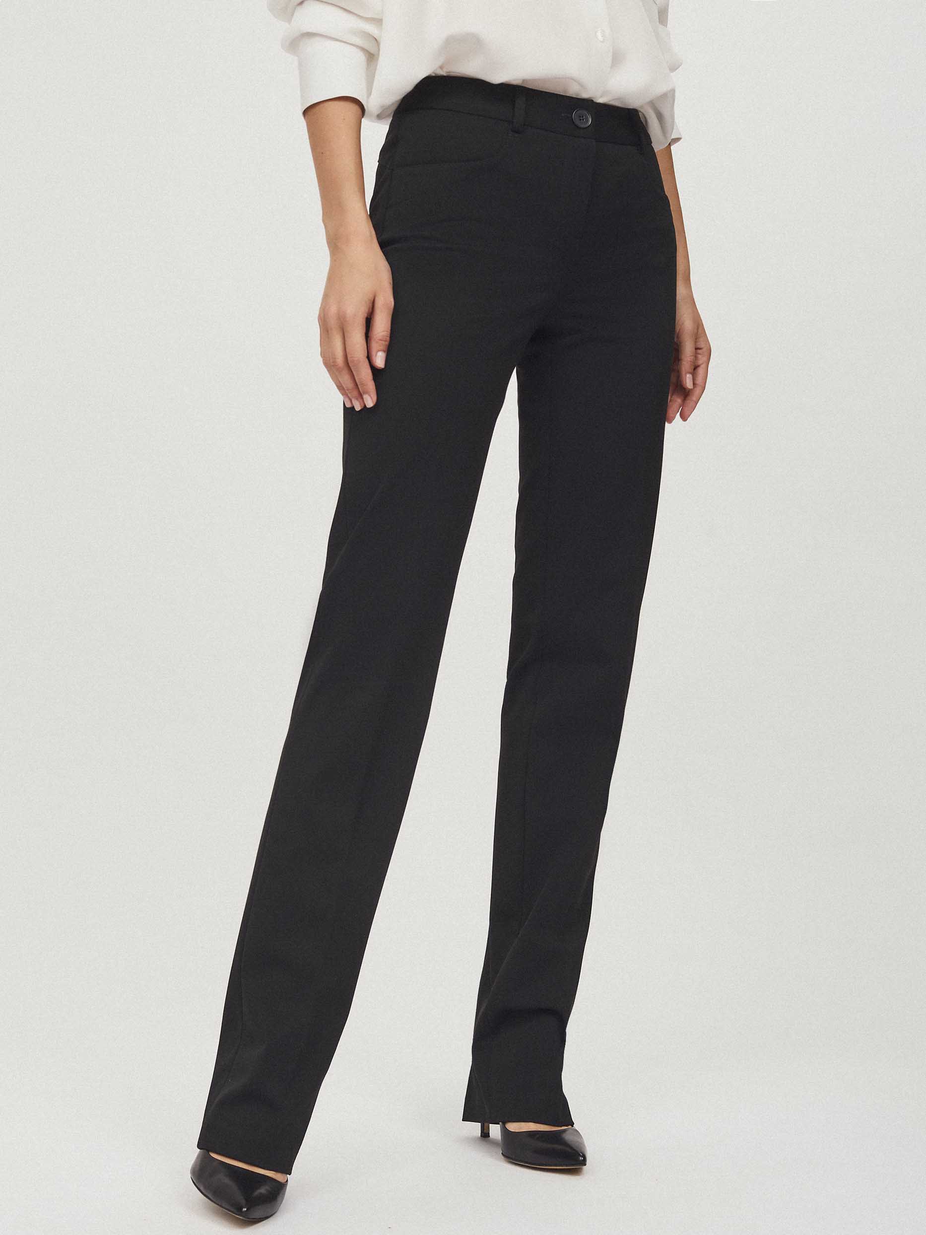 Однотонные брюки, выполненные из эластичной смесовой вискозы. Прямой крой, высокая посадка, втачной пояс, декоративные карманы.