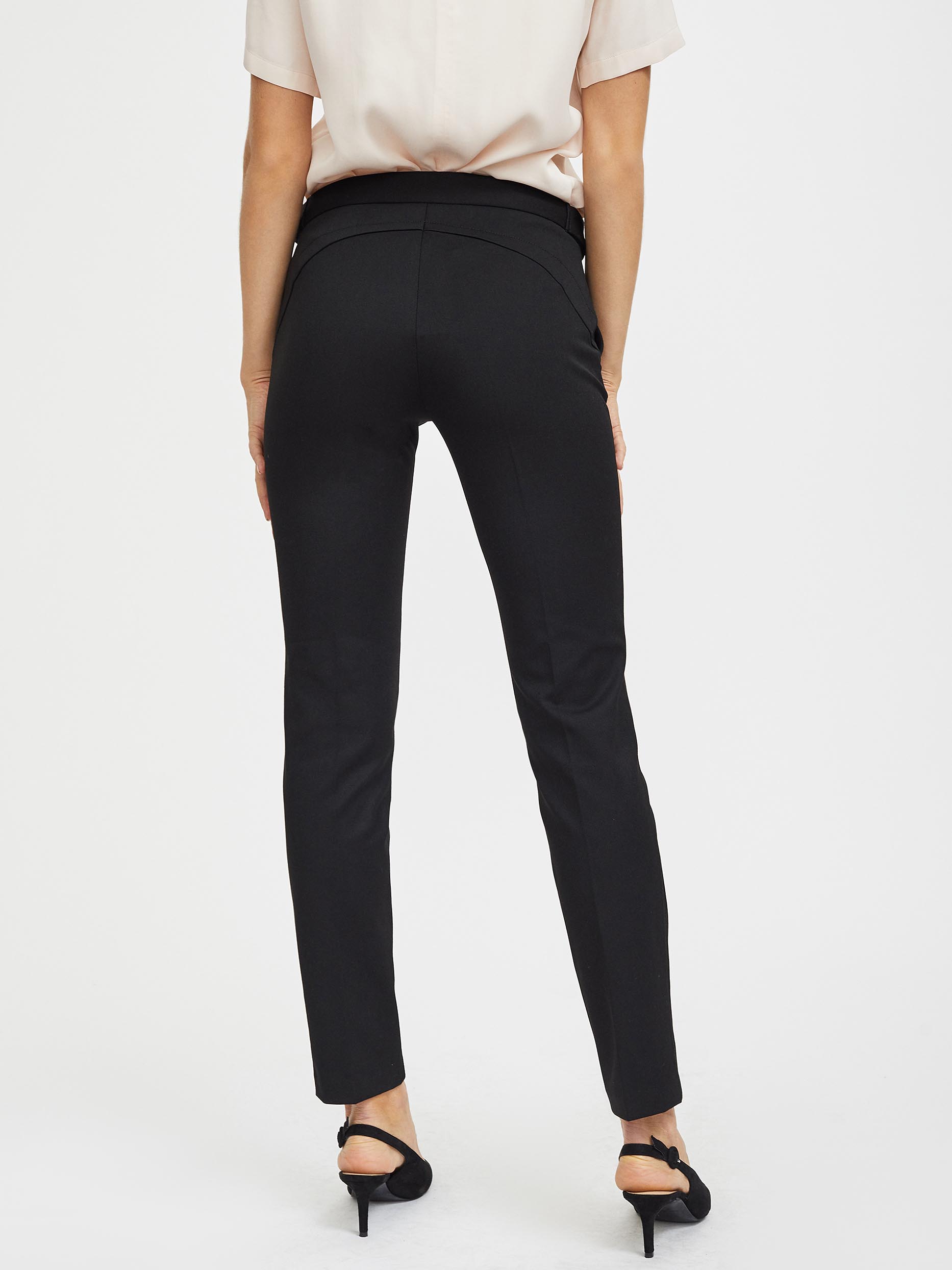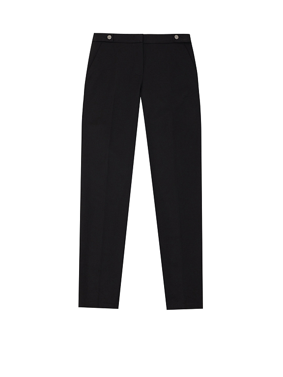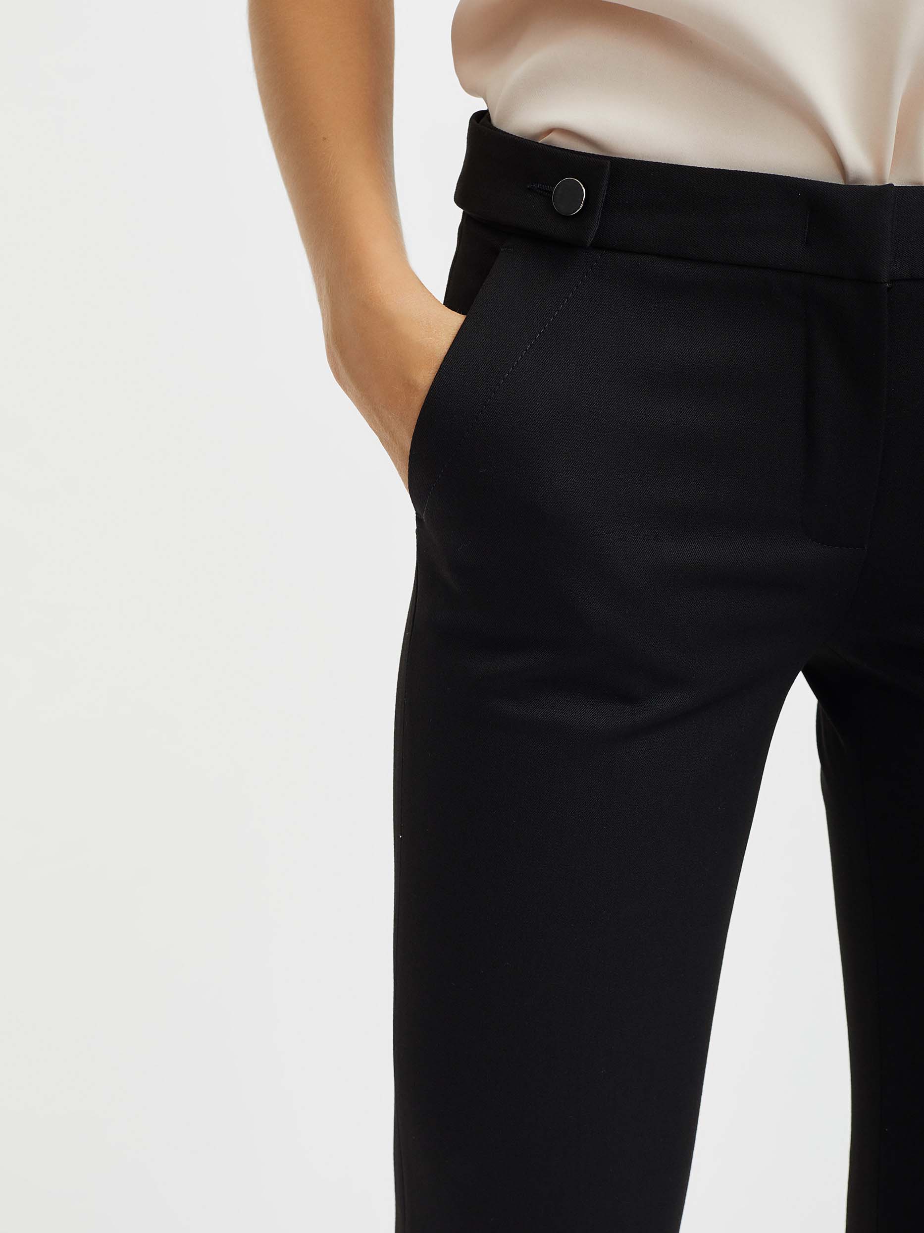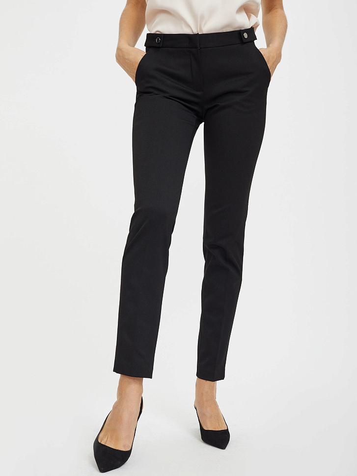 Однотонные брюки из эластичной ткани. Облегающий силуэт, средняя посадка, втачной пояс с планками на пуговицах, боковые карманы.