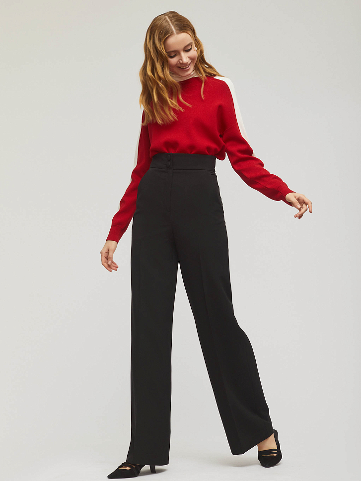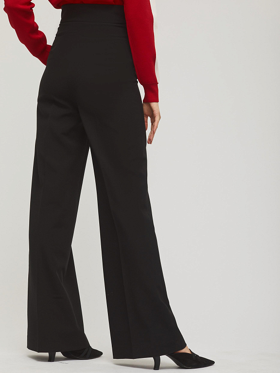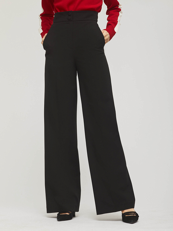 Широкие брюки высокой посадки. Втачной пояс, прорезные карманы по бокам. Застегивается на молнию и обтянутые пуговицы.