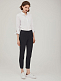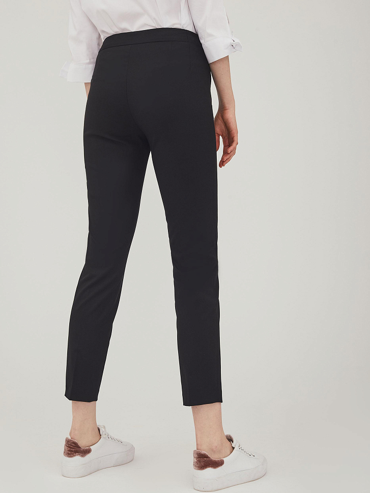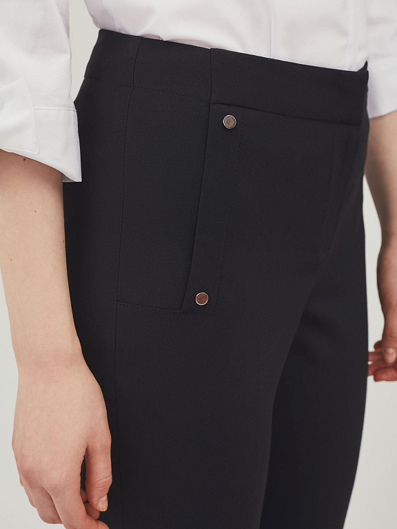 Зауженные брюки  с ложными  карманами с листочкой и металлическими хольнитенами. Брюки с отделочной строчкой в цвет. Брюки застёгиваются на молнию и крючки, скрытые планкой. Изделие без подкладки. Рост модели 177 см, размер 42 (российский). Плотность ткани: 270 г/м2