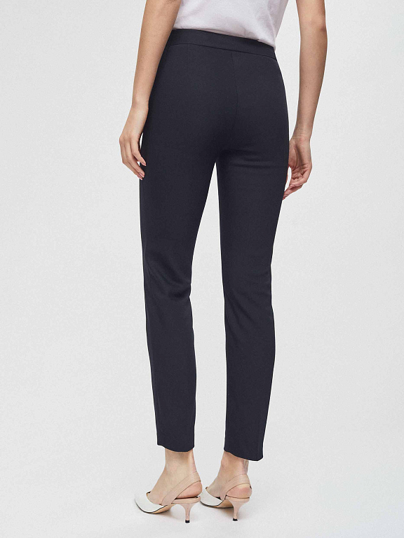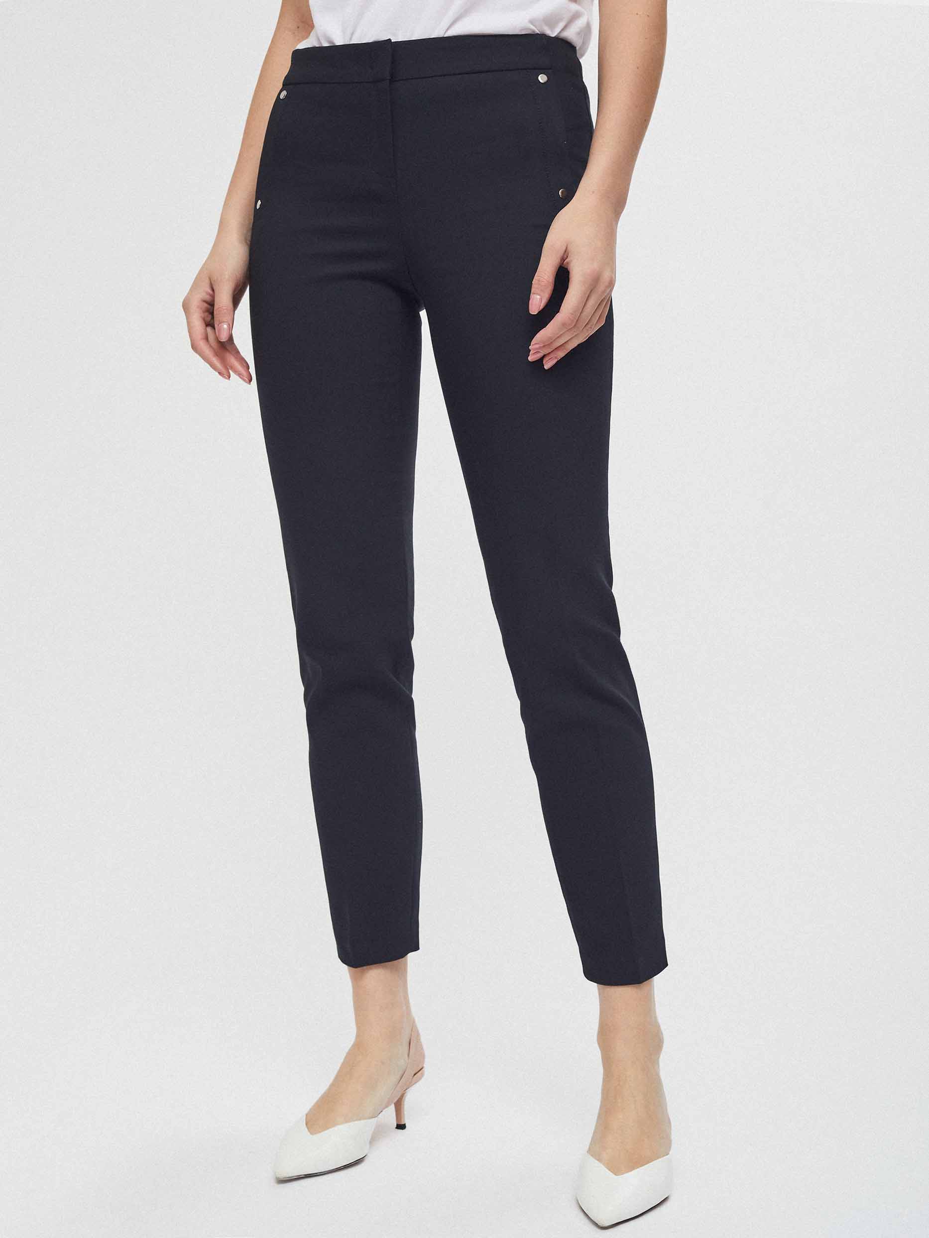 Укороченные брюки зауженного кроя. Средняя посадка, втачной пояс, прорезные карманы по бокам с декоративными заклепками.