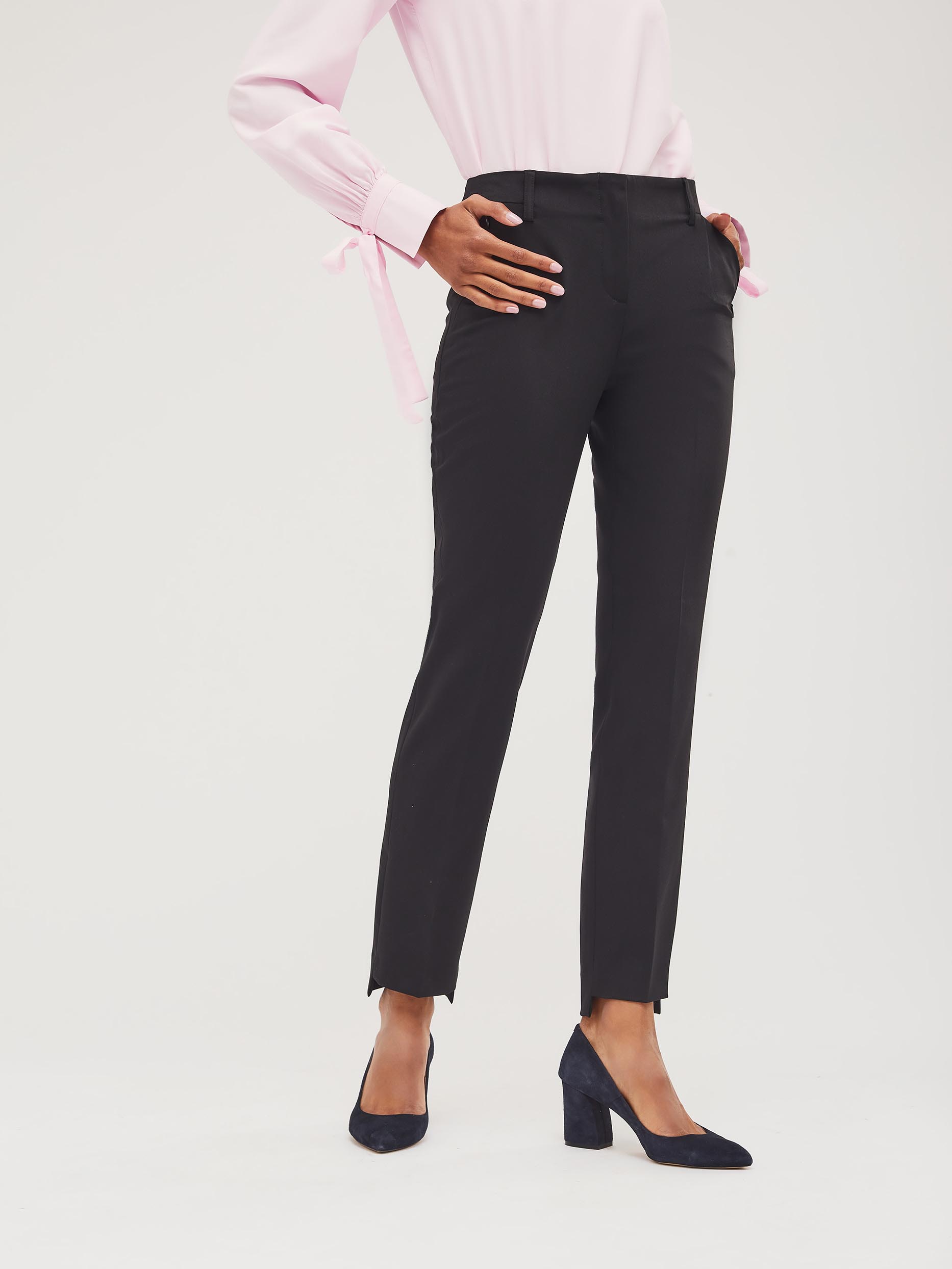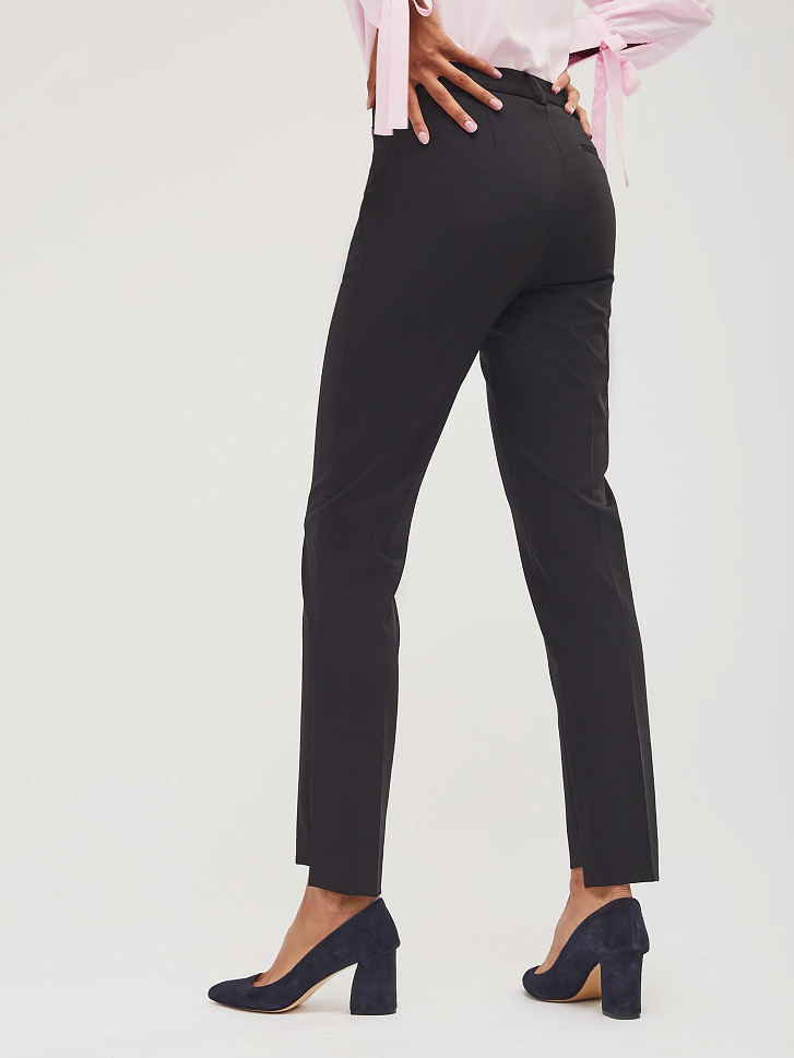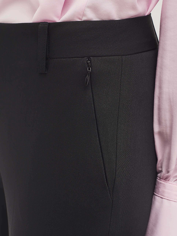 Зауженные  брюки из поливискозы  с фигурным нижним  краем. Брюки с боковыми карманами на молнии. На талии есть шлёвки для ремня. Изделие с ложным карманом-листочкой сзади. Изделие без подкладки.  Рост модели 173 см, размер 42 (российский)