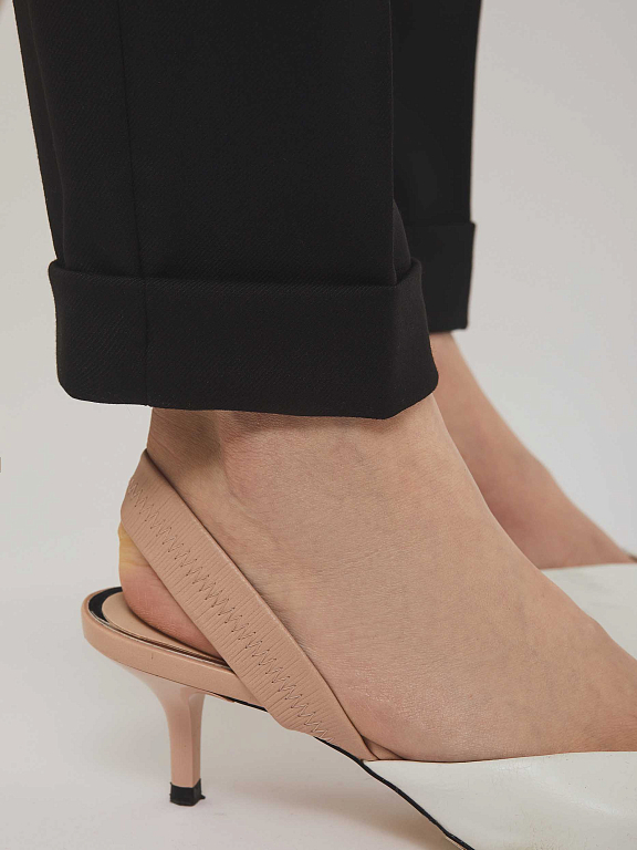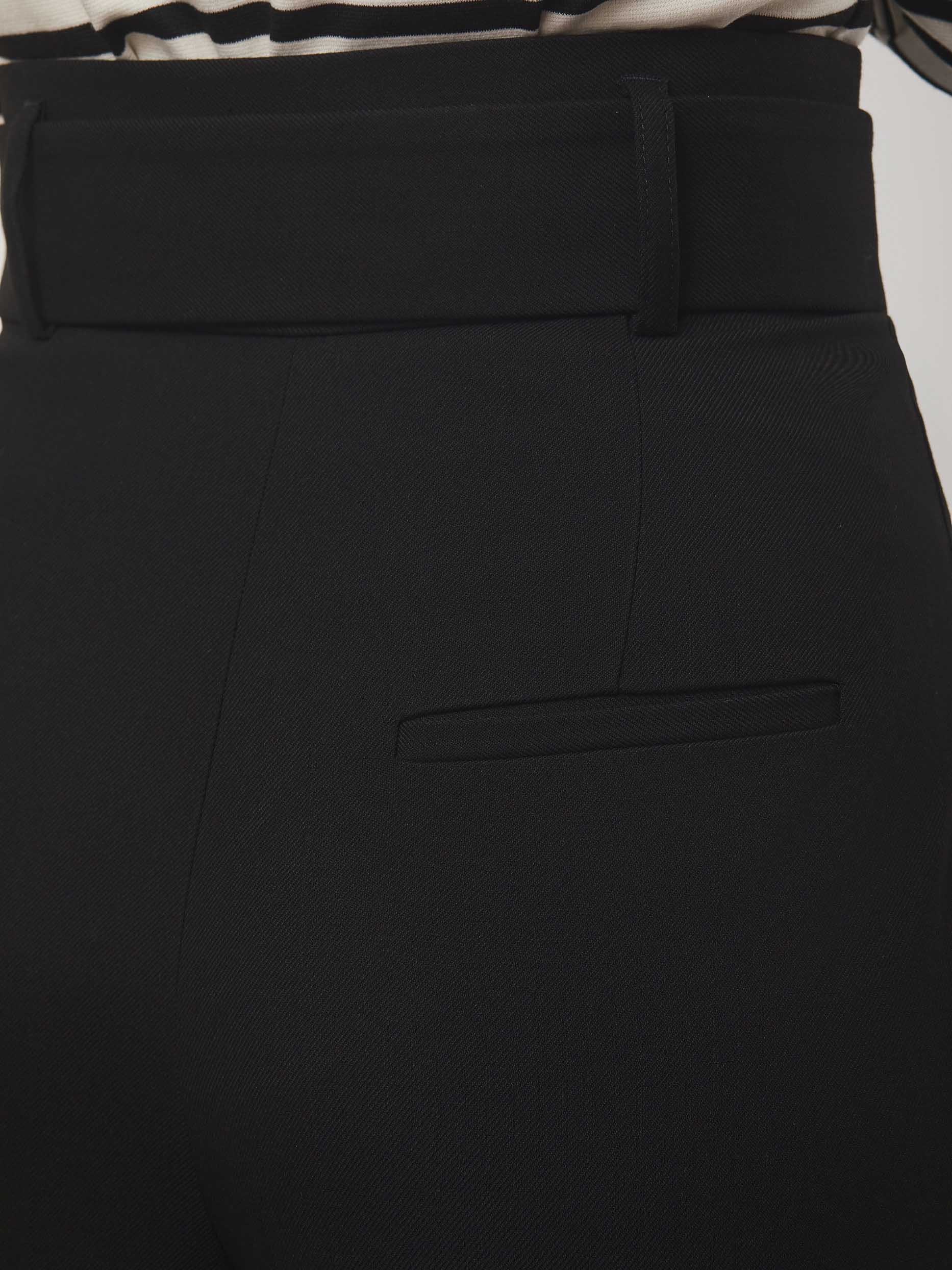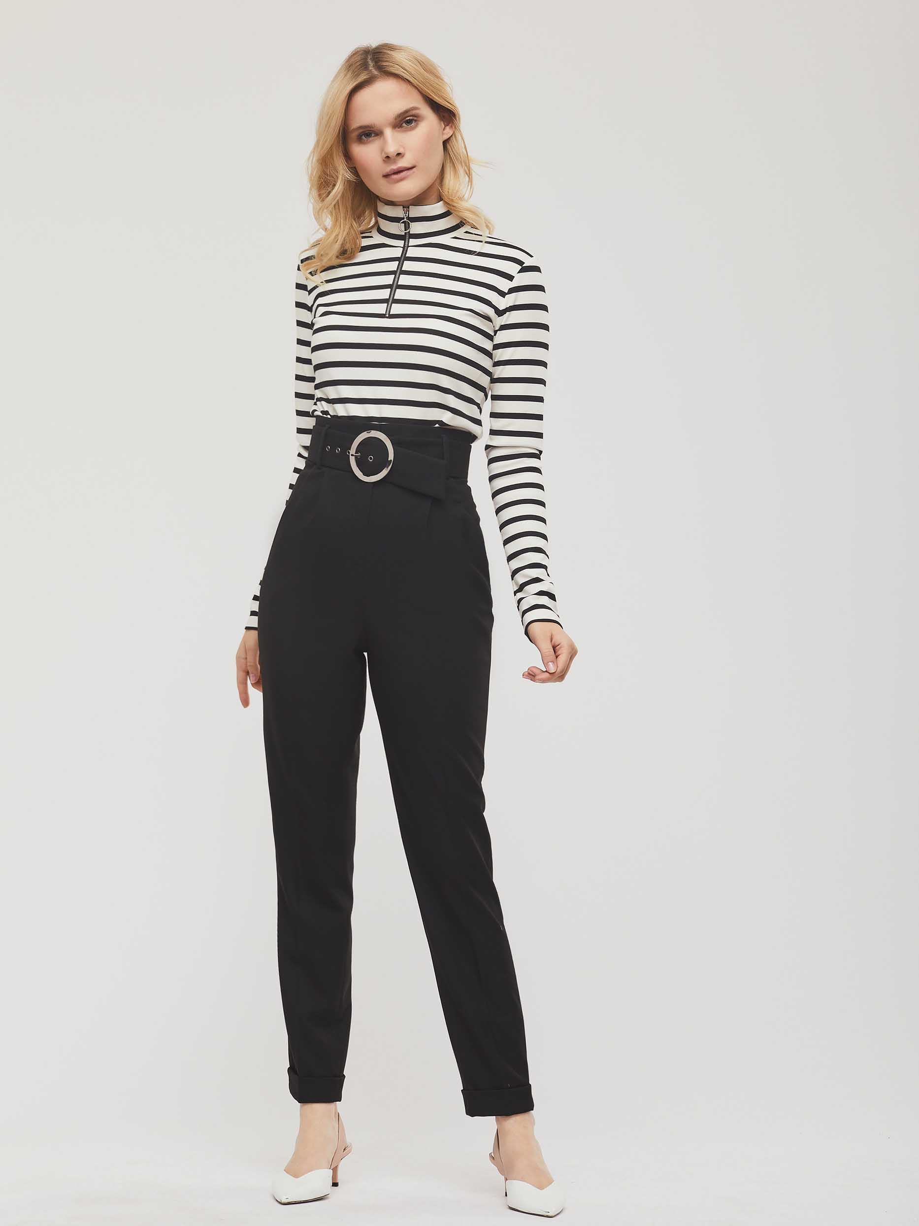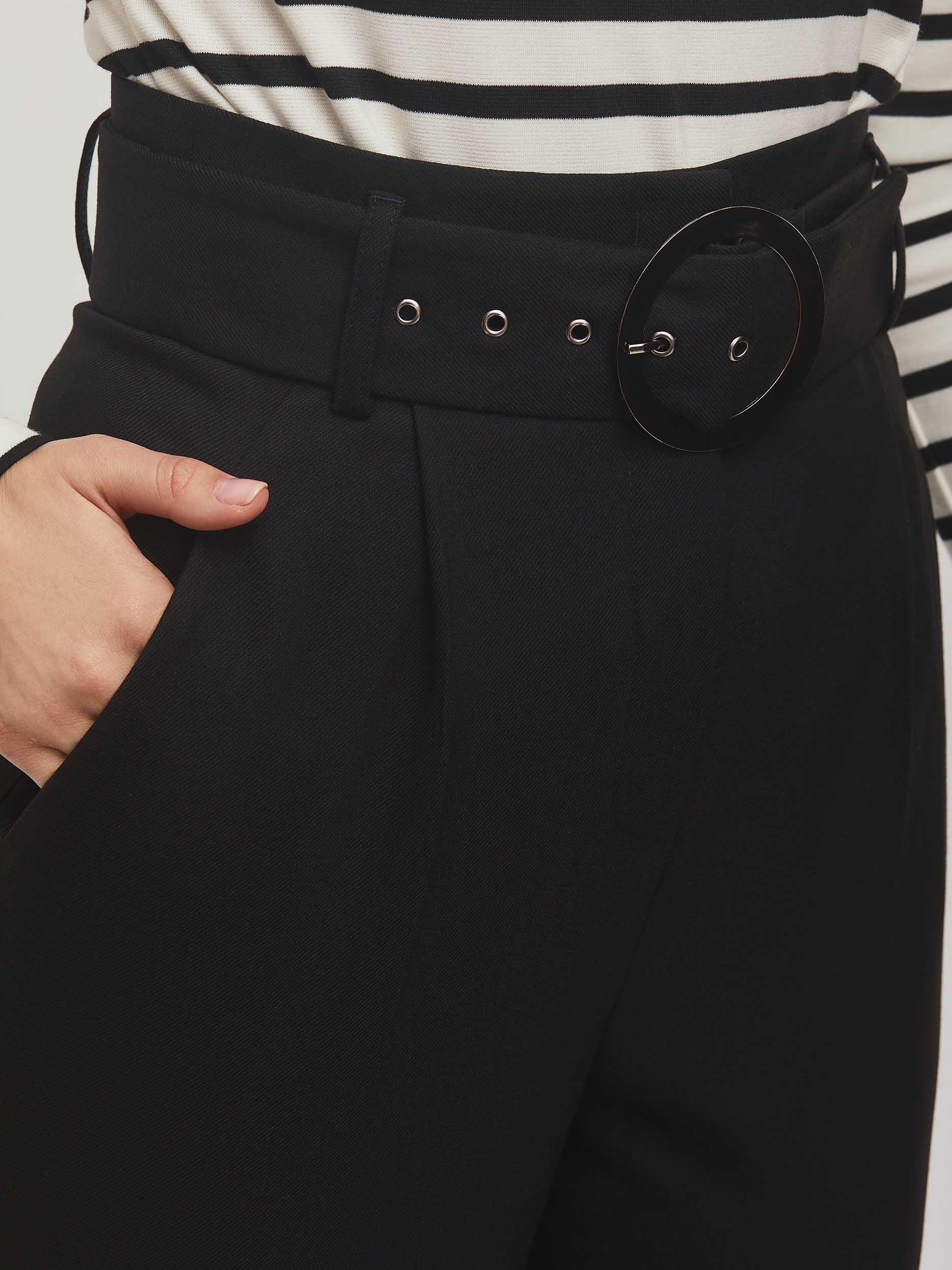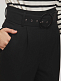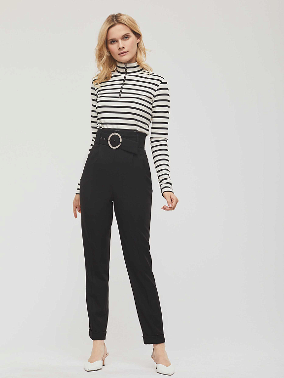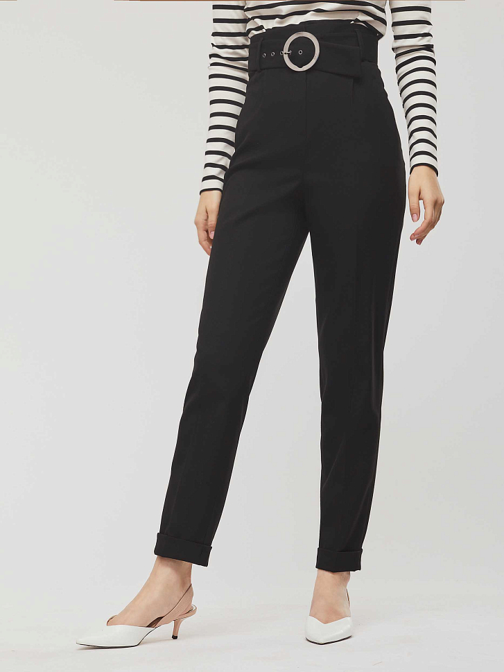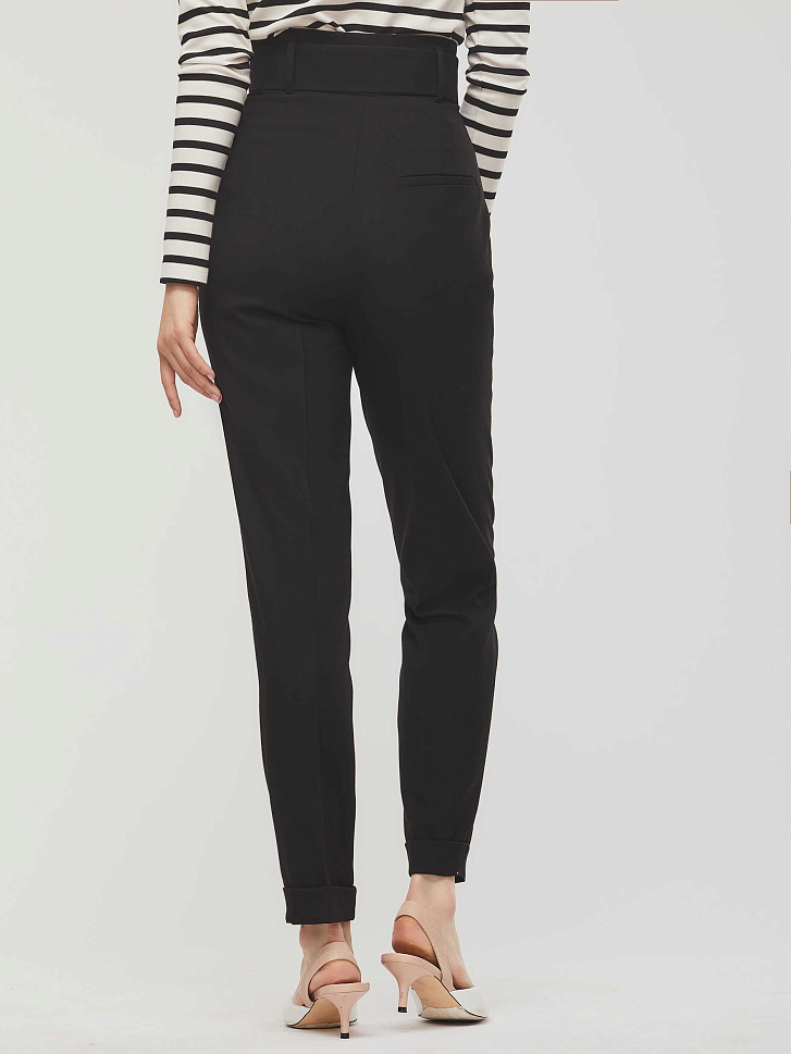 Зауженные брюки высокой посадки с зашитыми отворотами снизу. Изделие с заглаженными стрелками, боковыми карманами и широким поясом в цвет из основной ткани.  На талии заложены складки. Сзади ложный прорезной карман с листочкой. Застёжка на крючок, молнию и пуговицу. Изделие без подкладки.  Рост модели 176 см, размер 42 (российский). Плотность ткани: 260 г/м2