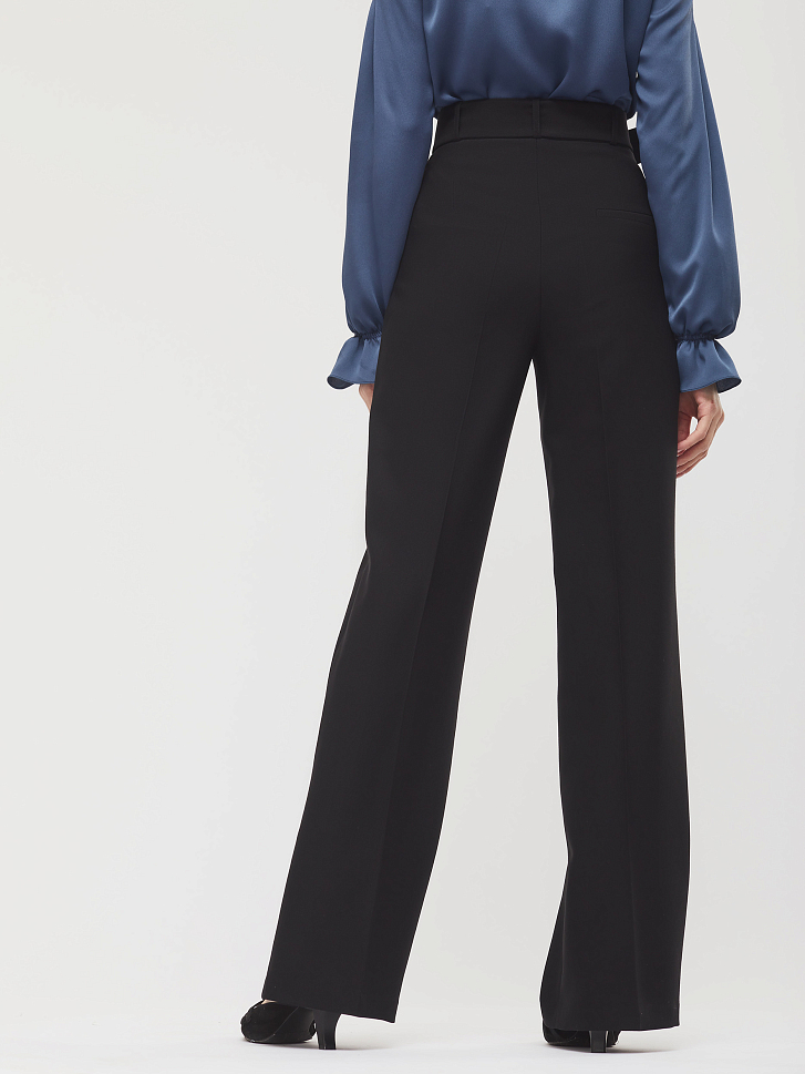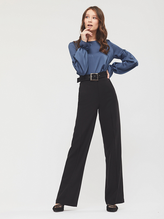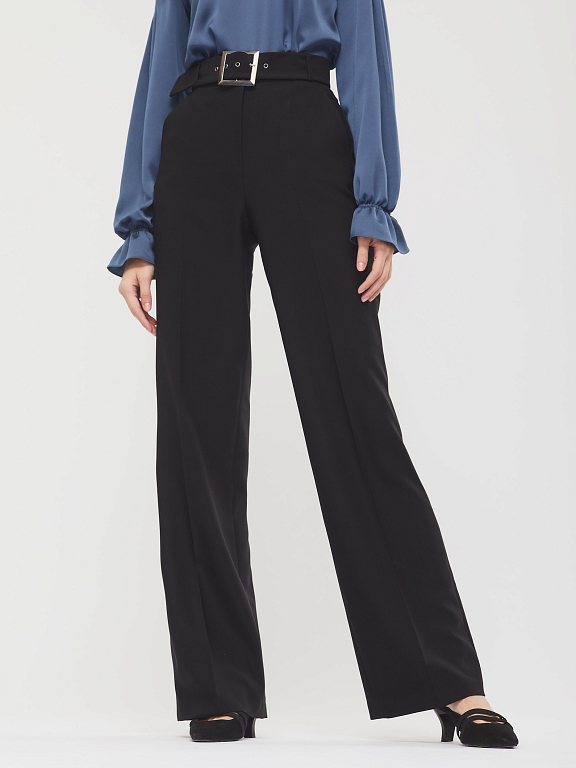 Широкие брюки из поливискозы высокой посадки. Изделие с заглаженными стрелками, боковыми карманами и поясом в цвет из основной ткани. Сзади ложный прорезной карман с листочкой. Застёжка на крючок, молнию и пуговицу. Изделие без подкладки. Рост модели 173 см, размер 42 (российский). Плотность ткани: 220 г/м2