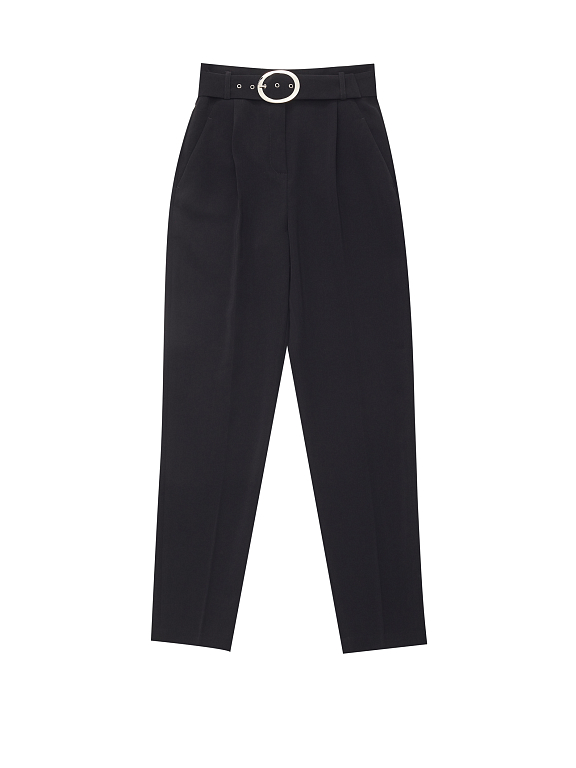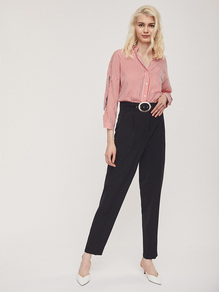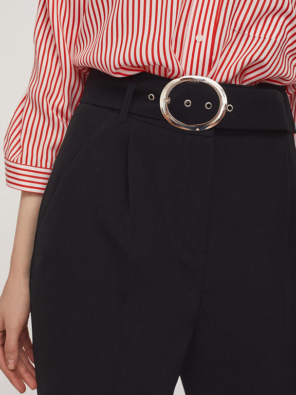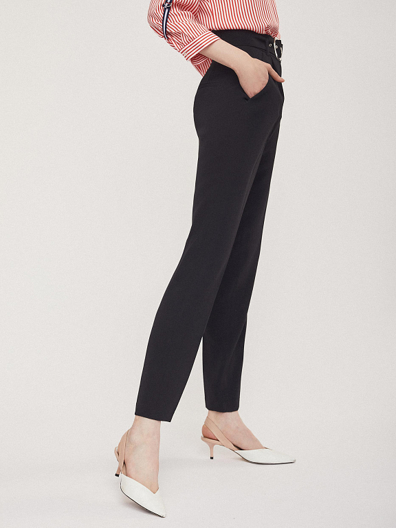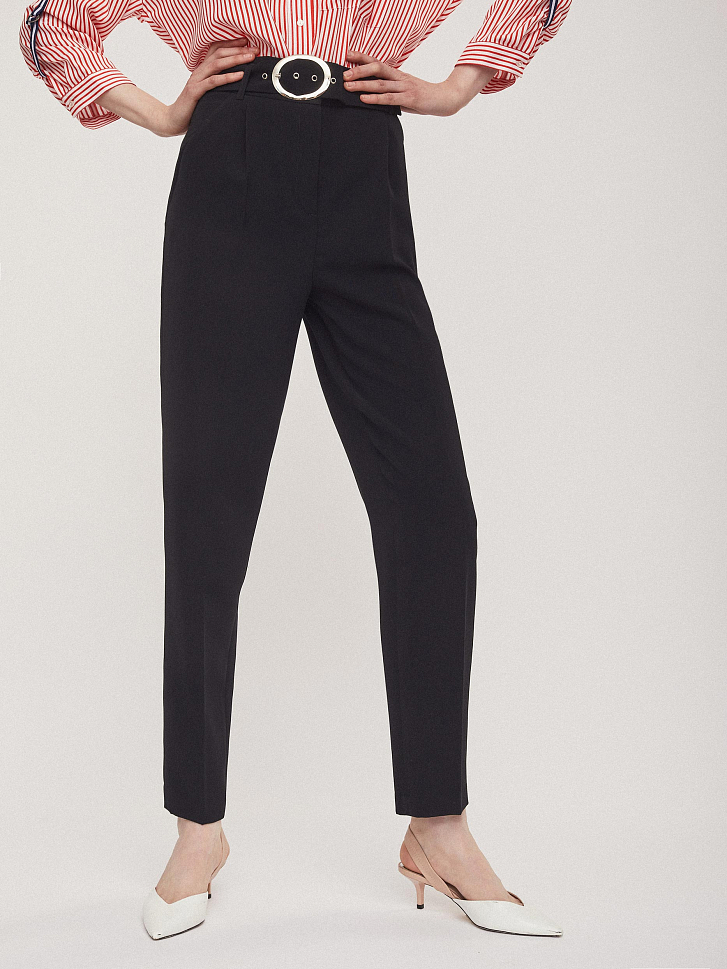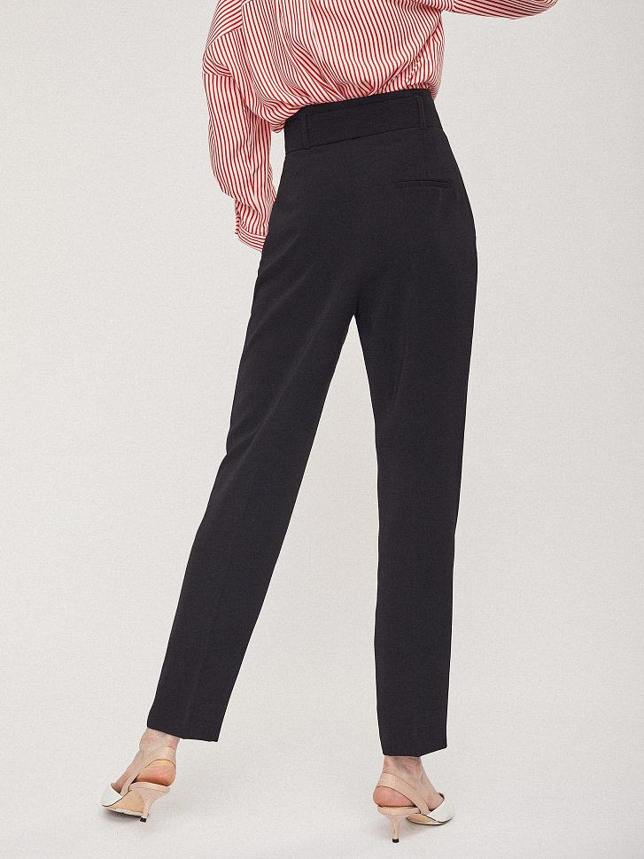 Брюки зауженного кроя на талии с поясом. Боковые карманы. На талии заложены складки.