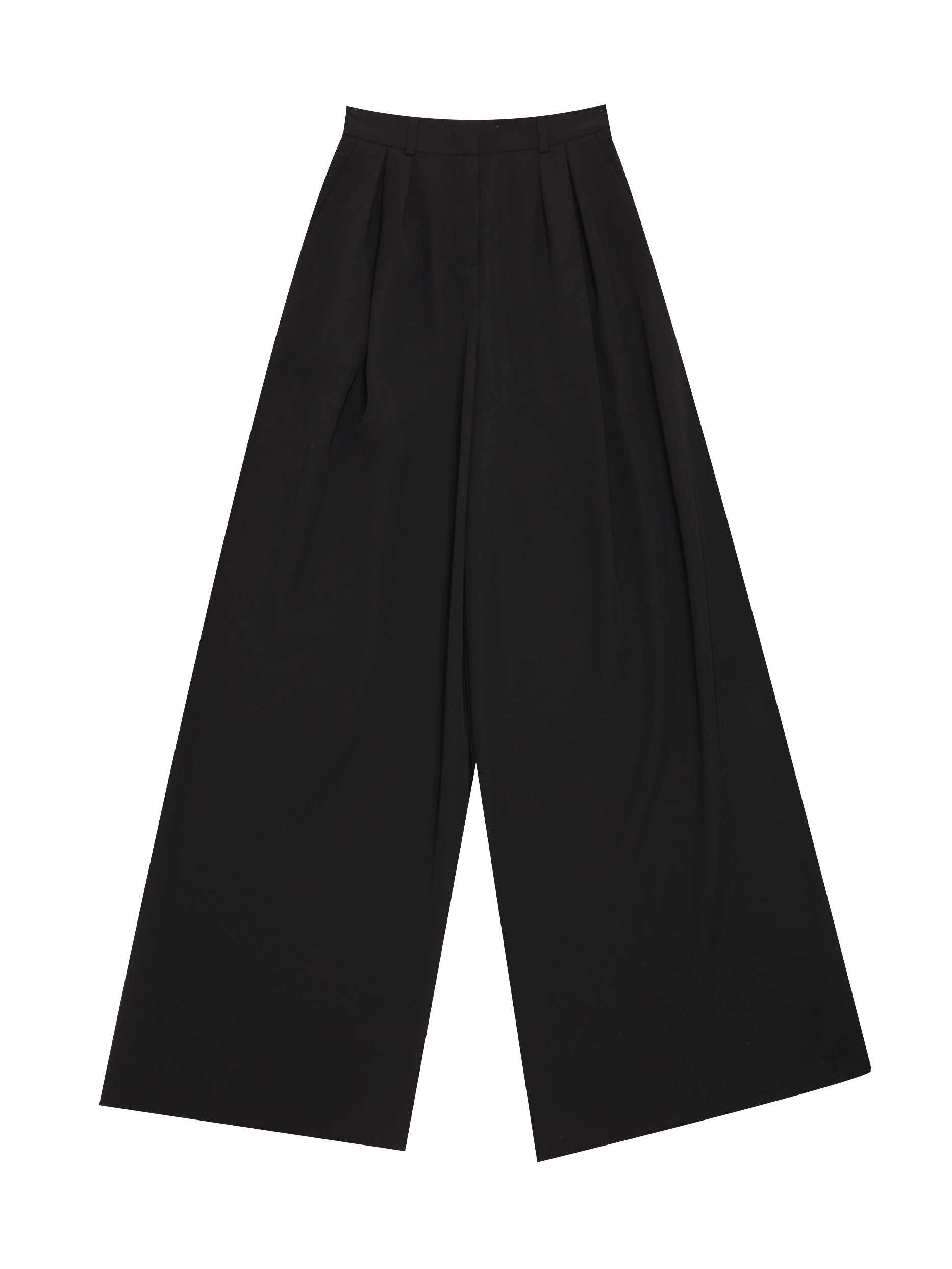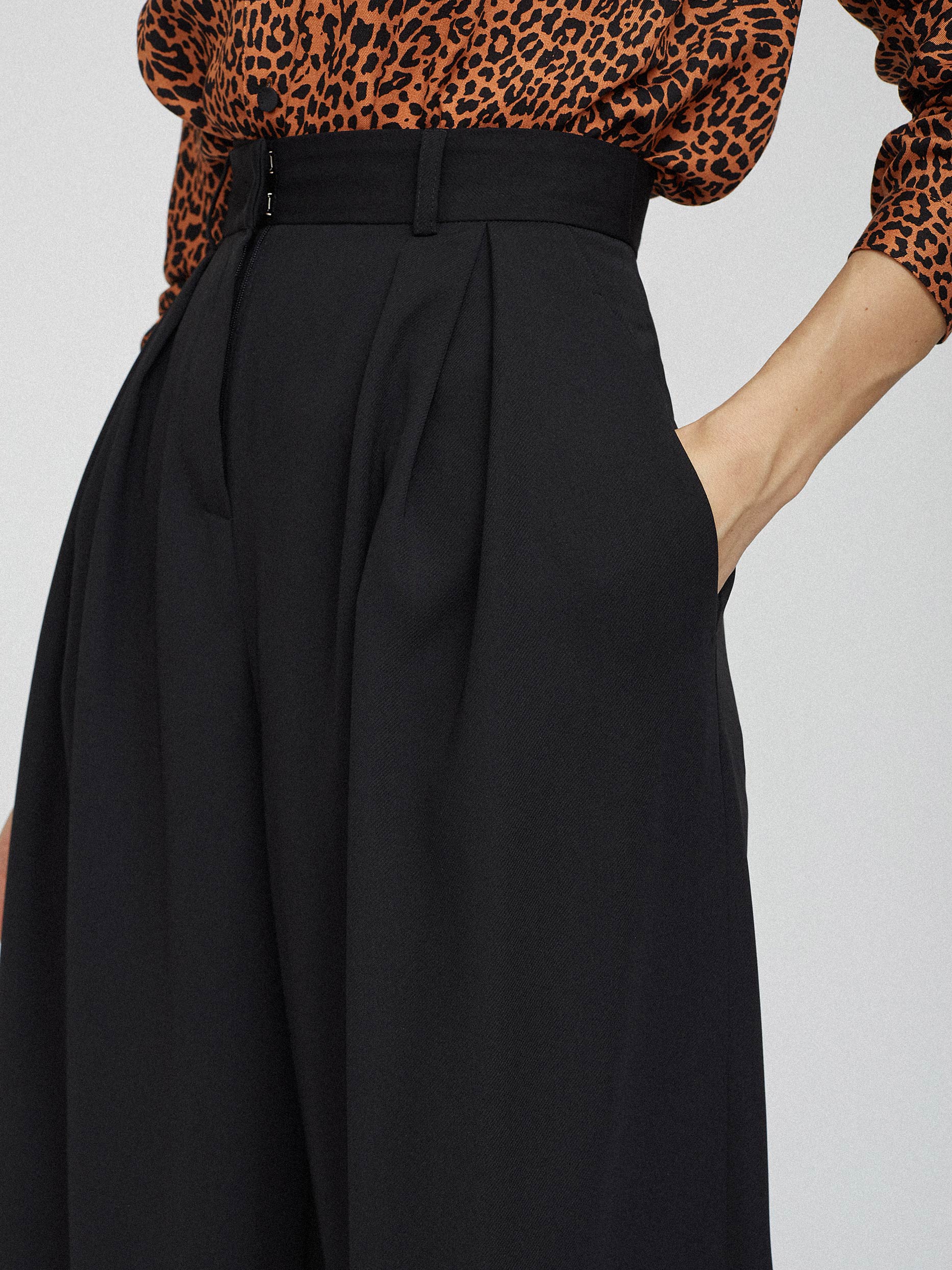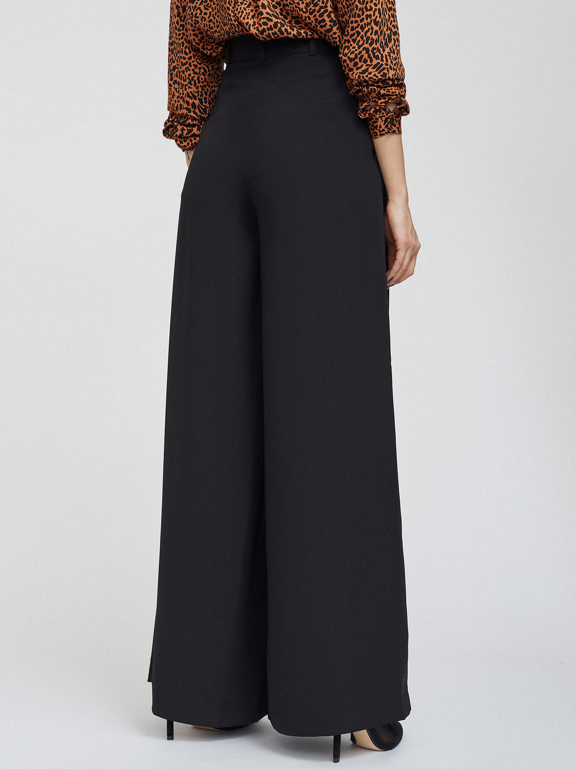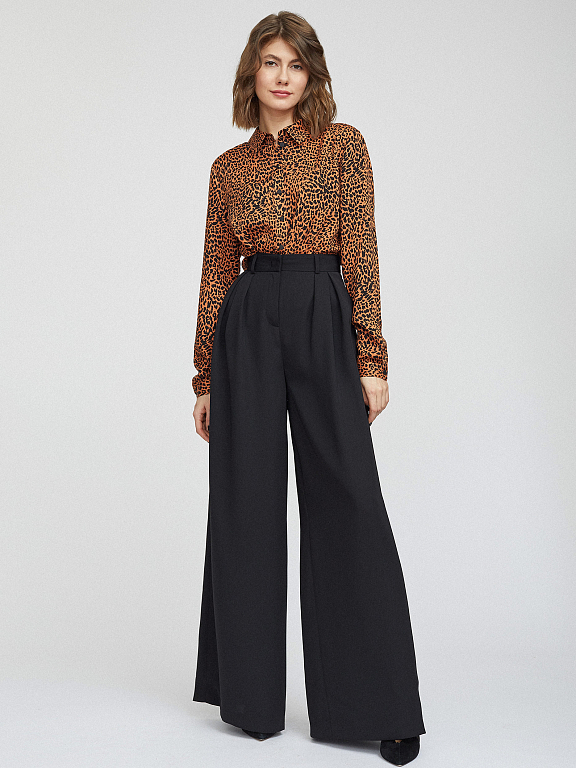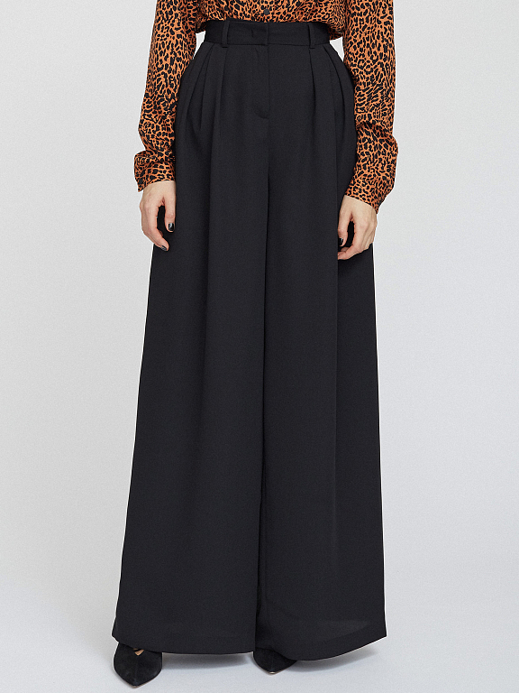 Широкие брюки струящегося кроя. Высокая посадка, защипы, прорезные карманы по бокам, вытачки сзади.