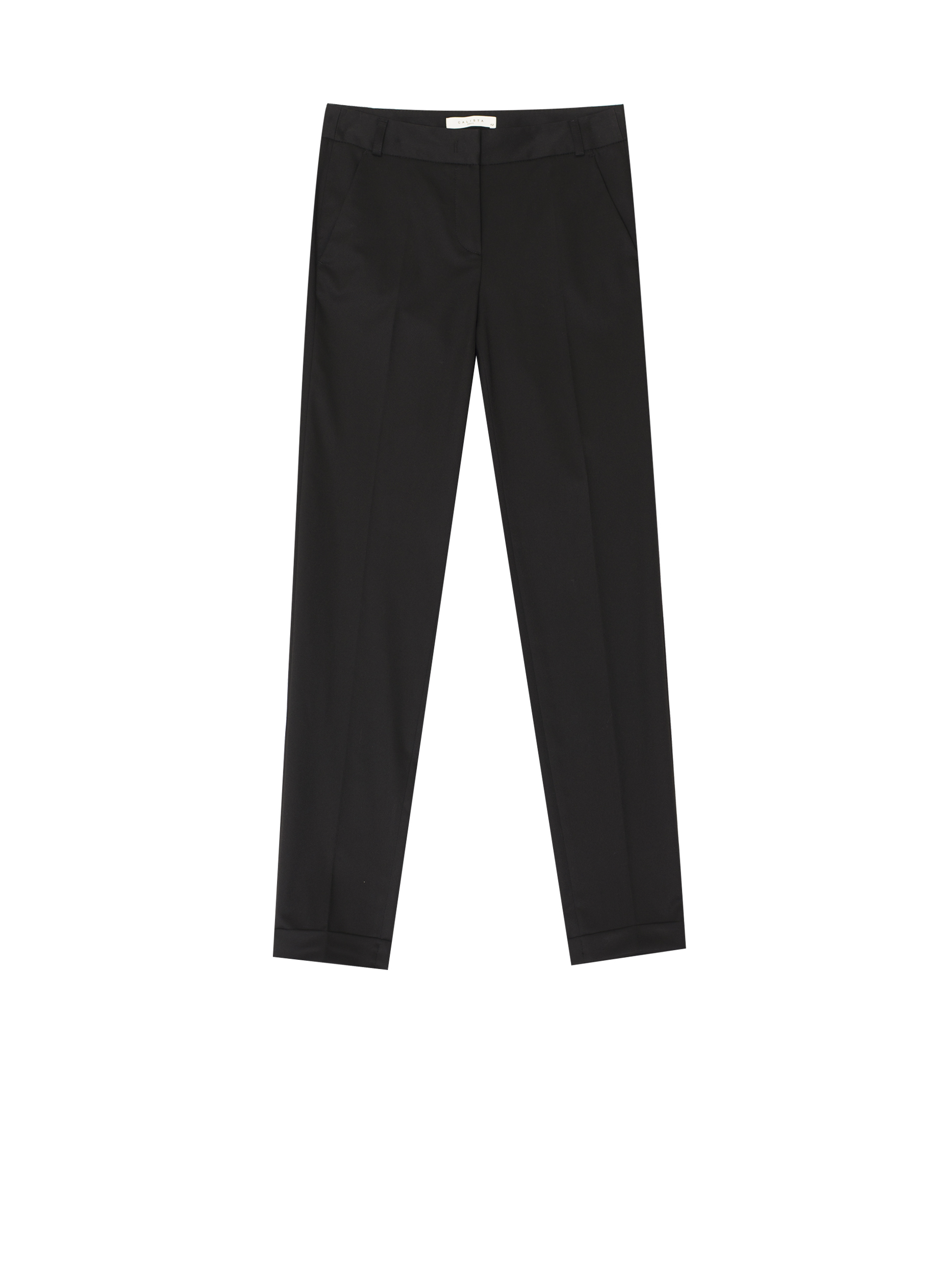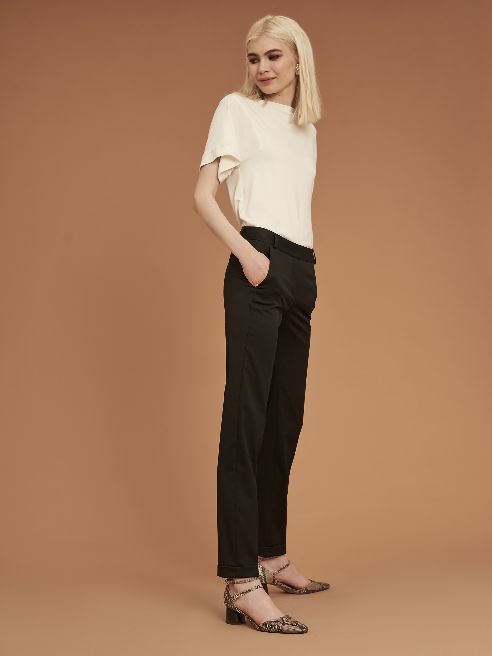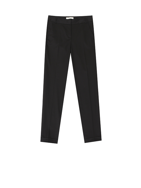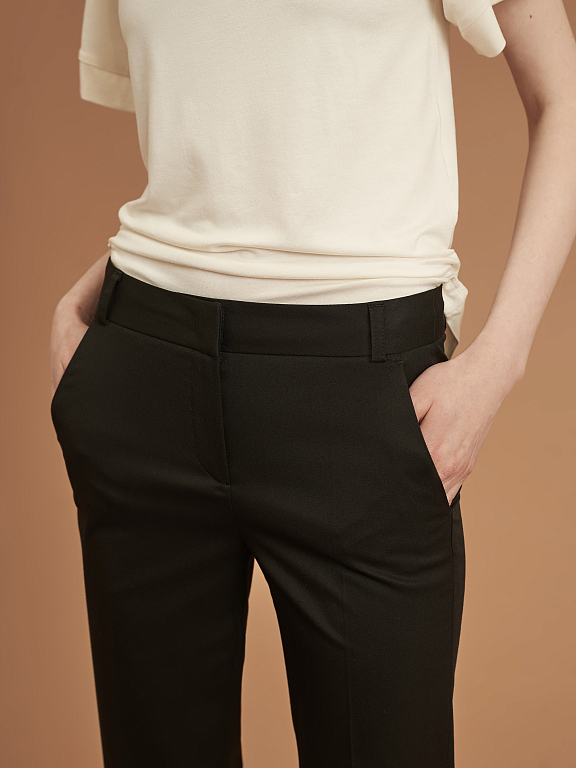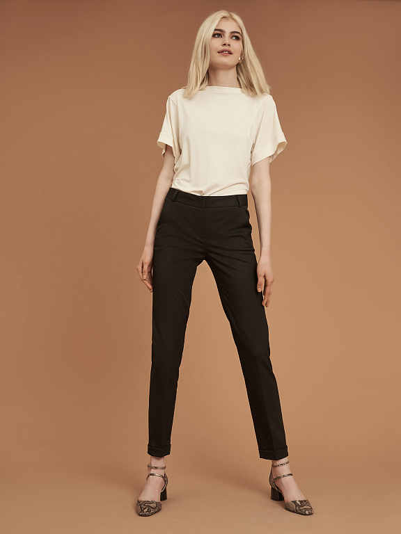 Брюки зауженного кроя, выполненные из смесовой вискозы. Средняя посадка, втачной пояс, прорезные карманы по бокам, декоративный карман сзади, отвороты по нижнему краю.