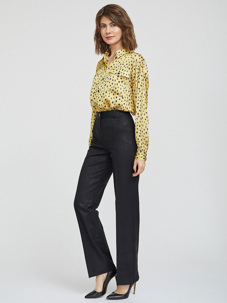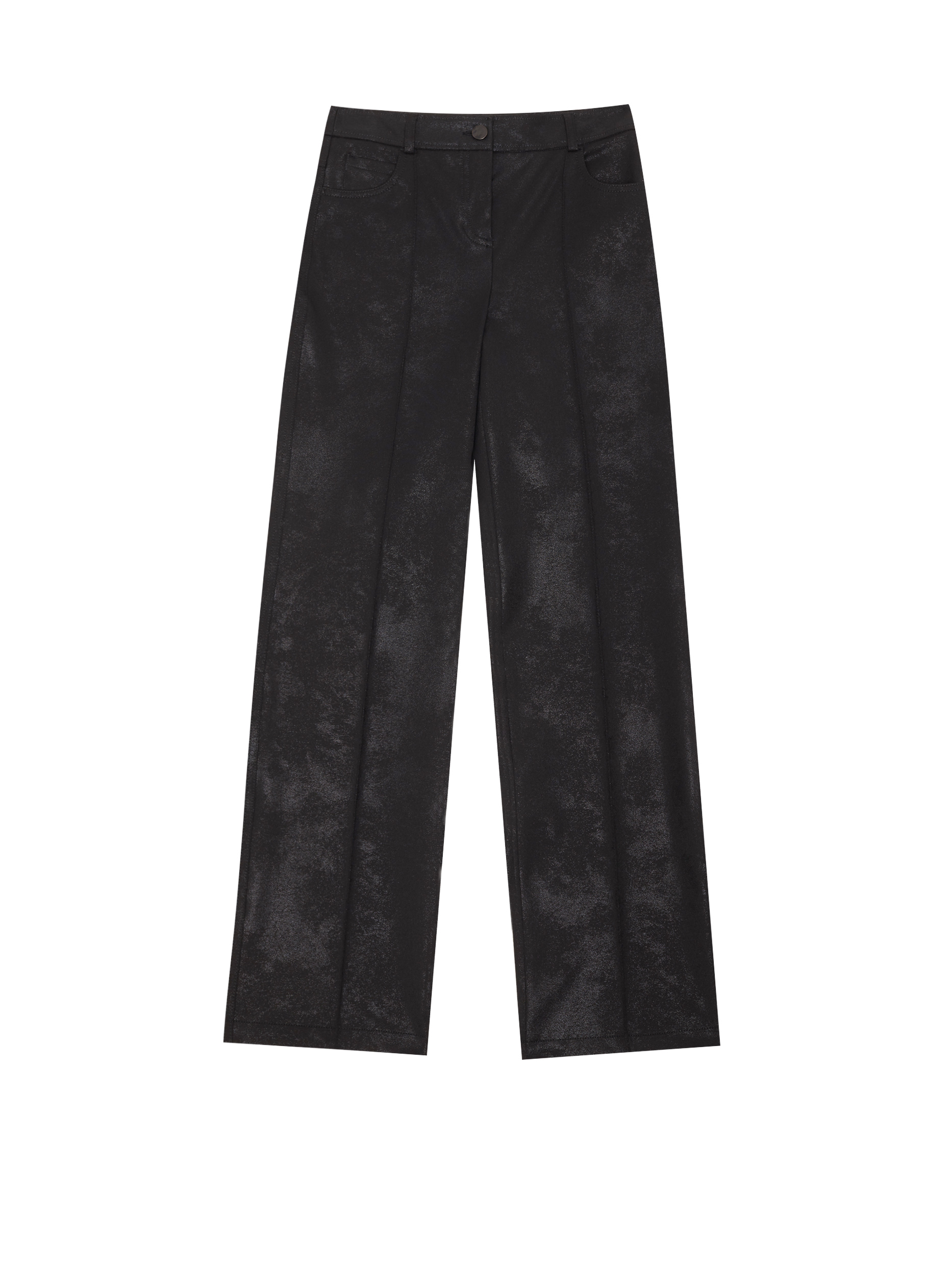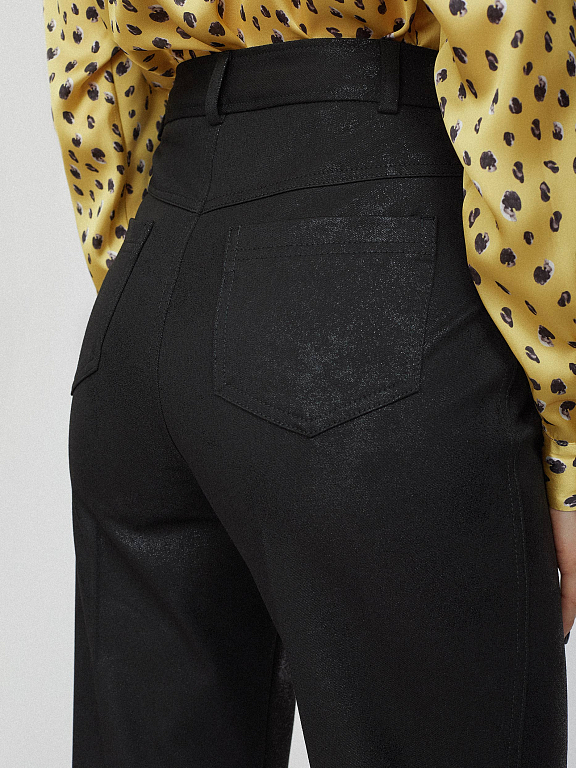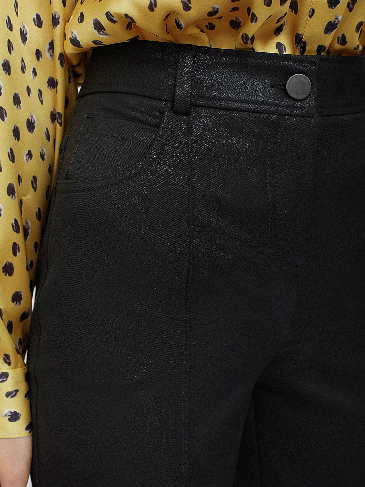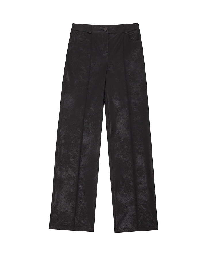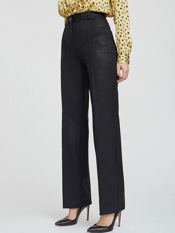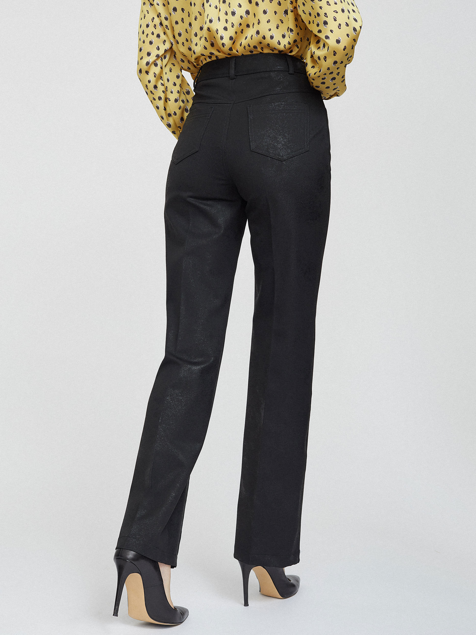 Брюки прямого кроя с мерцающим эффектом. Высокая посадка, втачной пояс, прорезные карманы по бокам, накладные карманы сзади.