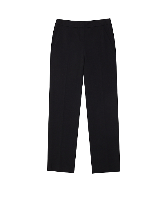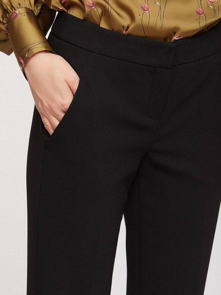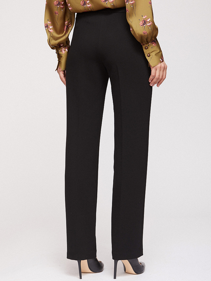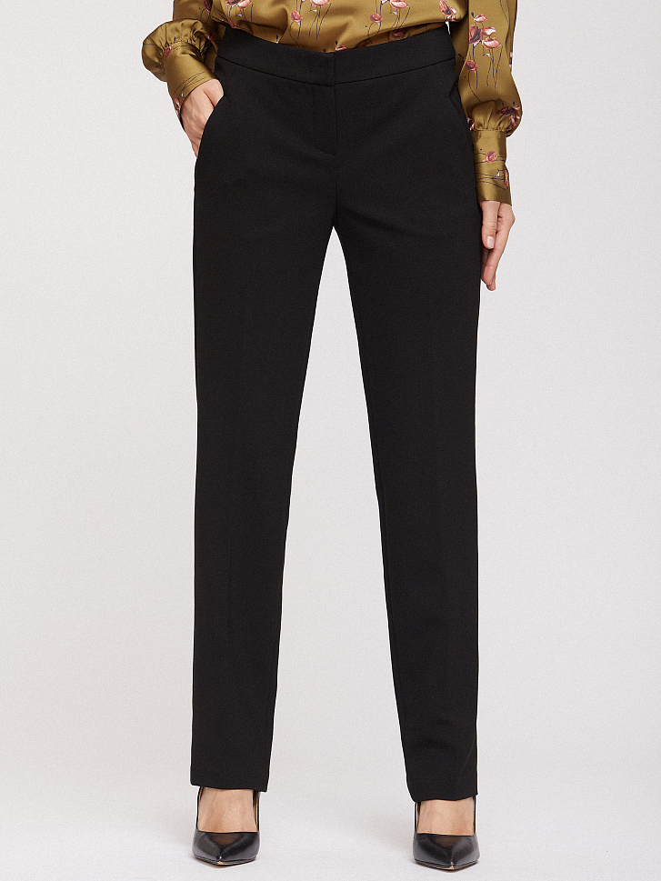 Брюки прямого кроя, выполненные из мягкой смесовой вискозы. Высокая посадка, заглаженные стрелки, прорезные карманы по бокам.