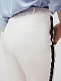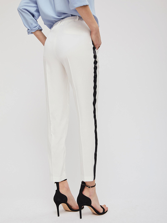 Укороченные брюки зауженного кроя со стрелками. Средняя посадка, втачной эластичный пояс, прорезные карманы по бокам, декоративный карман сзади.