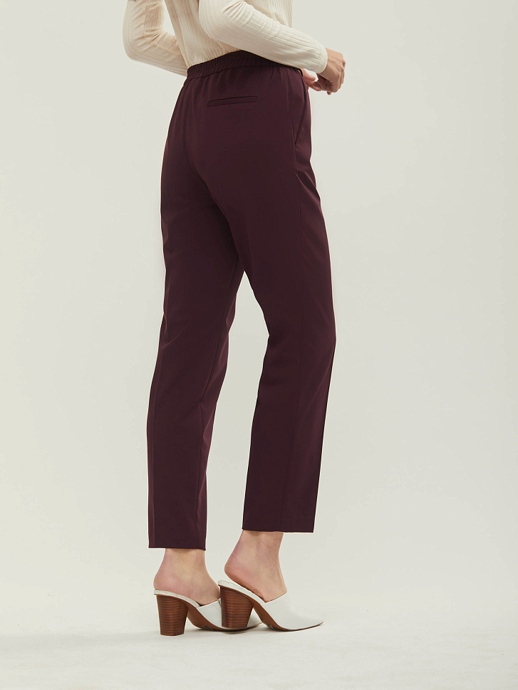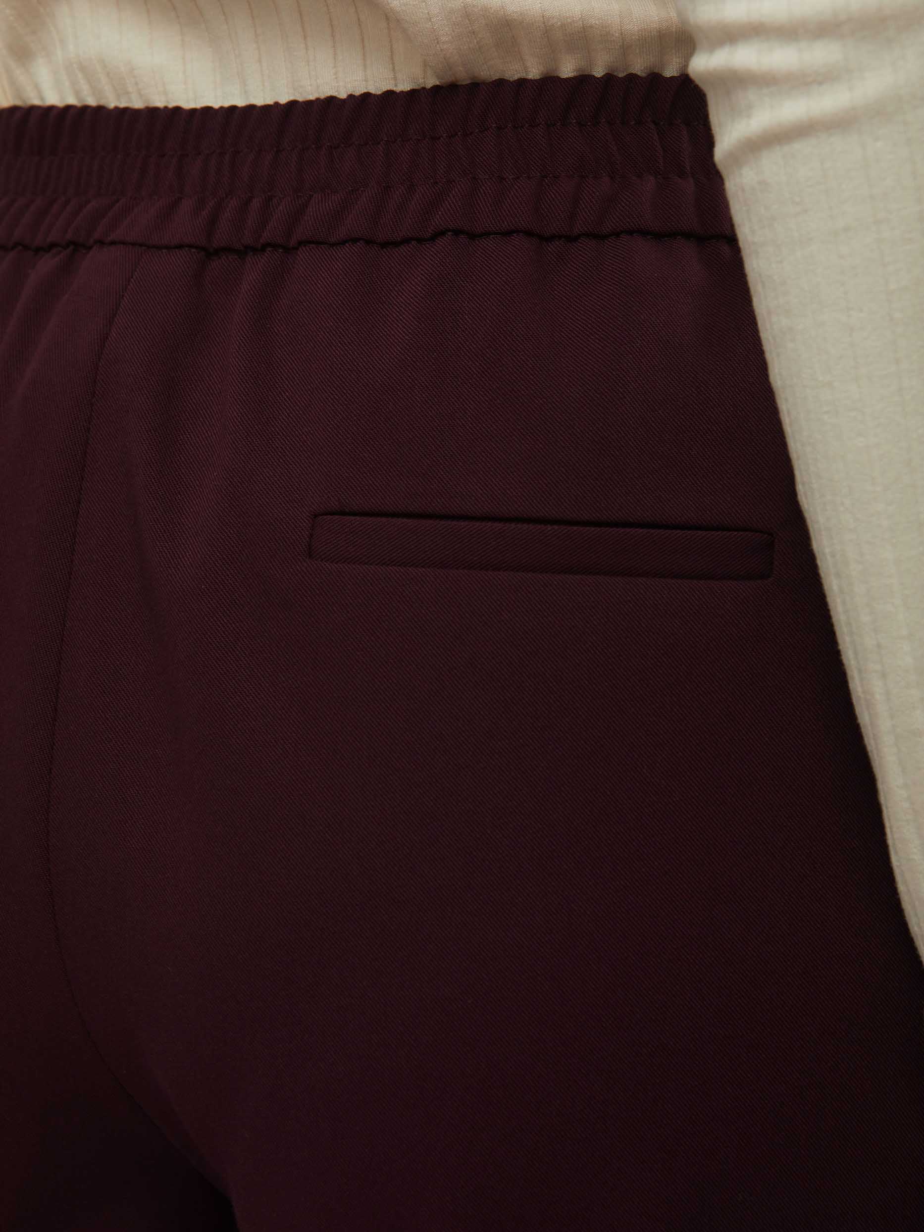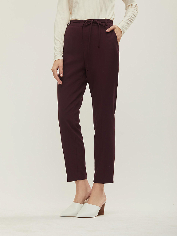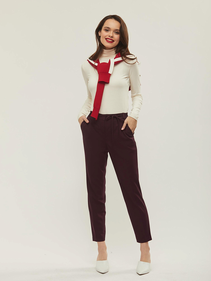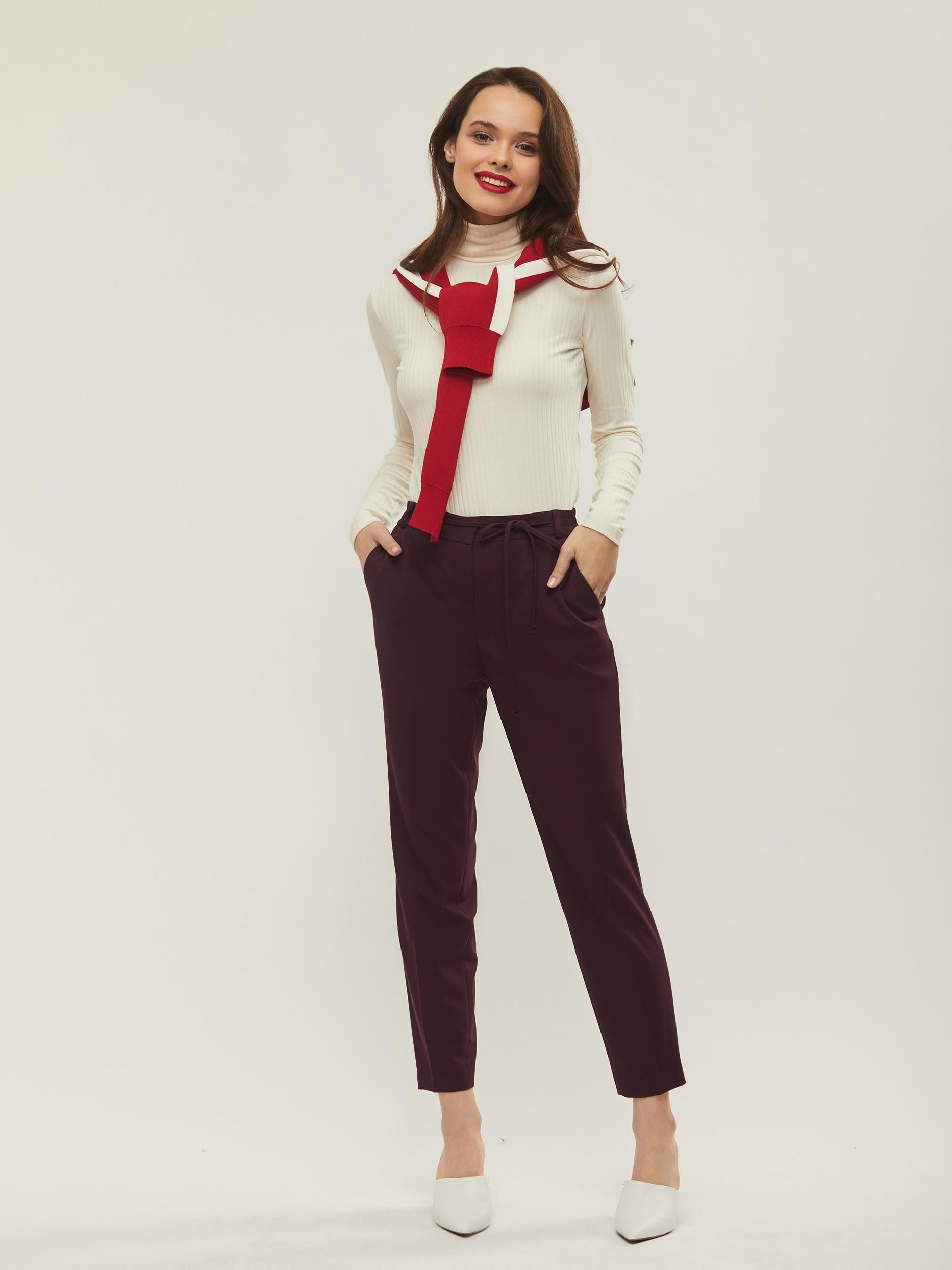 Укороченные брюки средней посадки из поливискозы. Изделие с заглаженными стрелками, боковыми карманами и тонким поясом на бант. Сзади ложный прорезной карман с листочкой. Застёжка на крючоки и молнию. Изделие без подкладки. Рост модели 173 см, размер 42 (российский). Плотность ткани: 250 г/м2