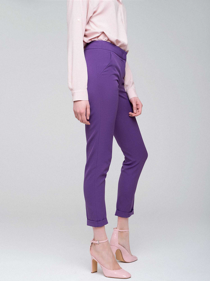 Укороченные брюки зауженного кроя. Высокая посадка, втачной пояс, отвороты. По бокам прорезные карманы, сзади – декоративные.