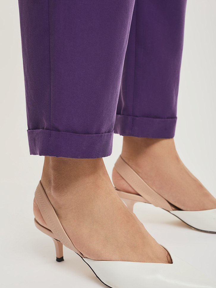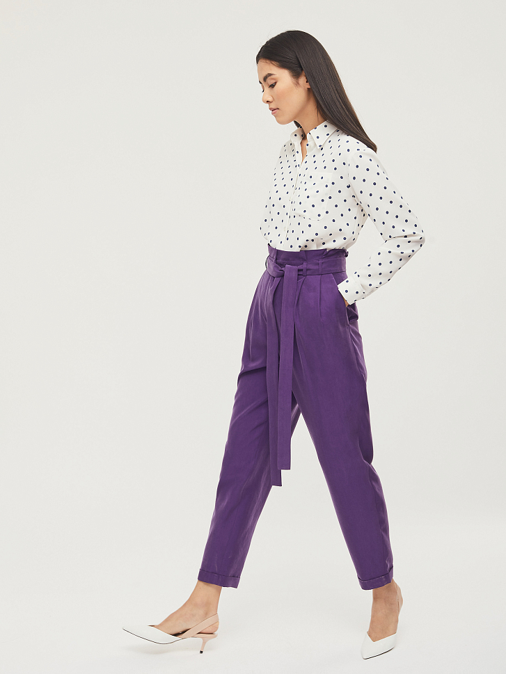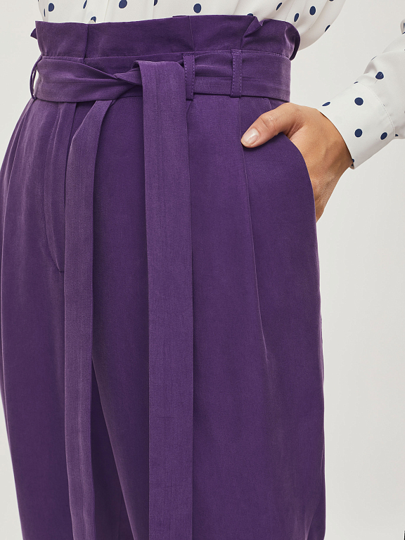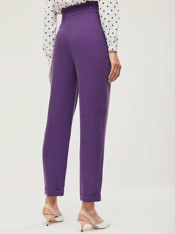 Укороченные брюки зауженного кроя. Высокая посадка, прорезные карманы по бокам, отвороты по нижнему краю. В комплекте пояс-хомут в тон.