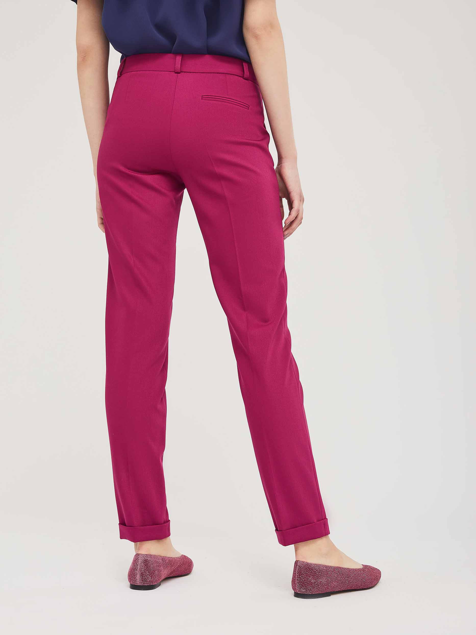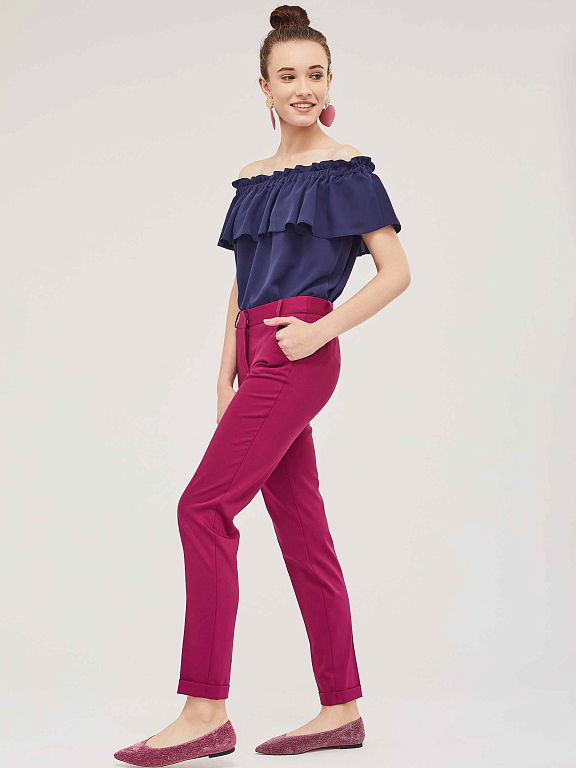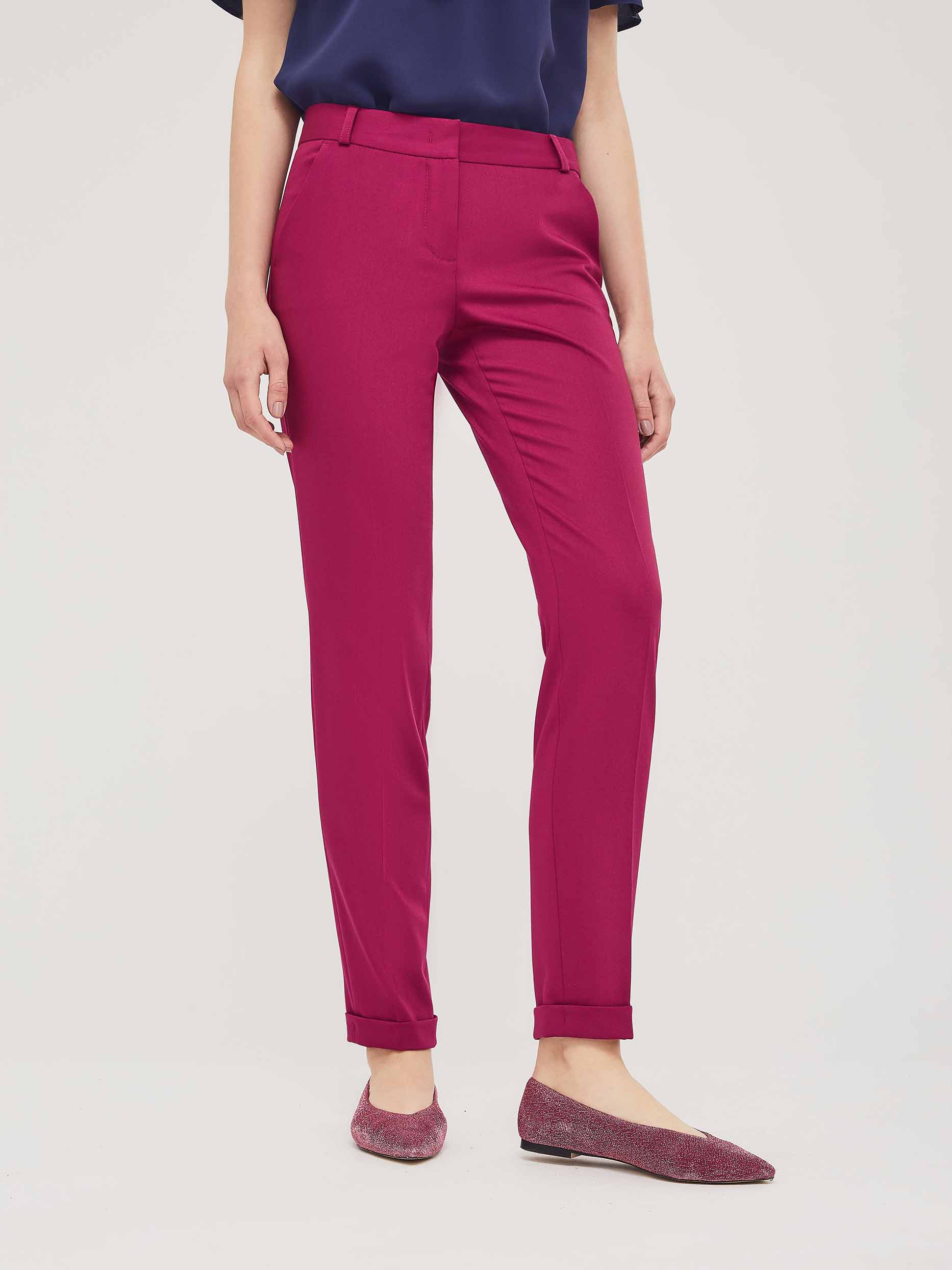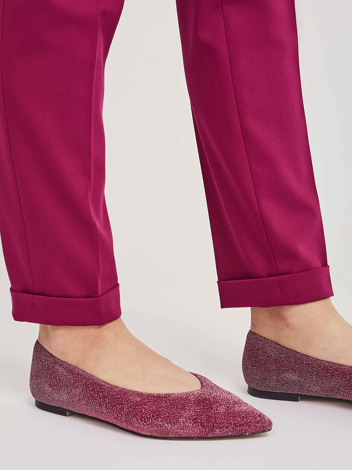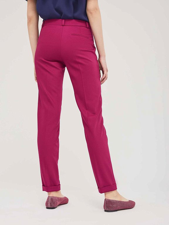Брюки средней посадки из поливискозы. Изделие с боковыми карманами и отворотами снизу. Модель застегивается на крючки и молнию. На поясе есть шлёвки для ремня. Сзади ложный прорезной карман в рамку.  Изделие без подкладки.  Рост модели 173 см, размер 42 (российский)